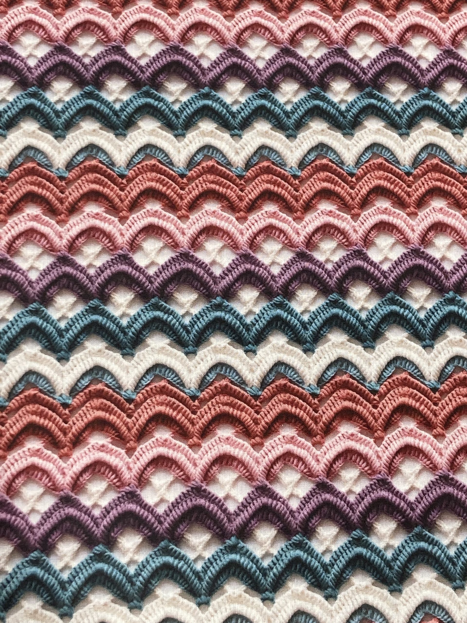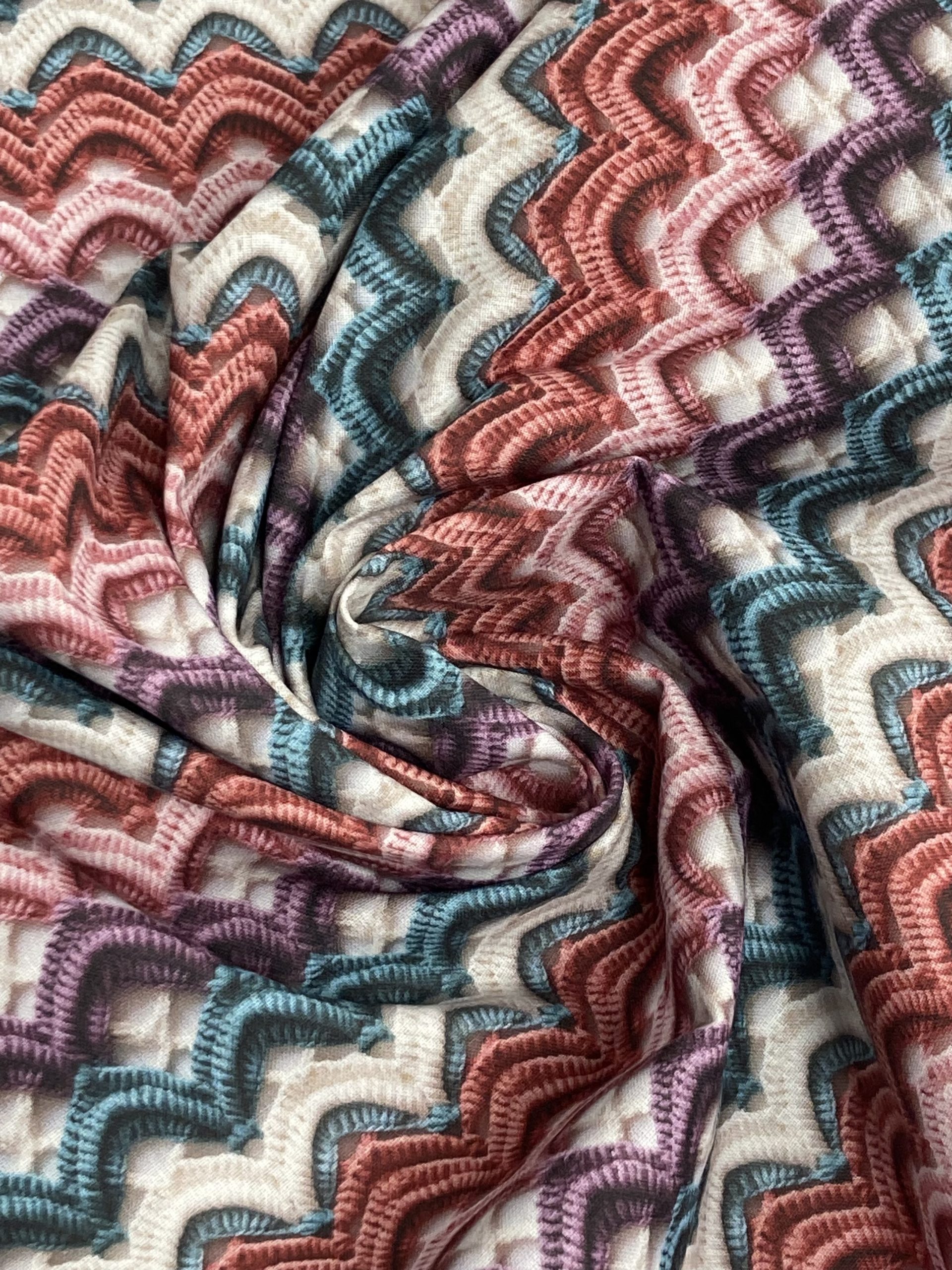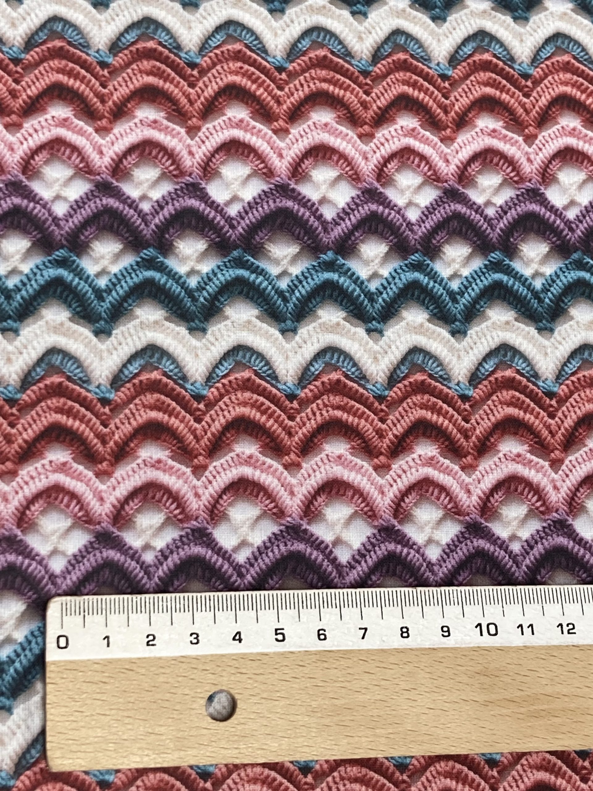 Algodón 3D crochet ondas es una tela con estampado en 3D que imita al ganchillo formando ondas en colores azul empolvado, maquillaje, crudo y morado.