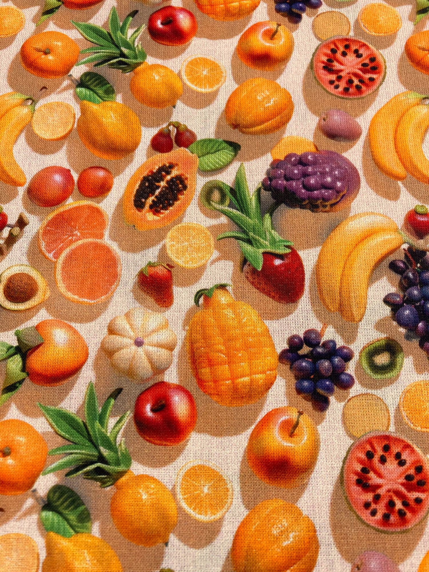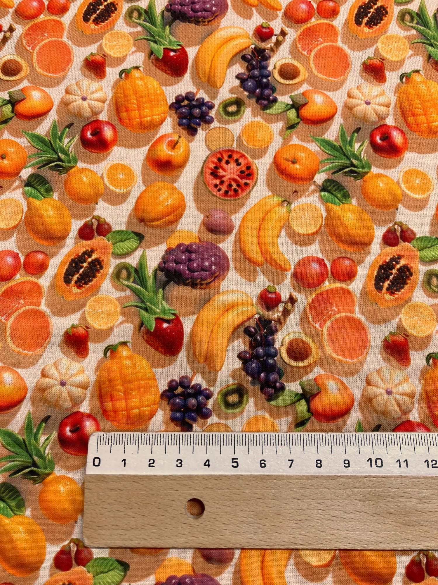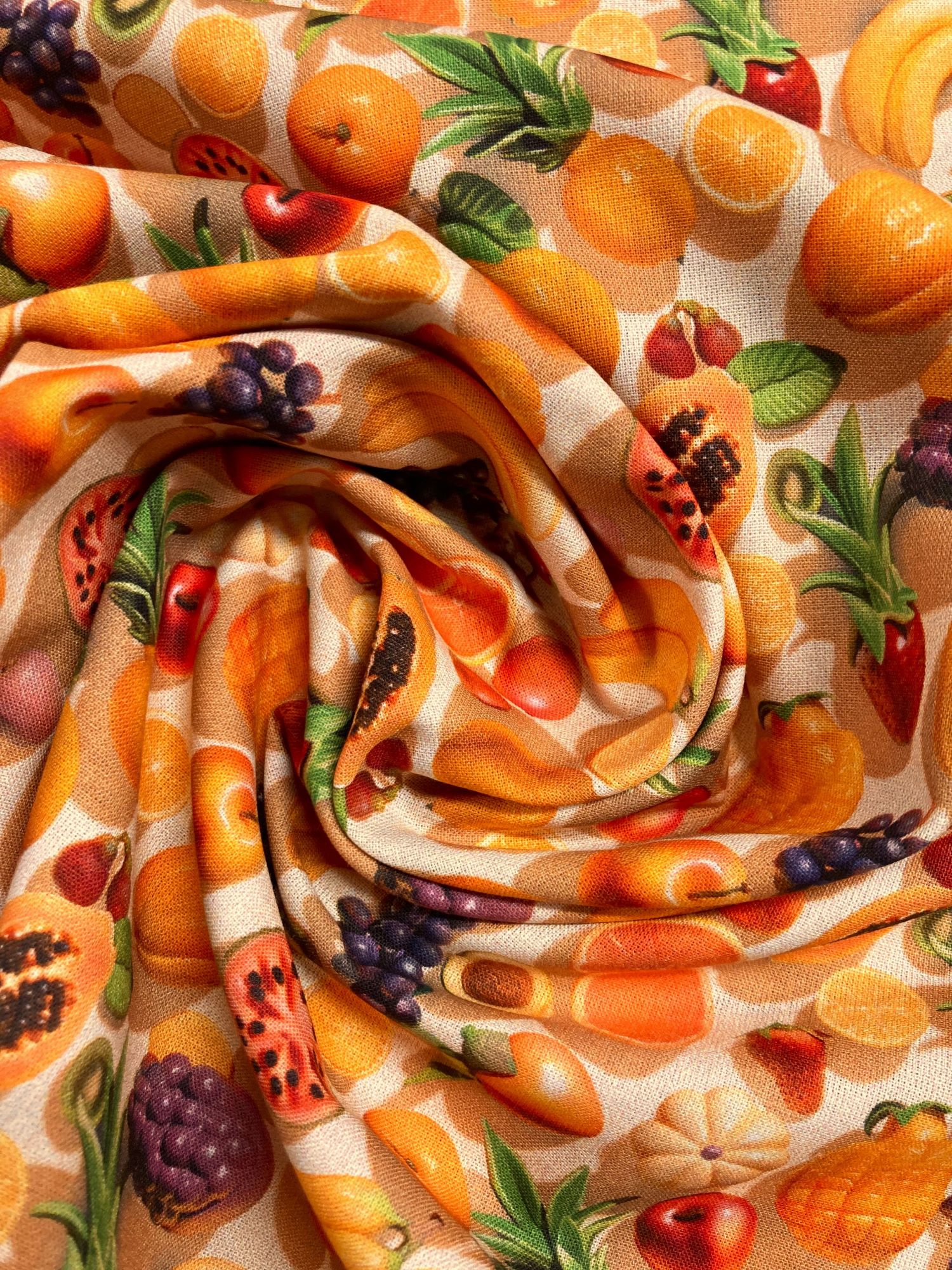 Algodón 3D Fruits, es un estampado de frutas en tonos naranjas, verdes y frambuesa sobre fondo salmón clarito