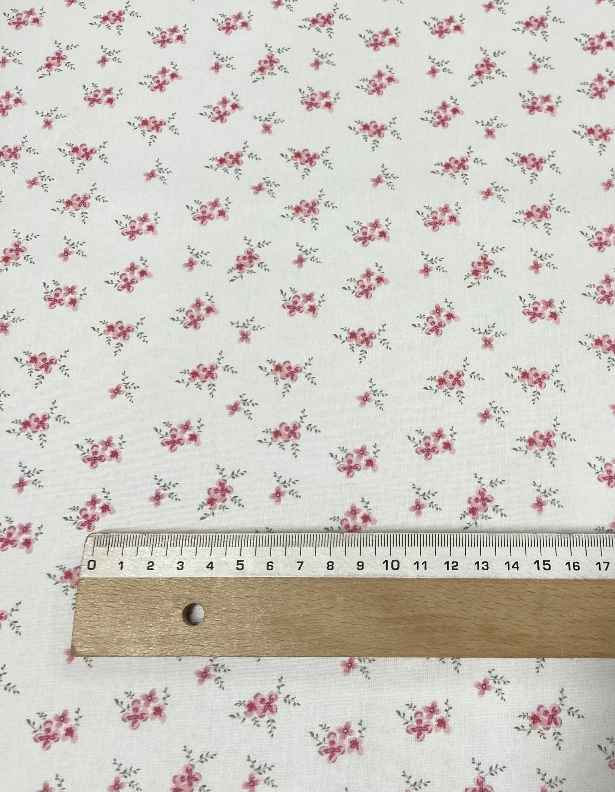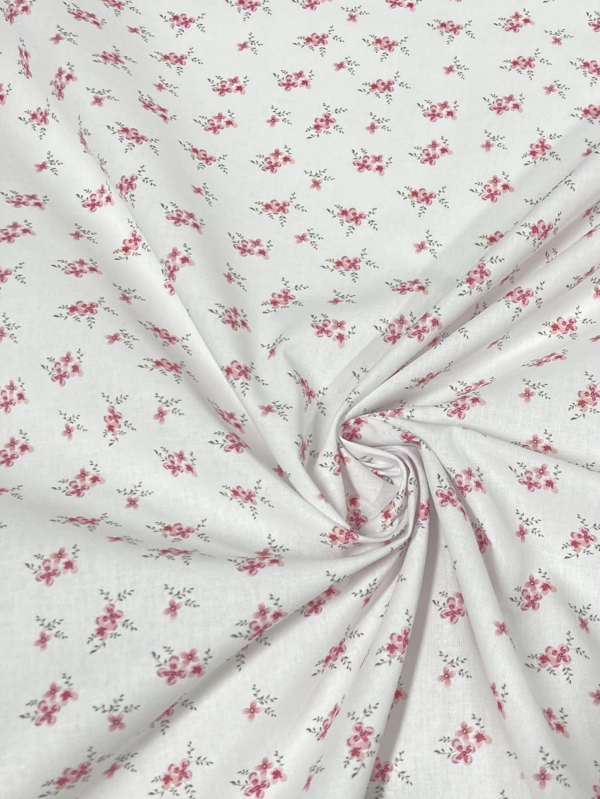 Algodón Amelia, es un estampado de florecitas en tono rosa, verde..... sobre fondo blanco