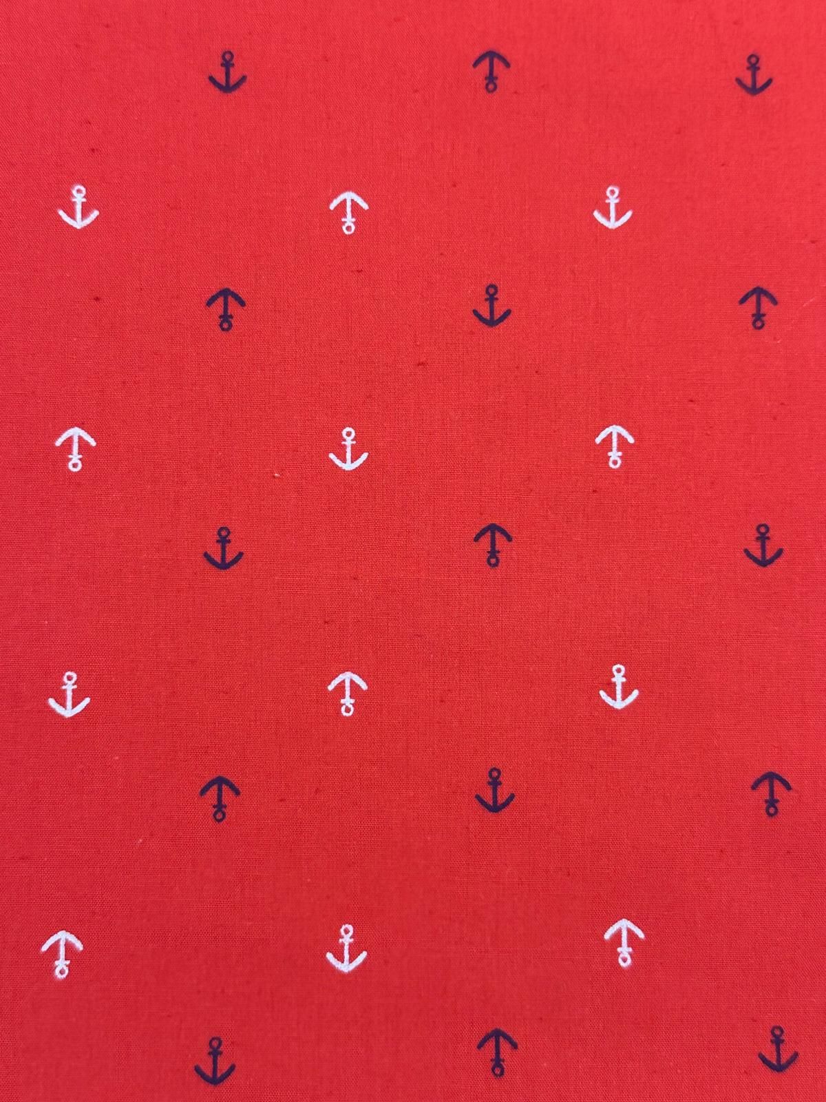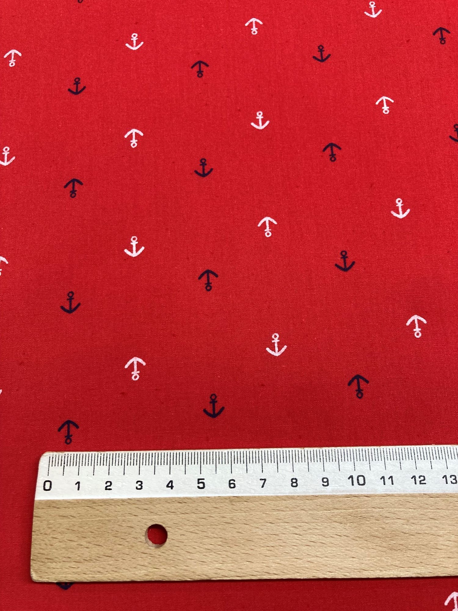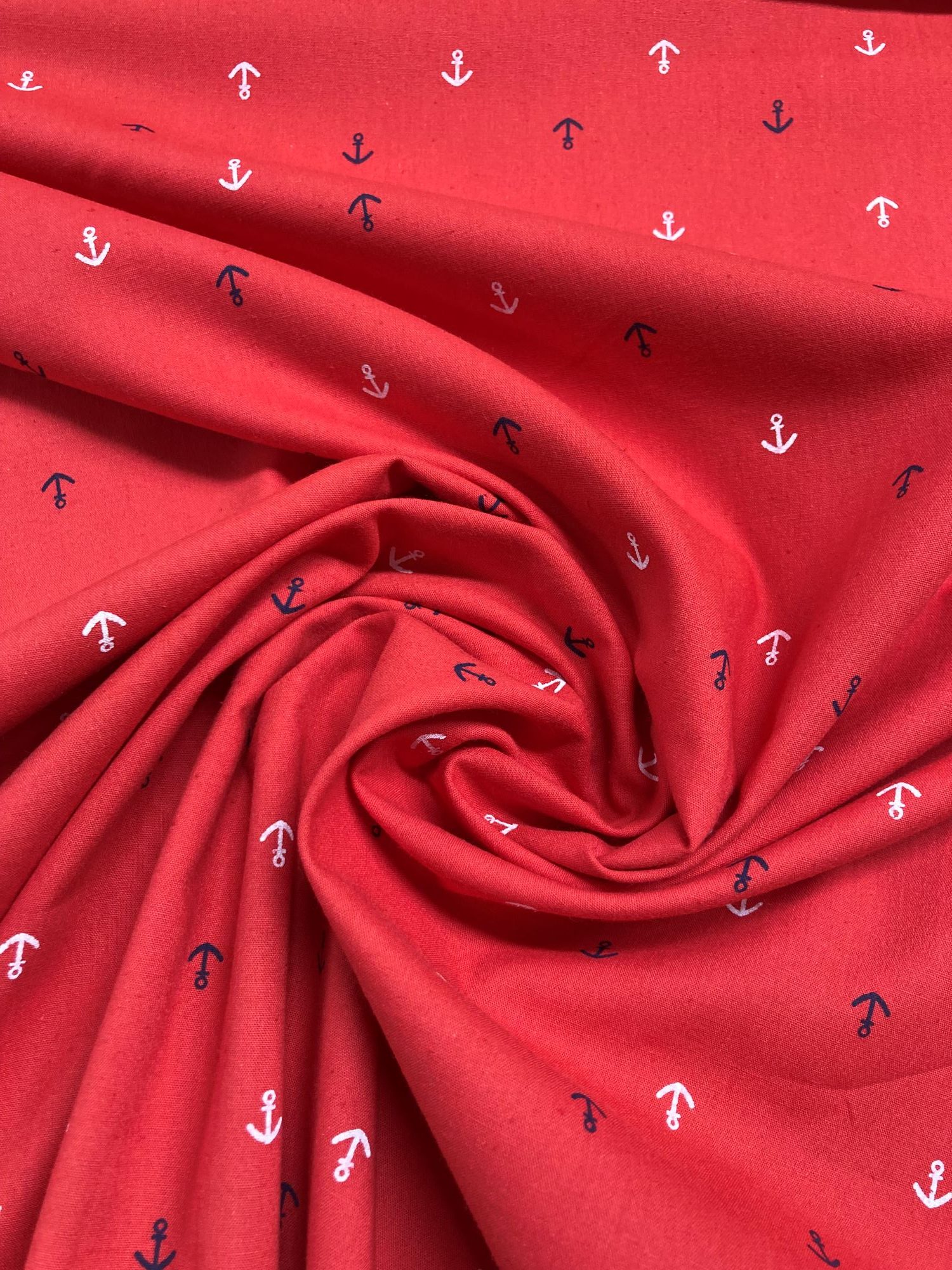 Algodón anclas Raw rojo es una tela de algodón con fondo rojo y anclas pequeñas en color marino y blanco.