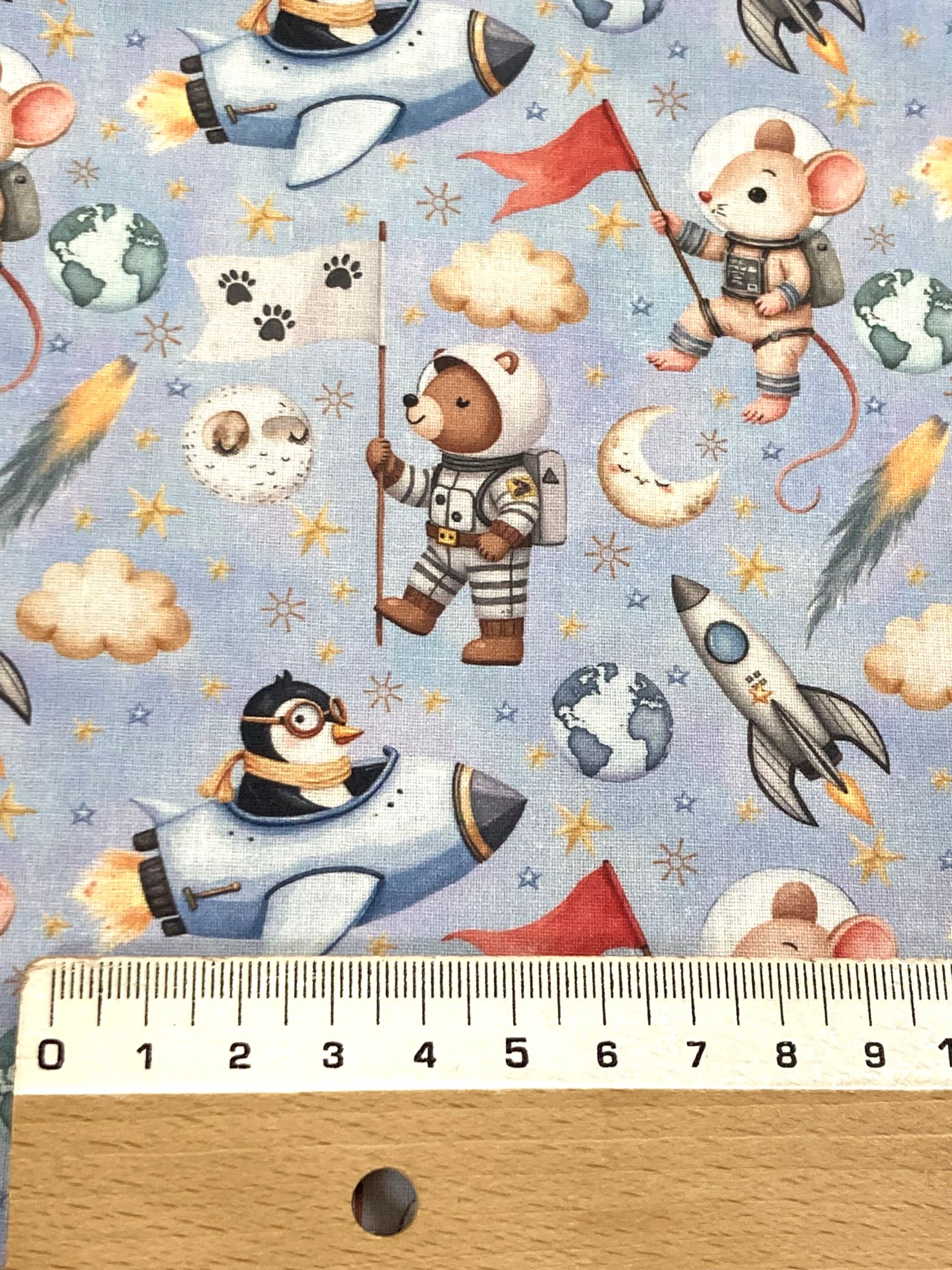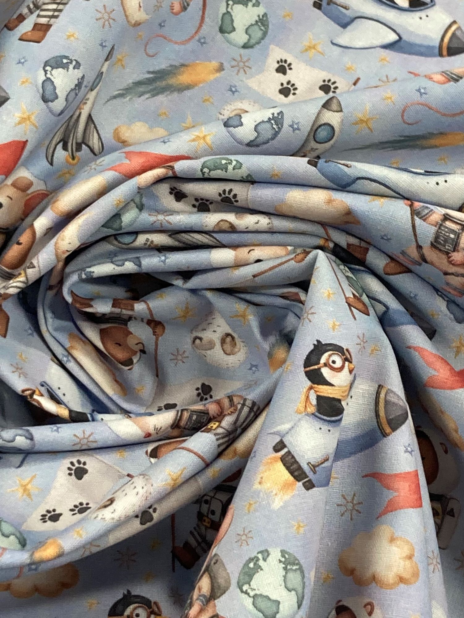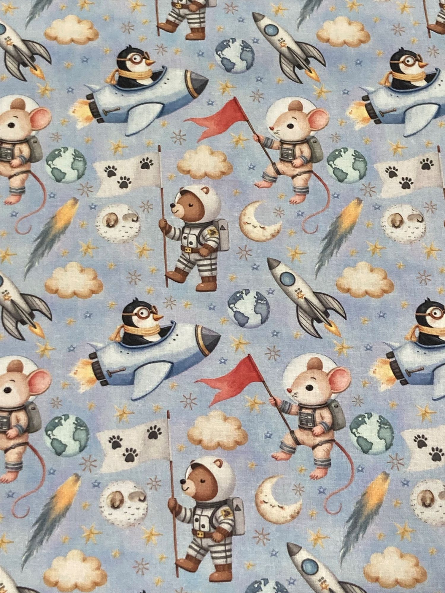 Algodón animales astronautas , es un estampado de osos, ratones y pingüinos astronautas sobre fondo celeste