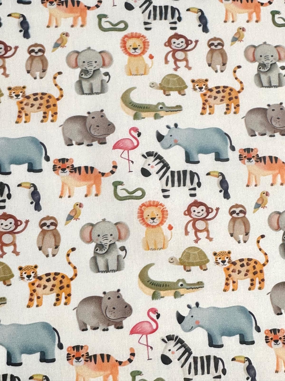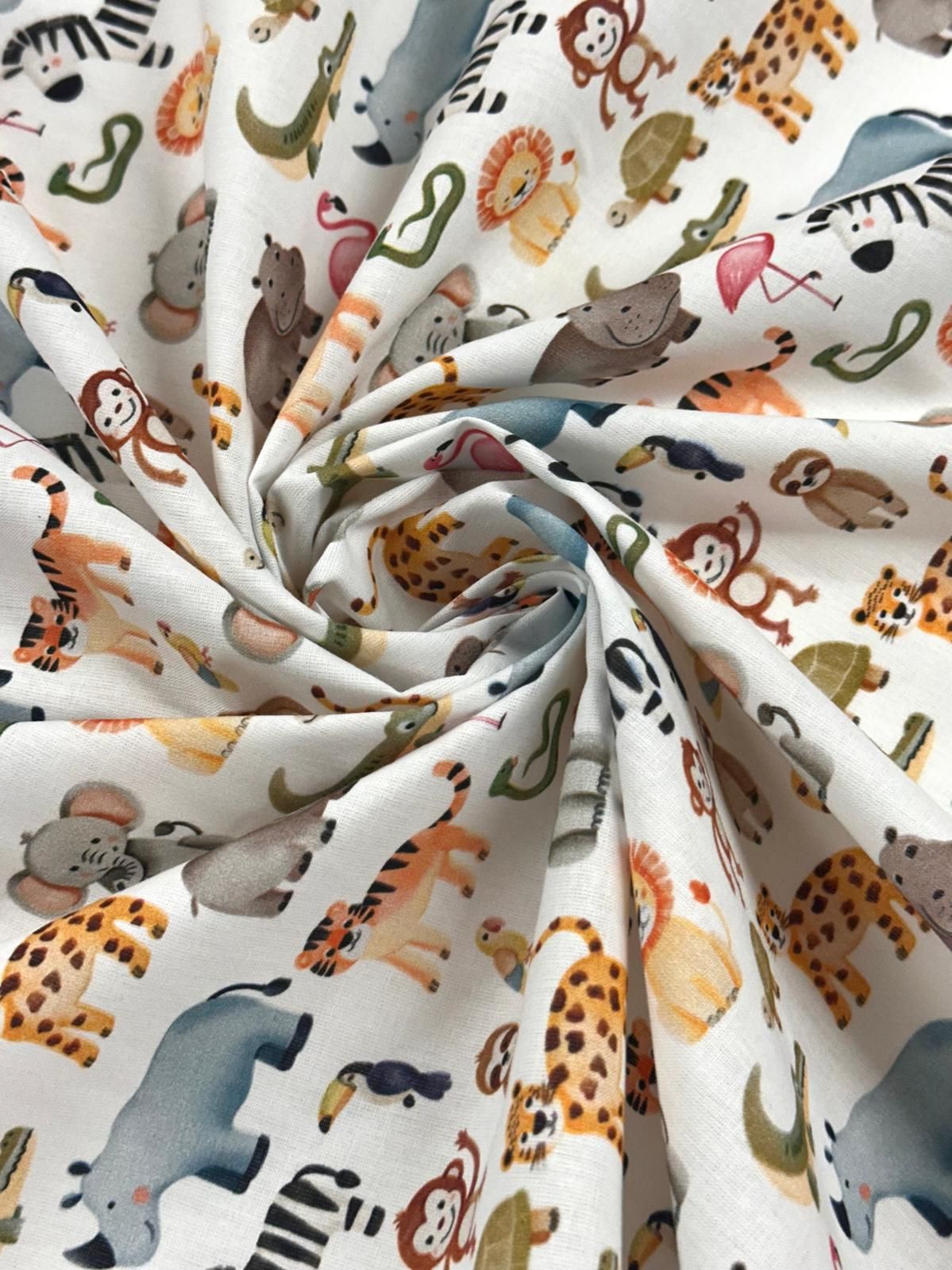 Algodón Animalia Zoo, es un estampado de animales en varios colores sobre fondo blanco