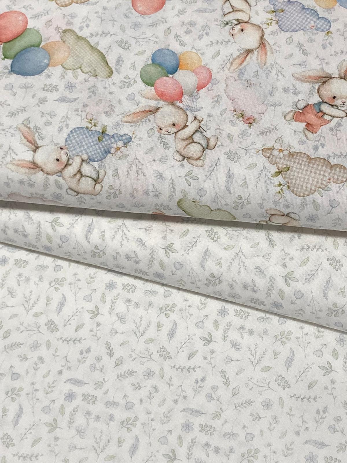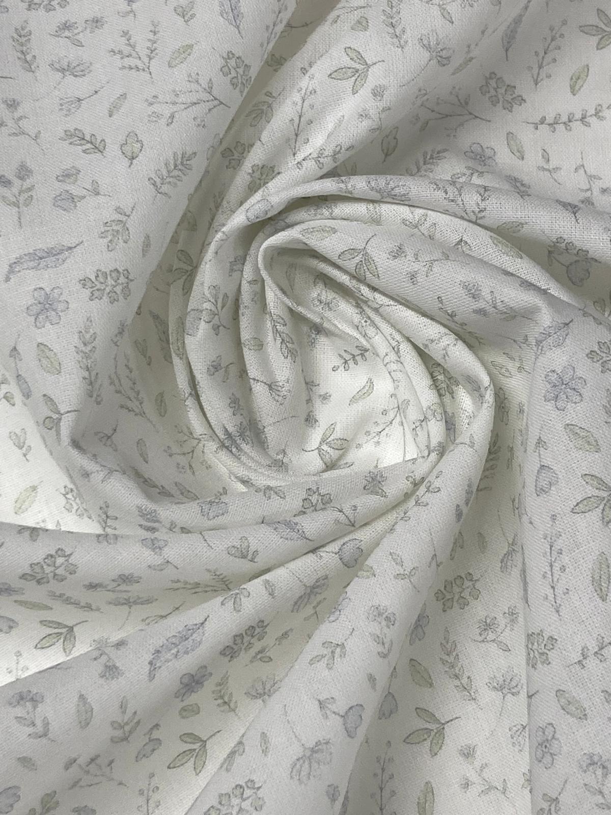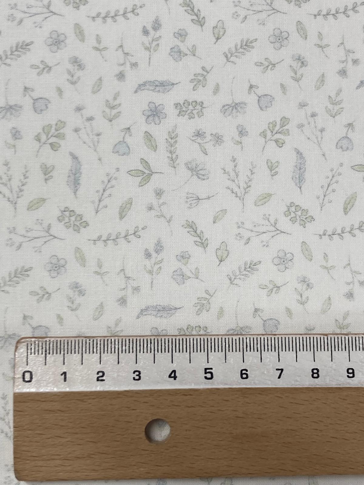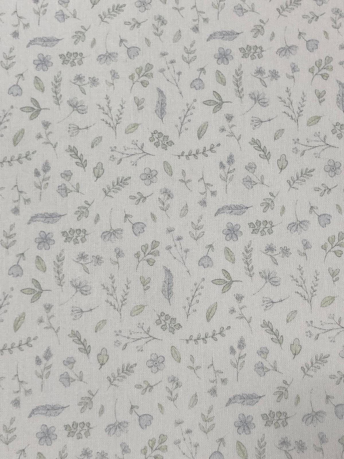 Algodón baby flor celeste , es un estampado de florecitas y hojas en tonos verde pastel y celeste pastel sobre fondo blanco.