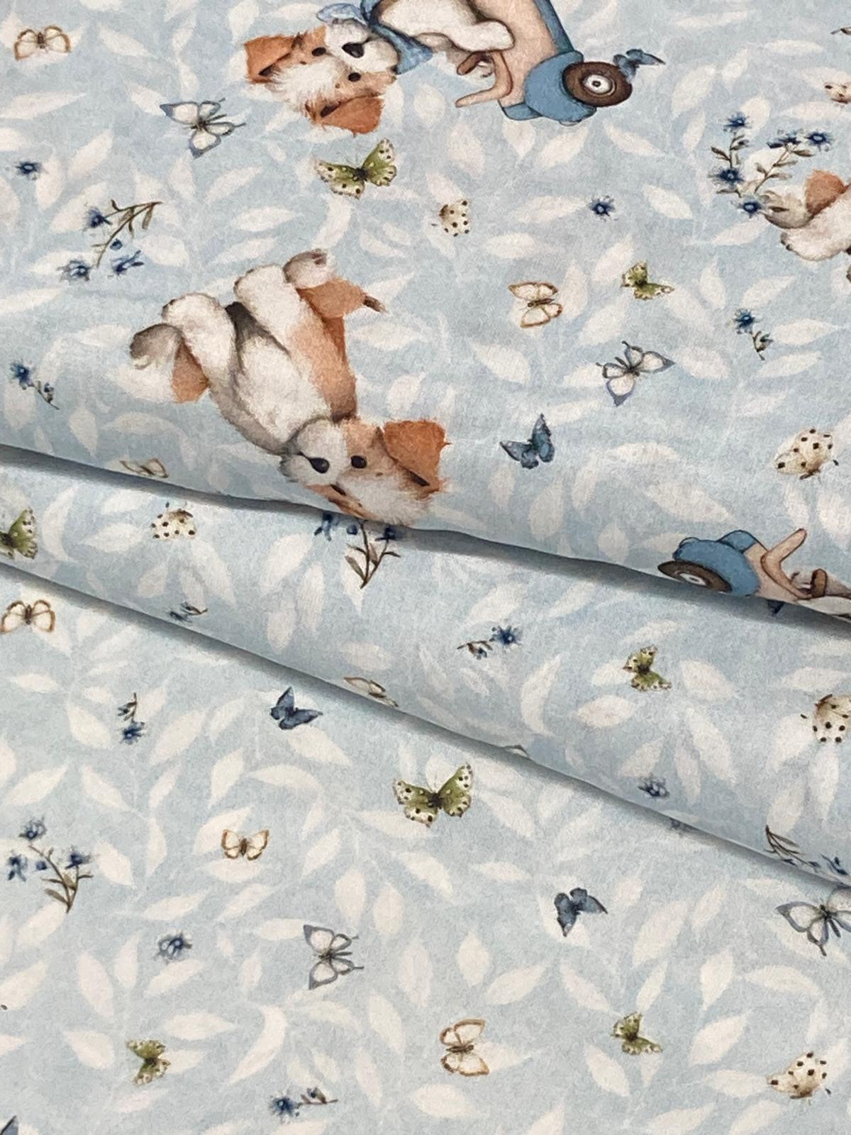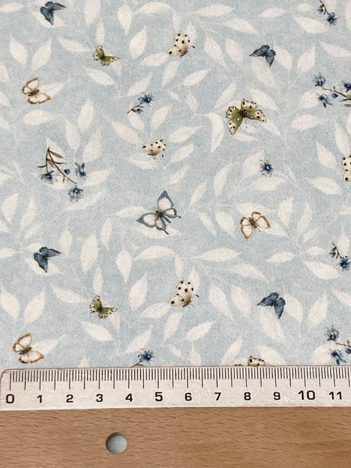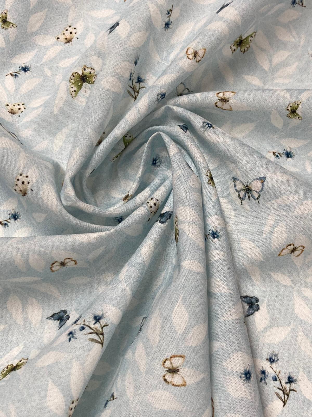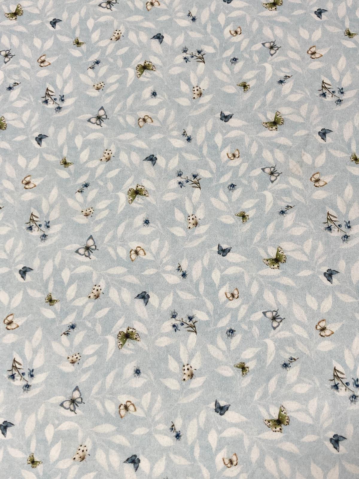 Algodón baby mariposas , es un estampado de mariposas pequeñitas en varios colores sobre fondo celeste con hojitas blancas.