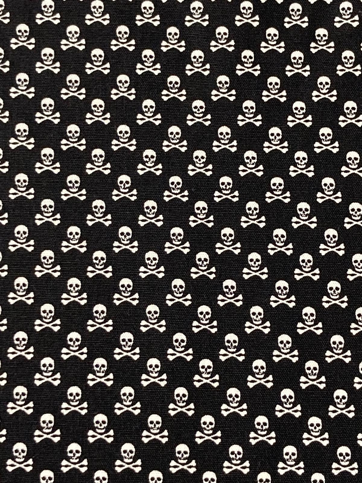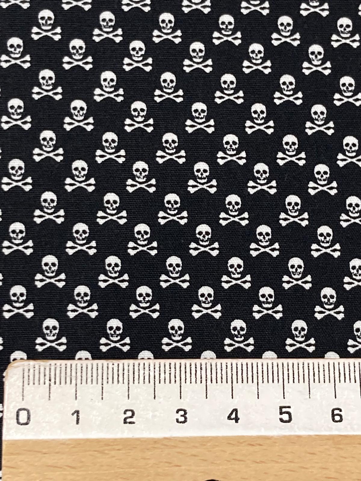 Algodón Calaveras mini negro es una tela de algodón con fondo negro y calaveras pequeñitas en color blanco