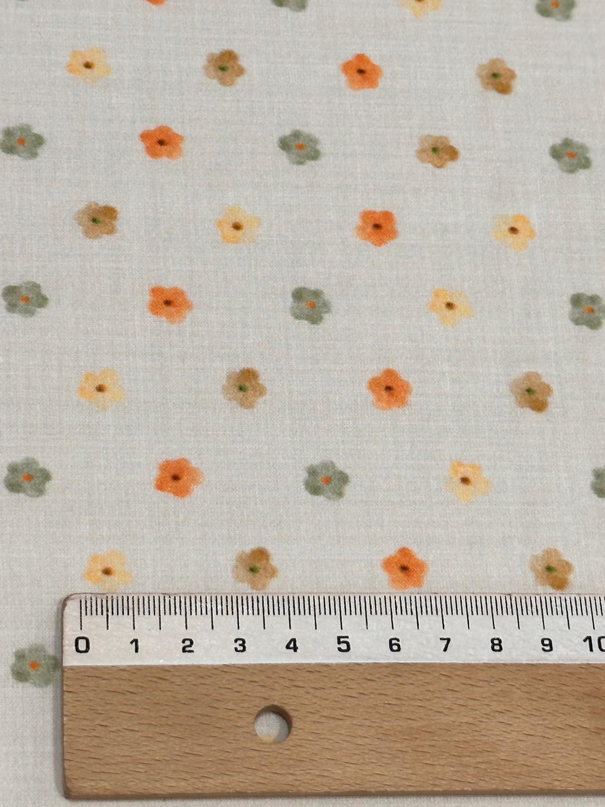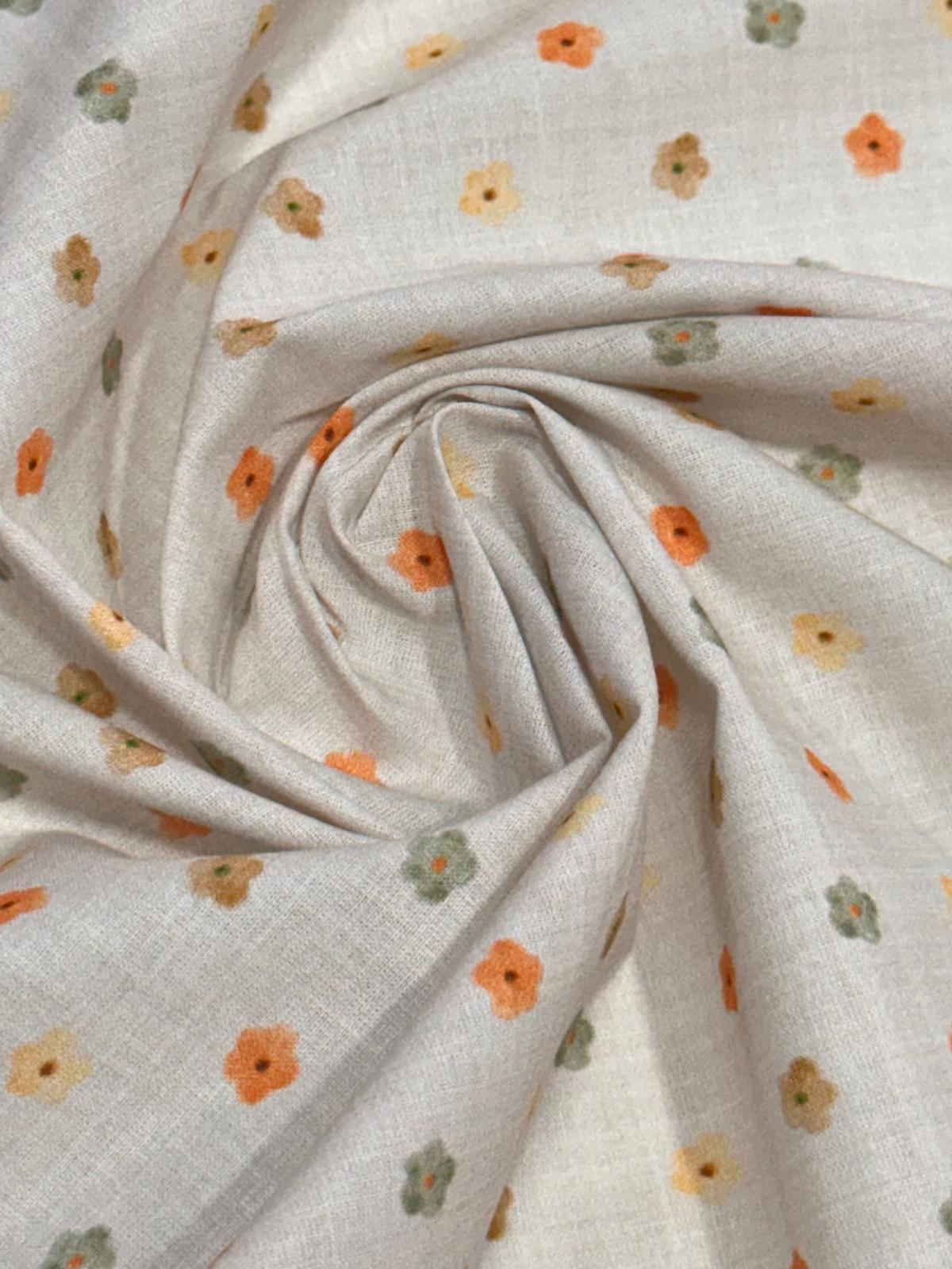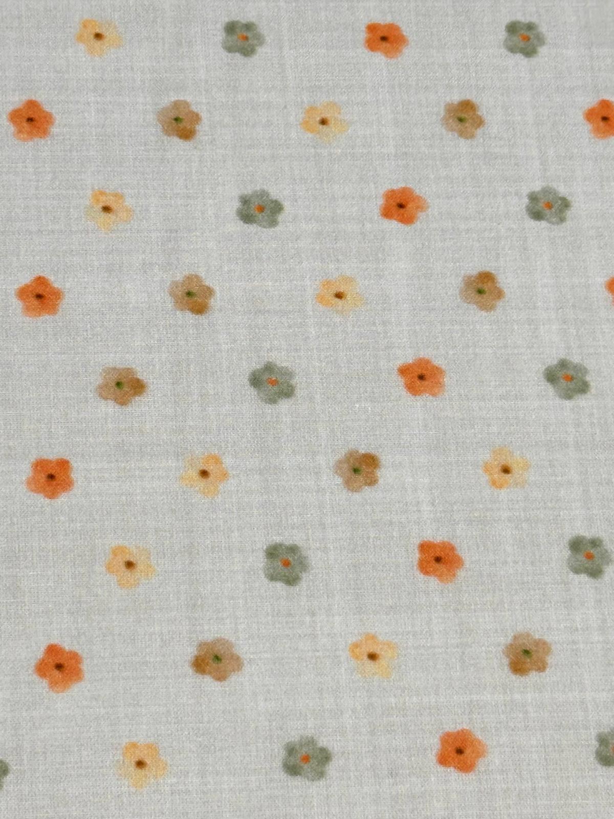Algodón Clásico flores, es un estampado de lunares naranja, amarillo tostado y verde antiguo sobre fondo beig piedra clarito