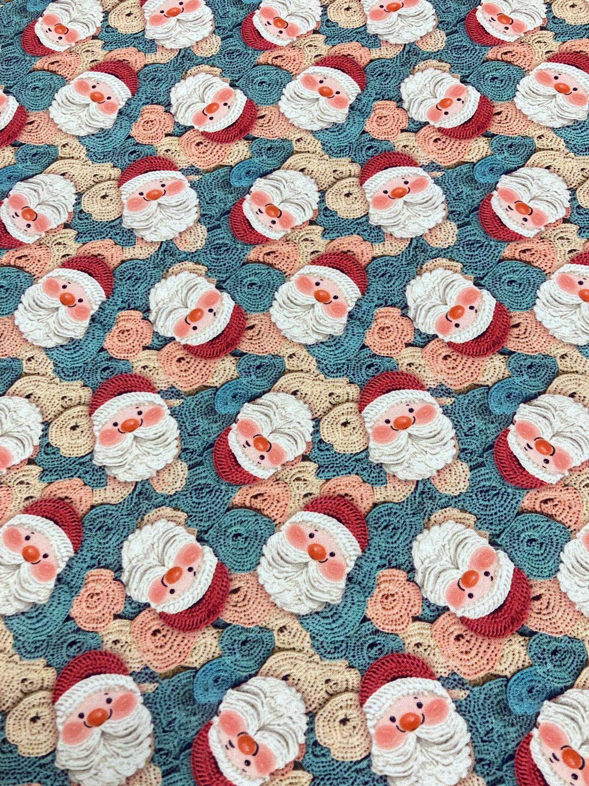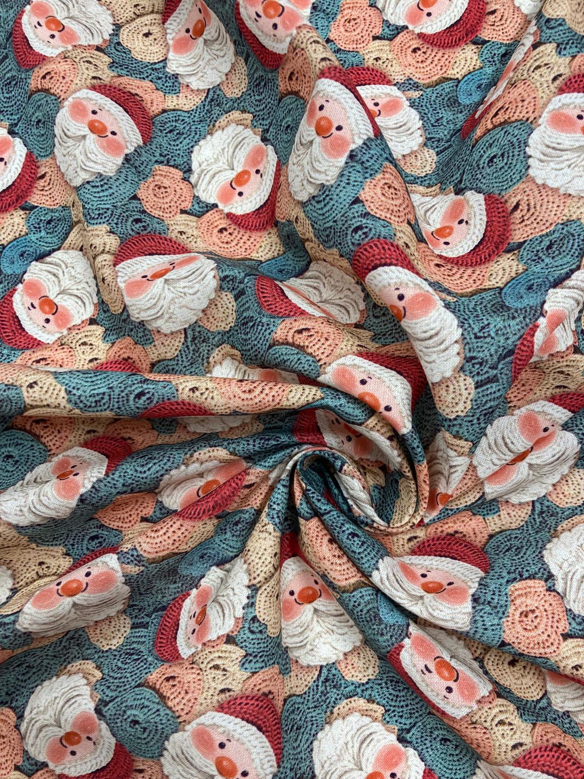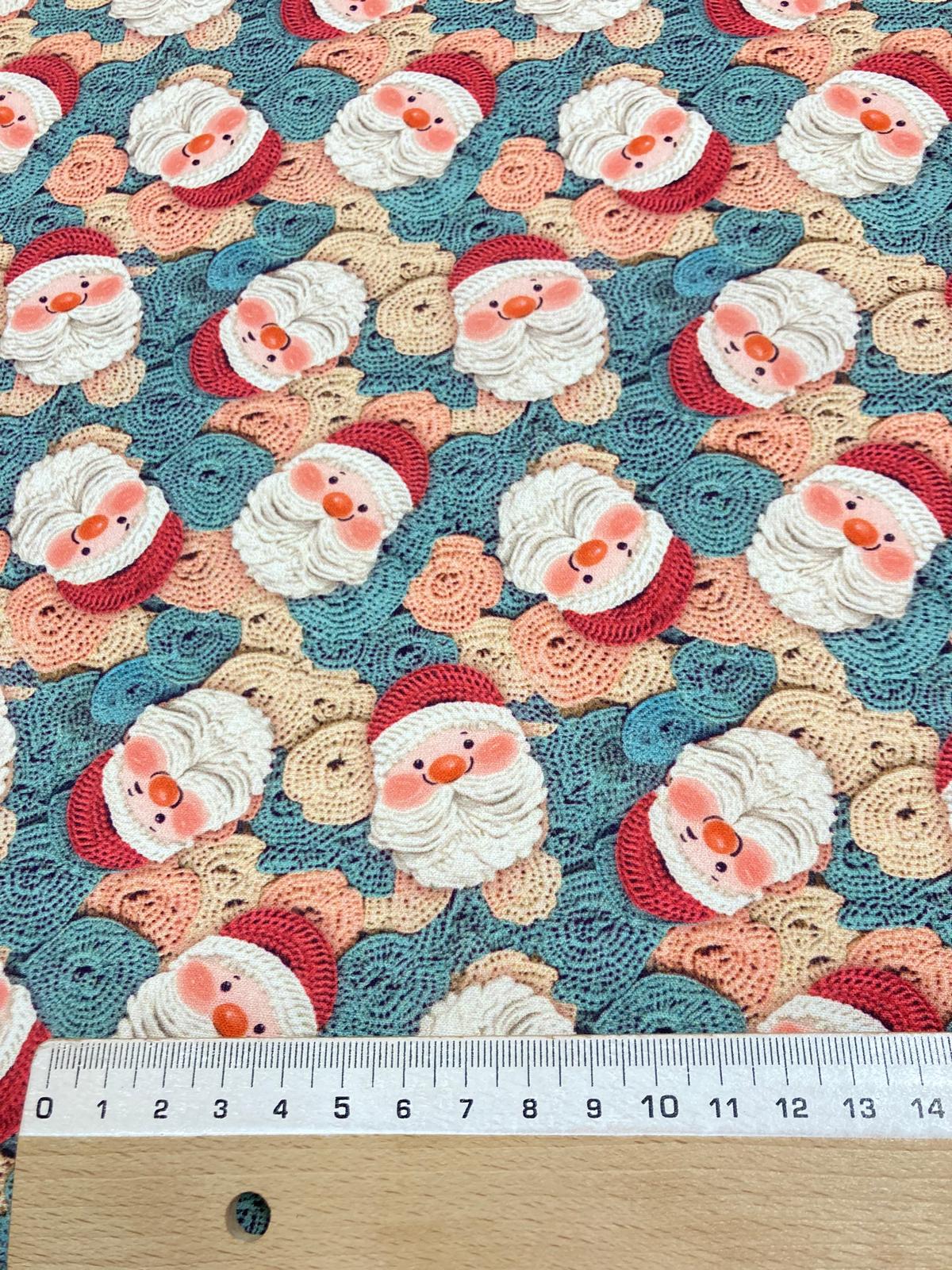 Algodón crochet papa noel es una tela con estampado que imita al ganchillo formando circulos en colores azul empolvado, maquillaje, crudo y muñecos de papa noel en tono rojo, blanco...