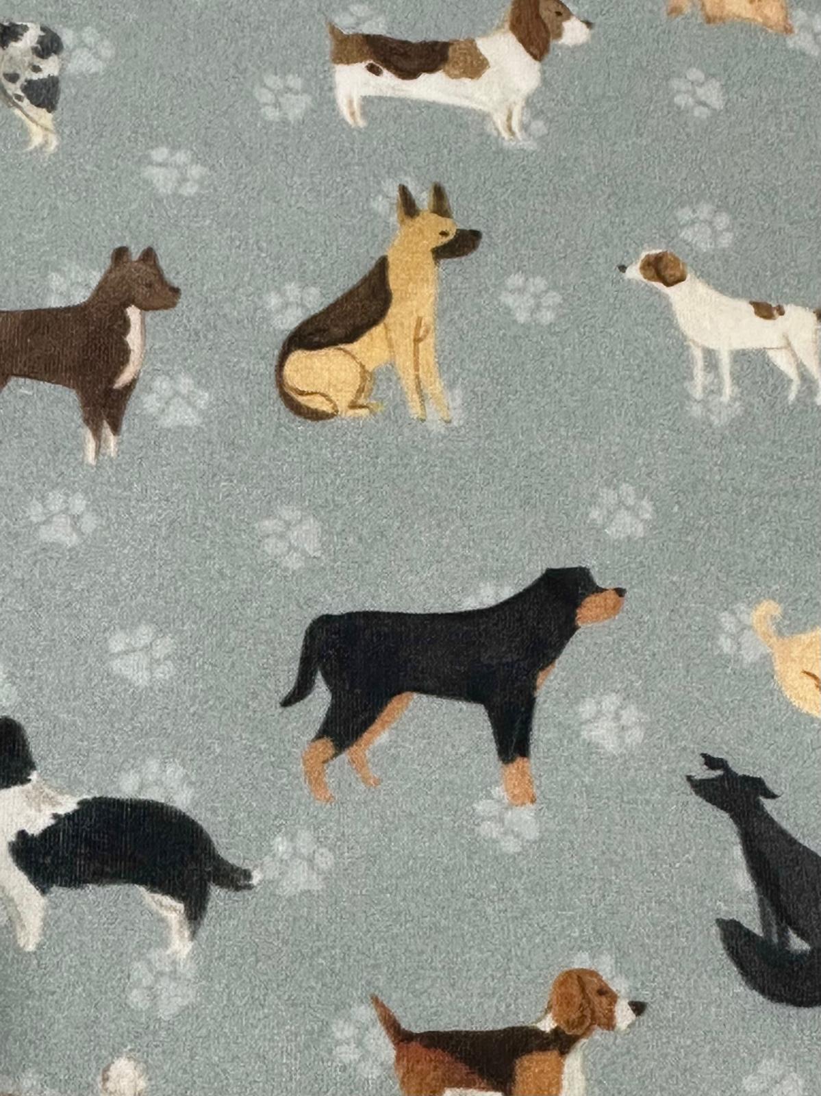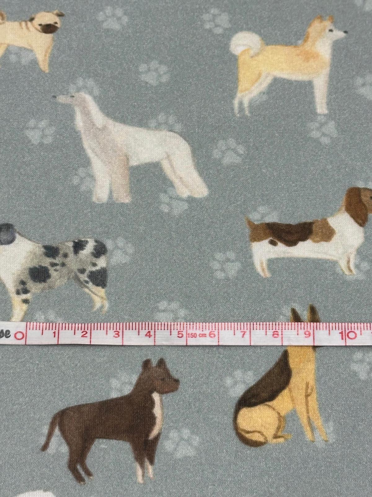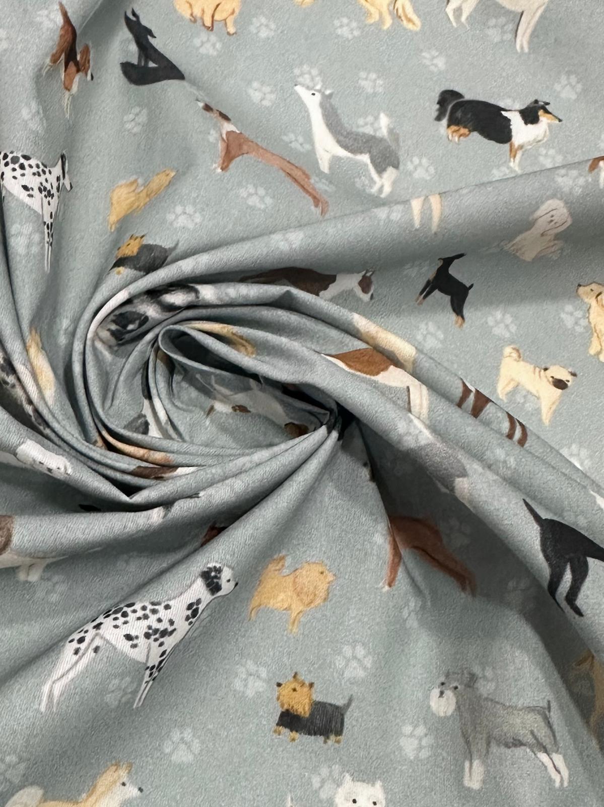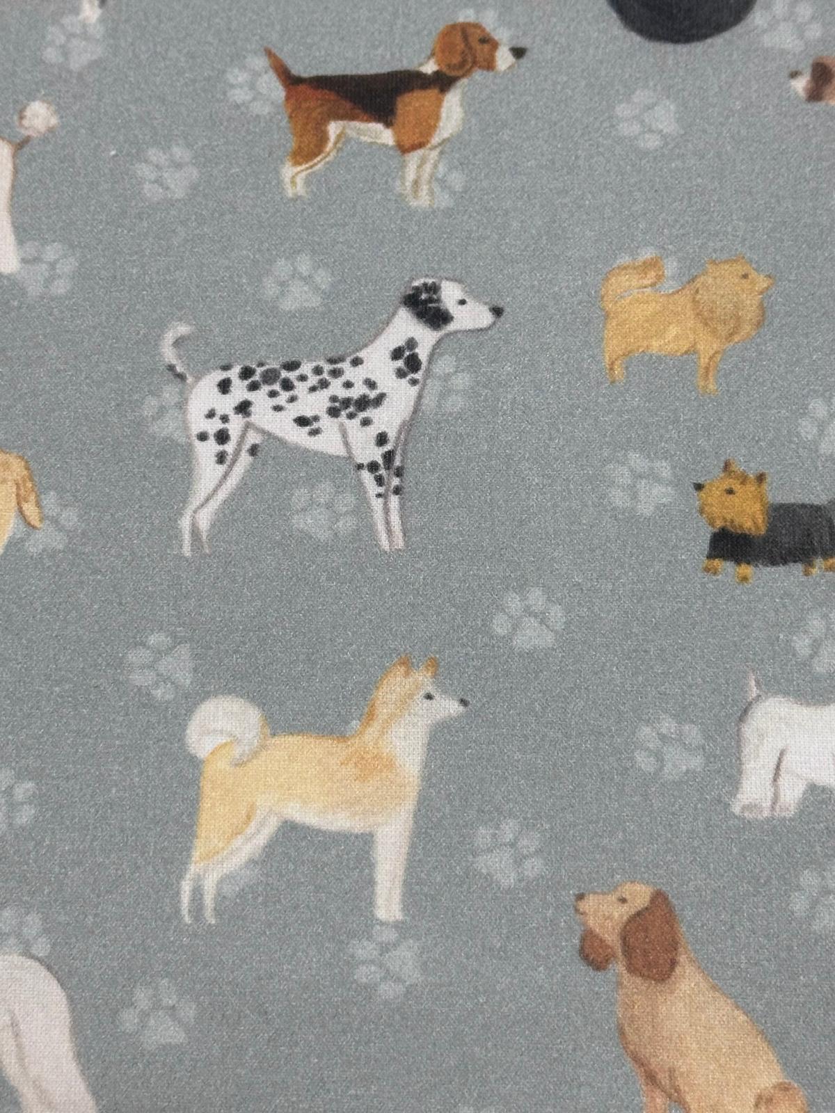 Algodón Dogs perritos, es un estampado de perros de diferentes razas sobre fondo azul grisáceo
