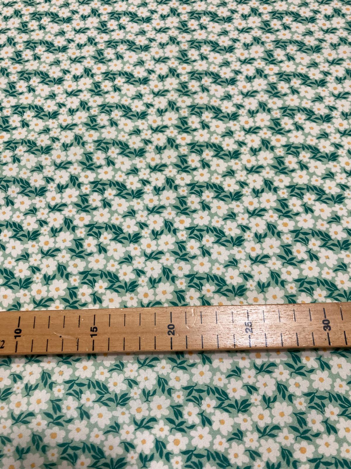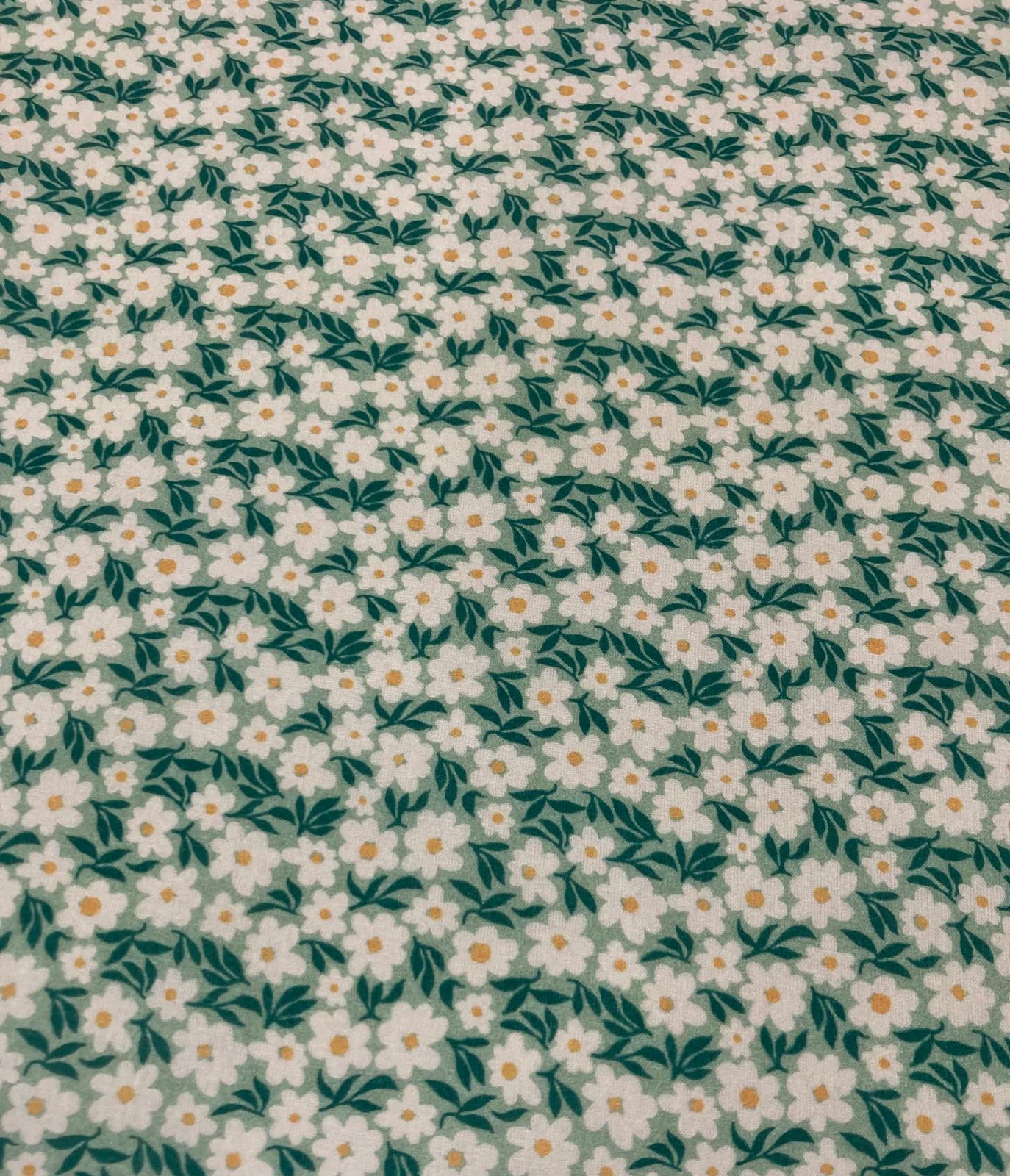 Algodón Dorothy flores, es un estampado de flores beig y ocre sobre fondo verde