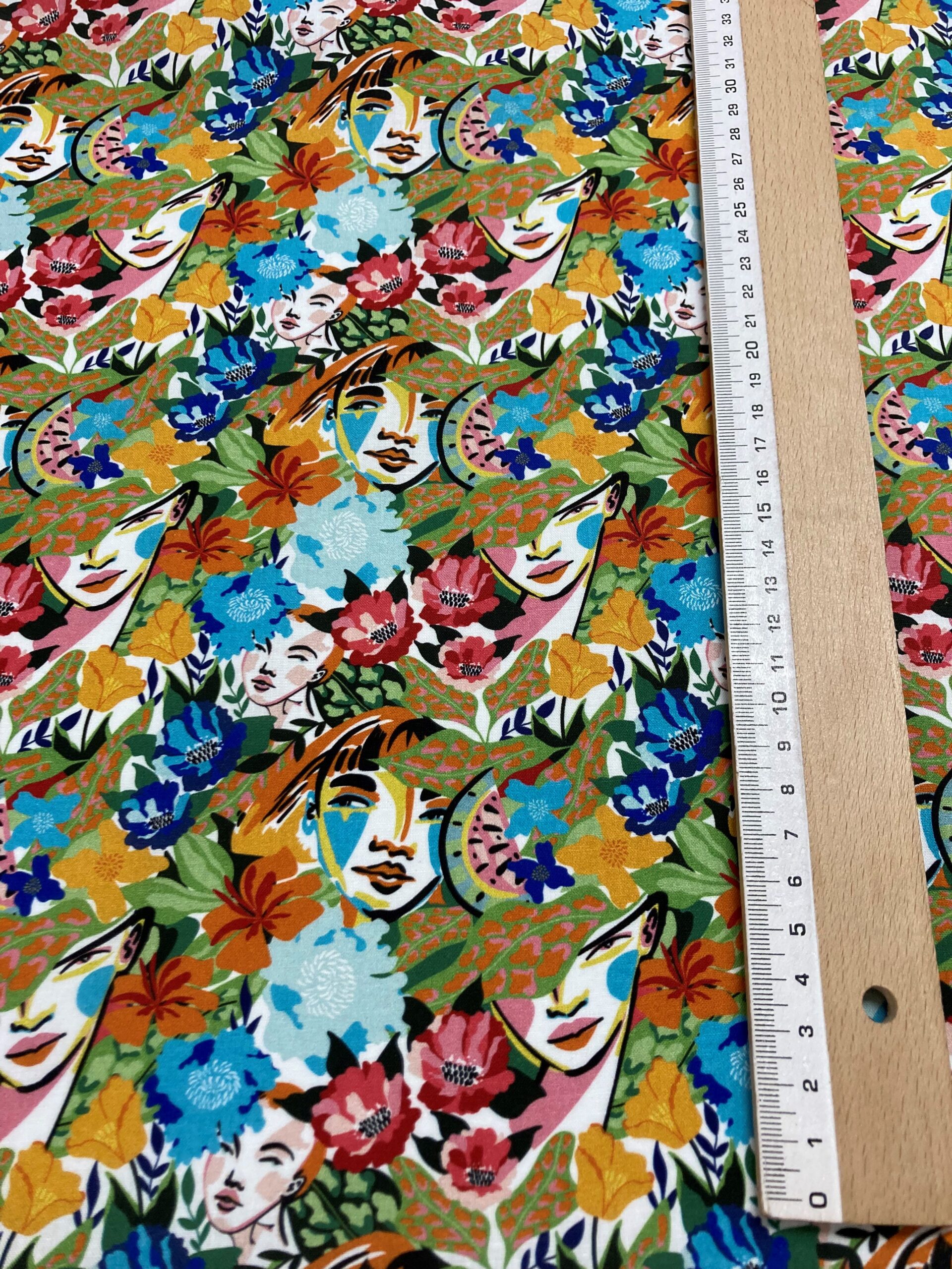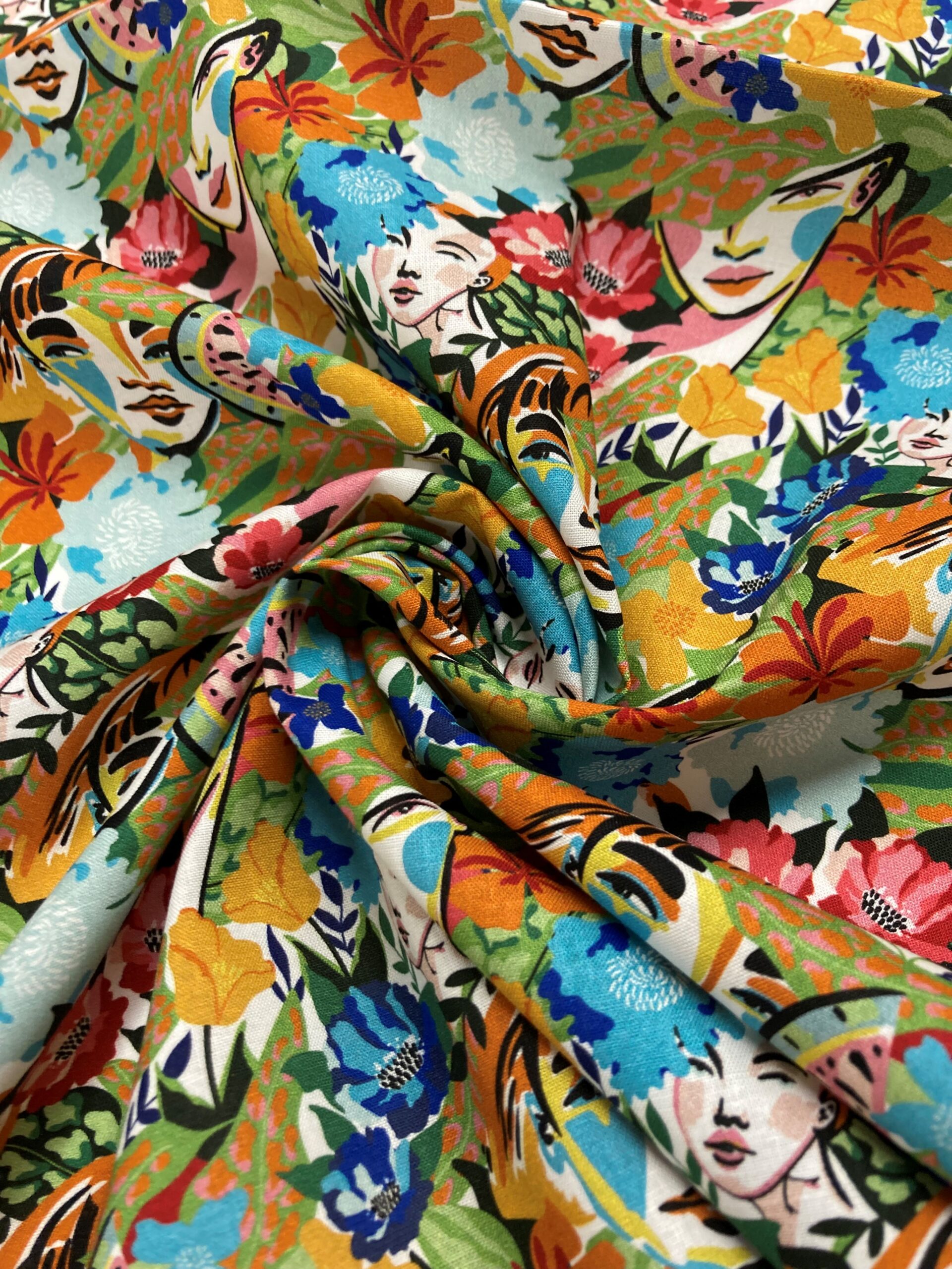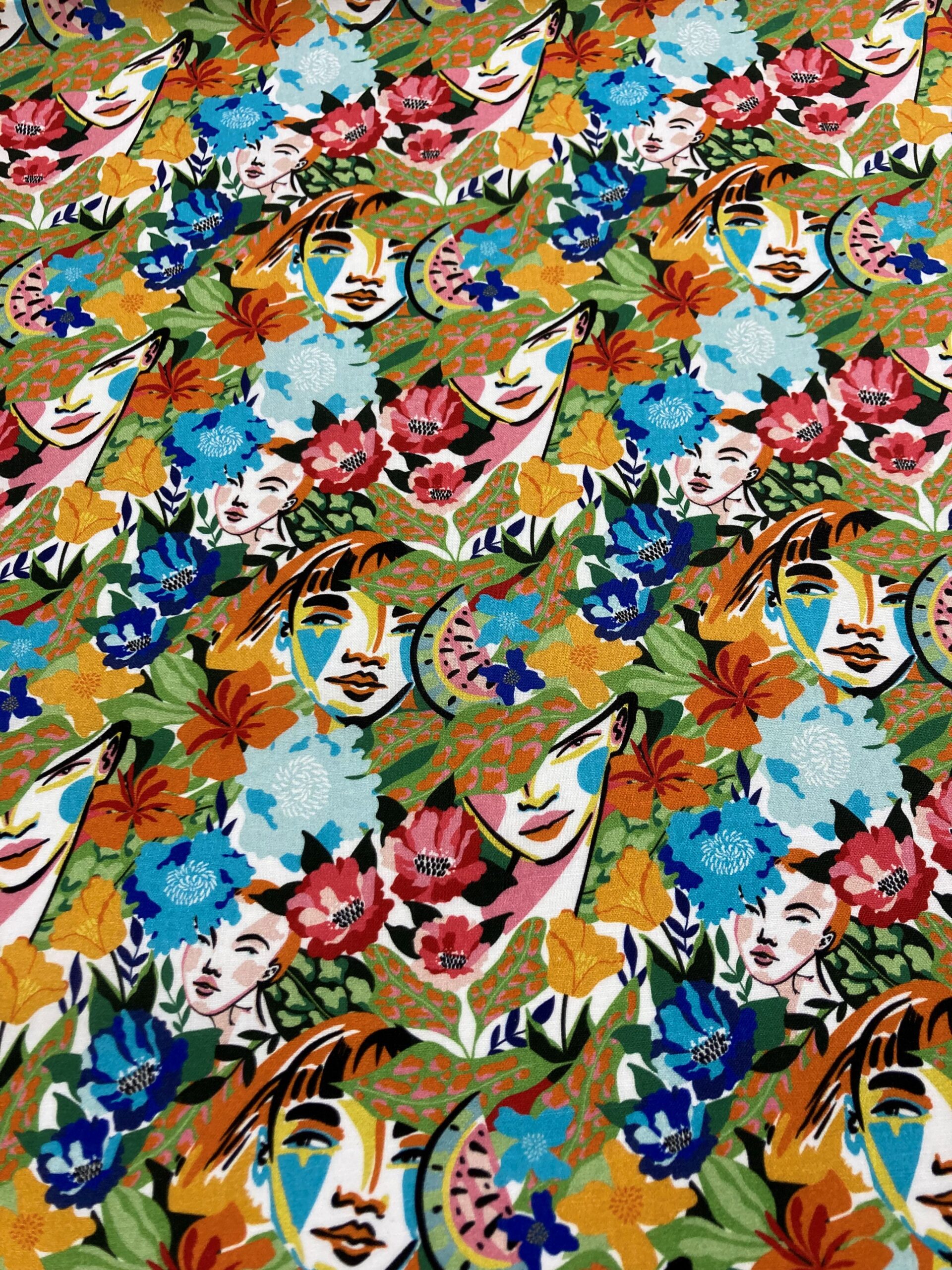 Algodón estampado con flores y caras en tonos azules, amarillos, naranja, rosa, etc..