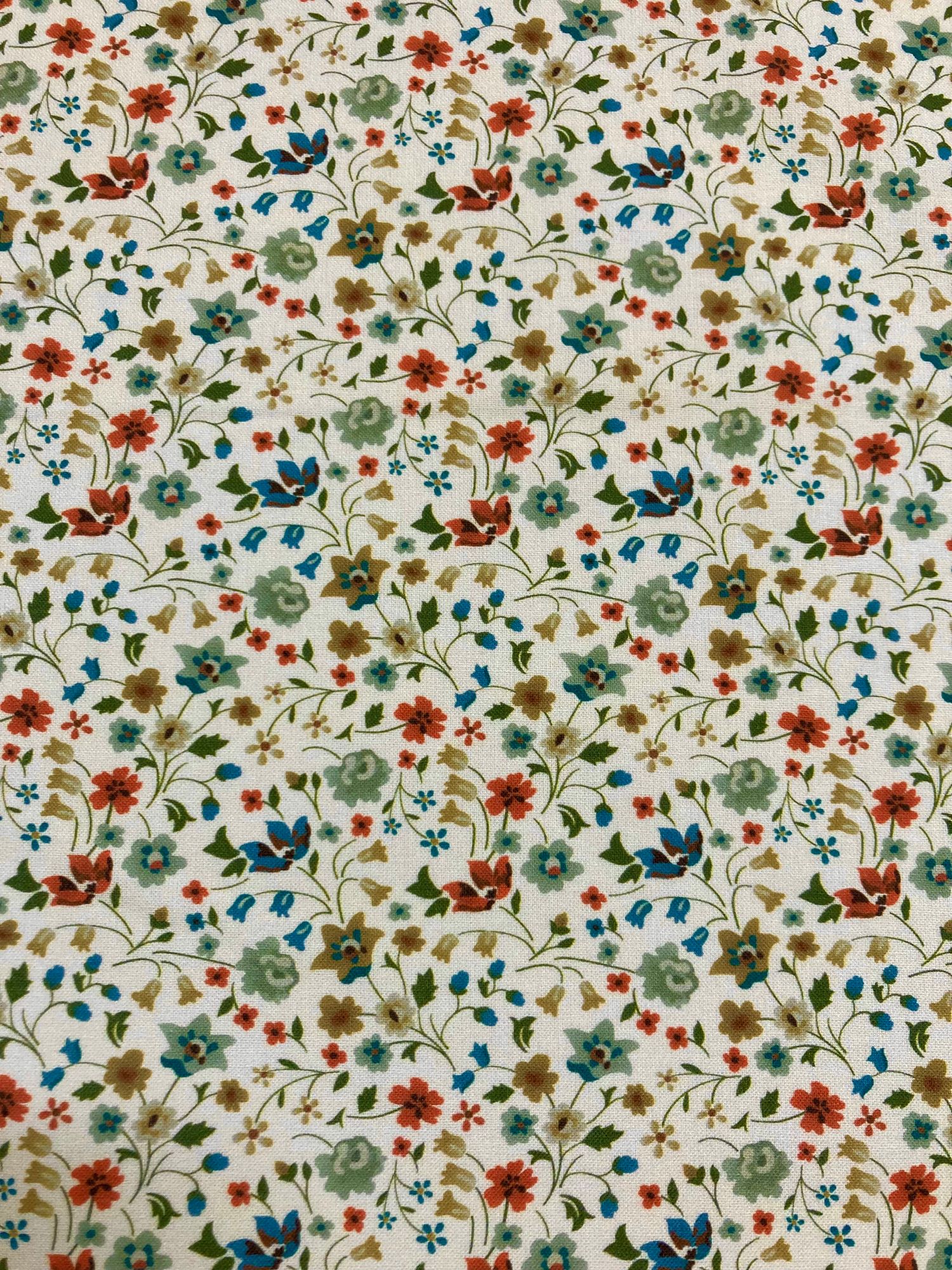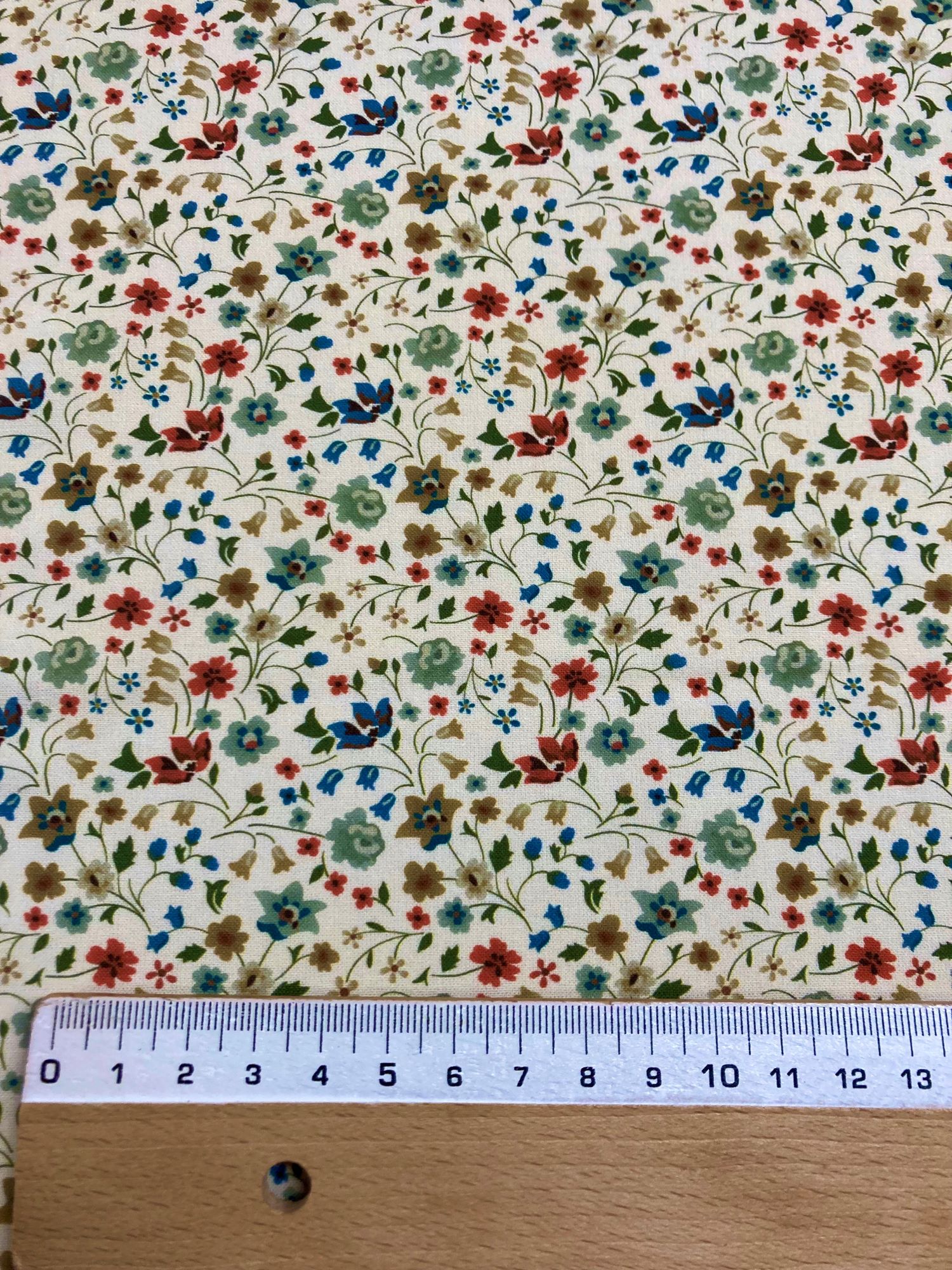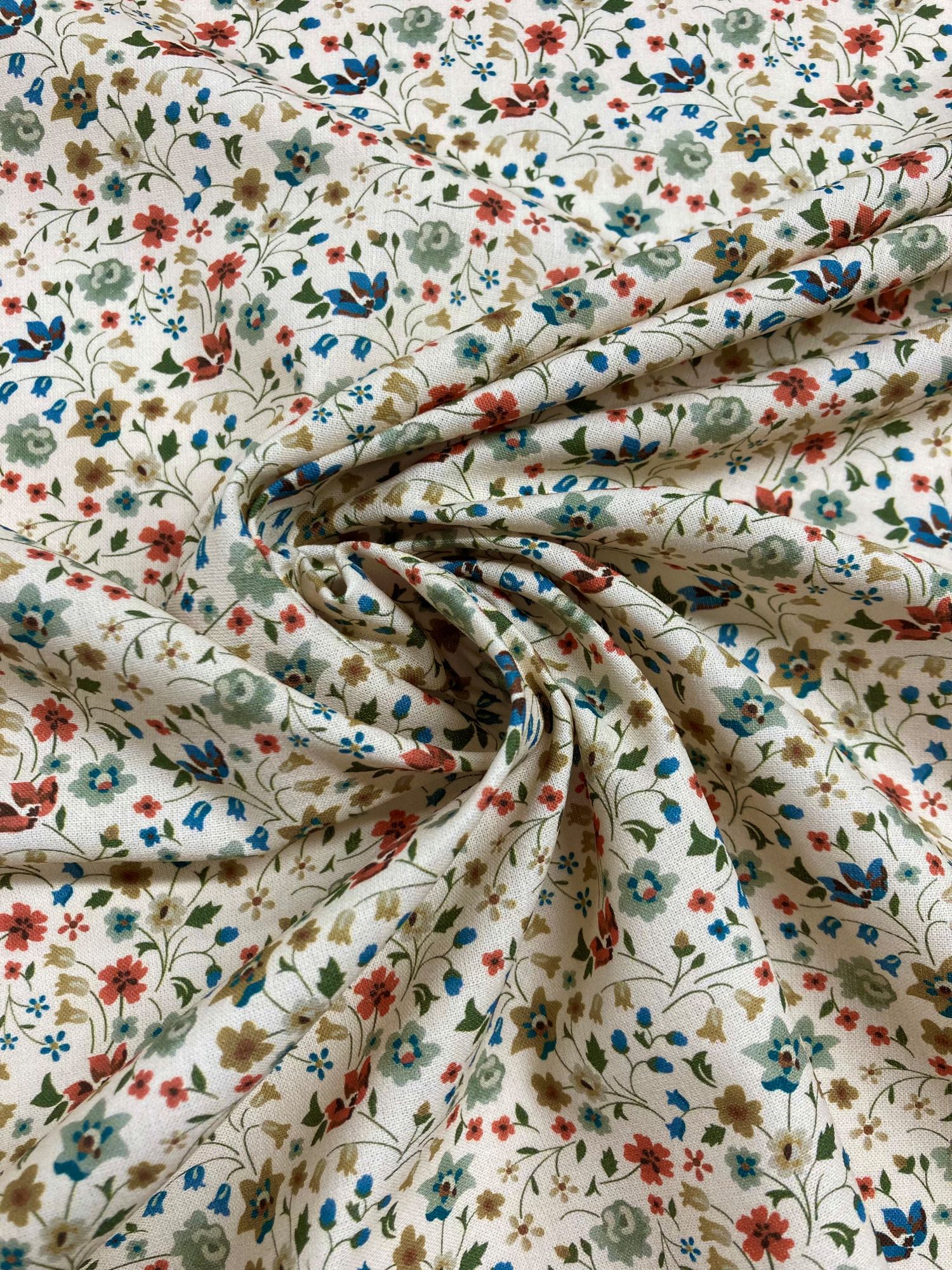 Algodón Feid beige es una tela de algodón de florecitas en tono lila, teja, verde, azul... en fondo beige