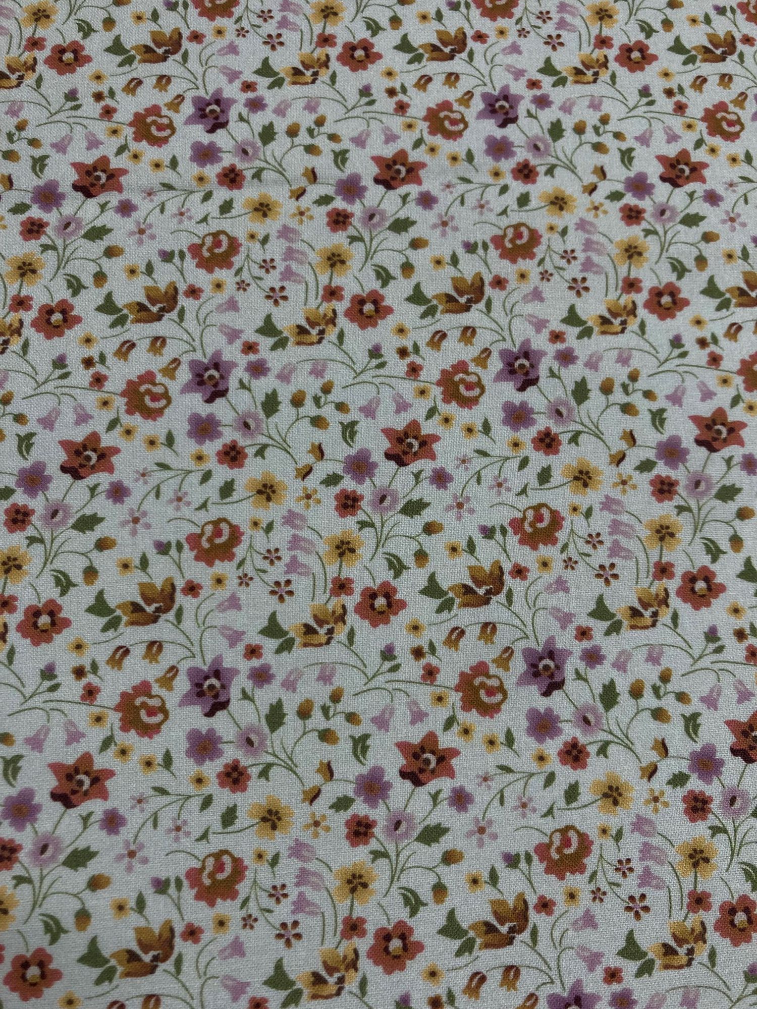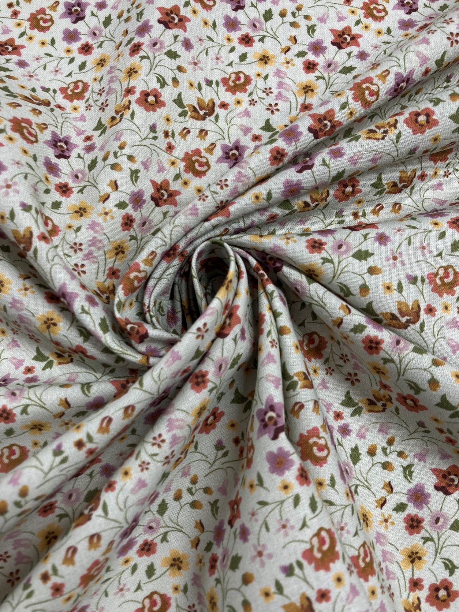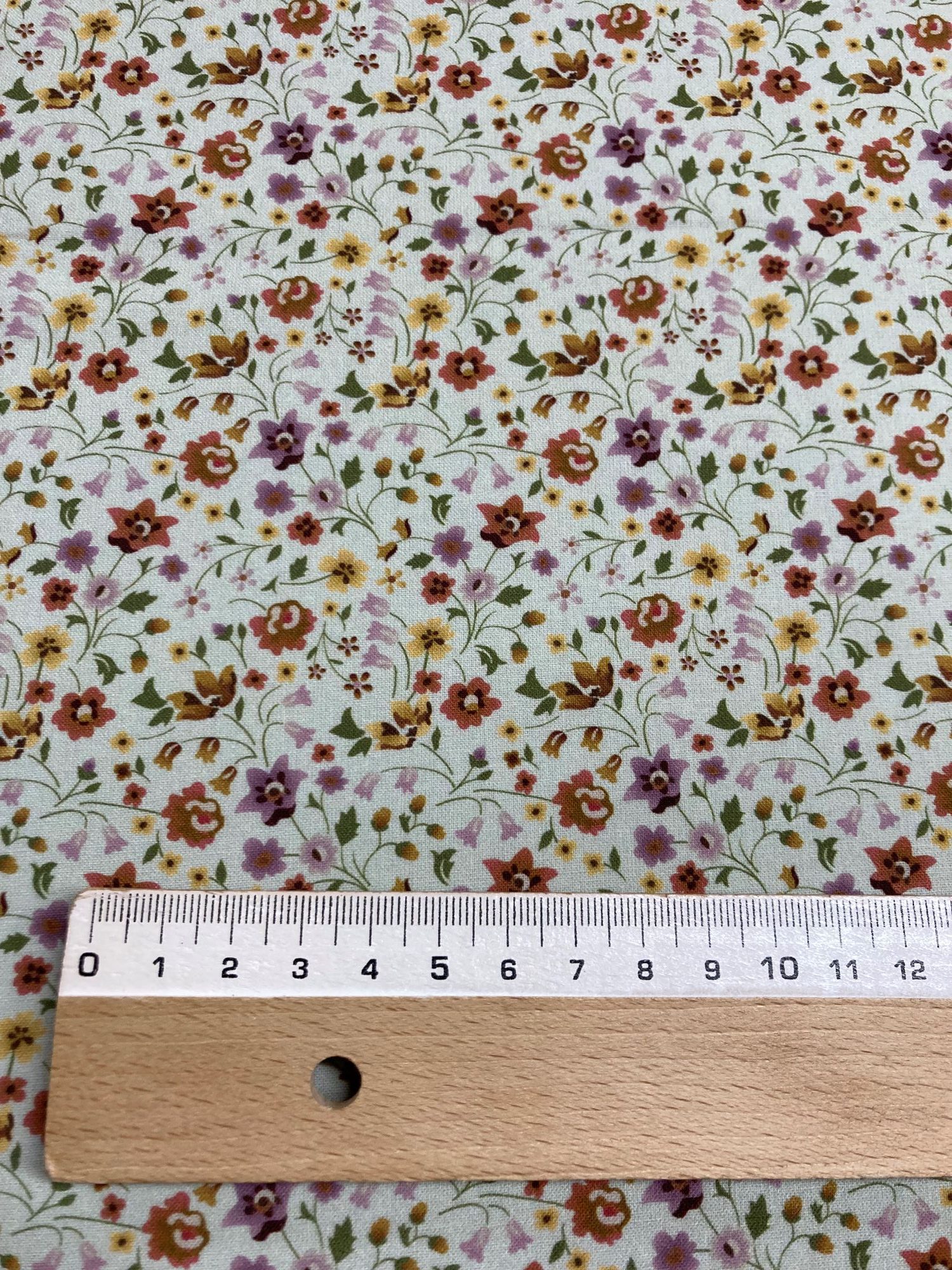 Algodón Feid verde es una tela de algodón de florecitas en tono lila, teja, verde, amarillo... en fondo verde mint