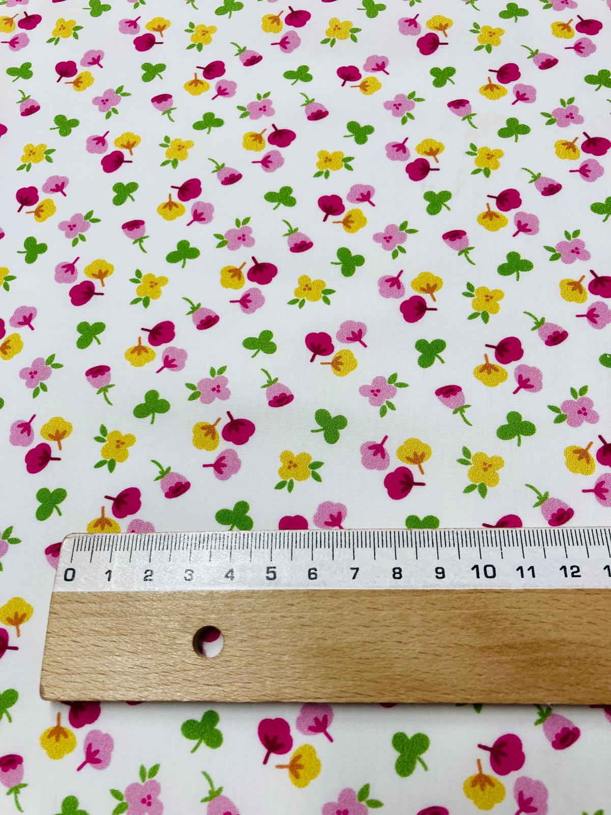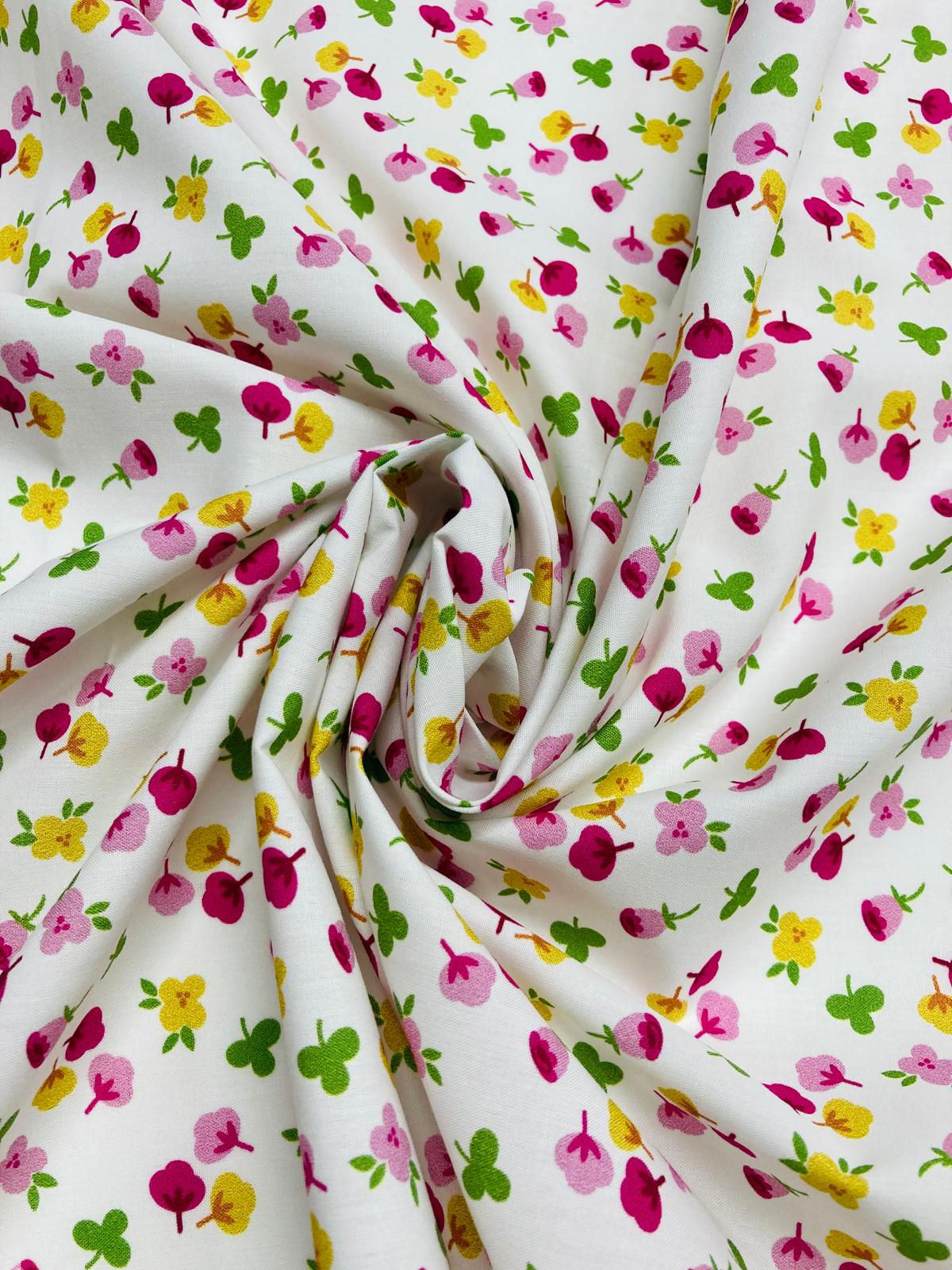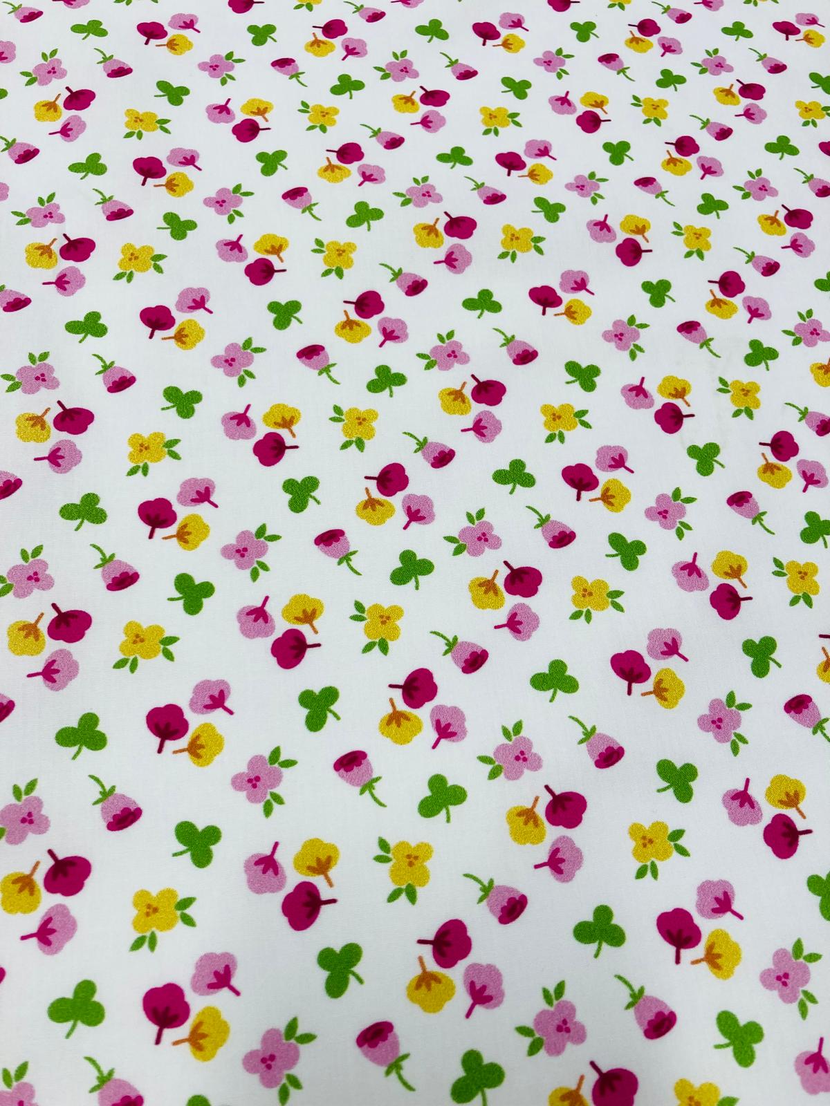 Algodón flores Barist es una tela de algodón con fondo en blanco y estampado de flores en colores fucsia, amarillo tostado y verde