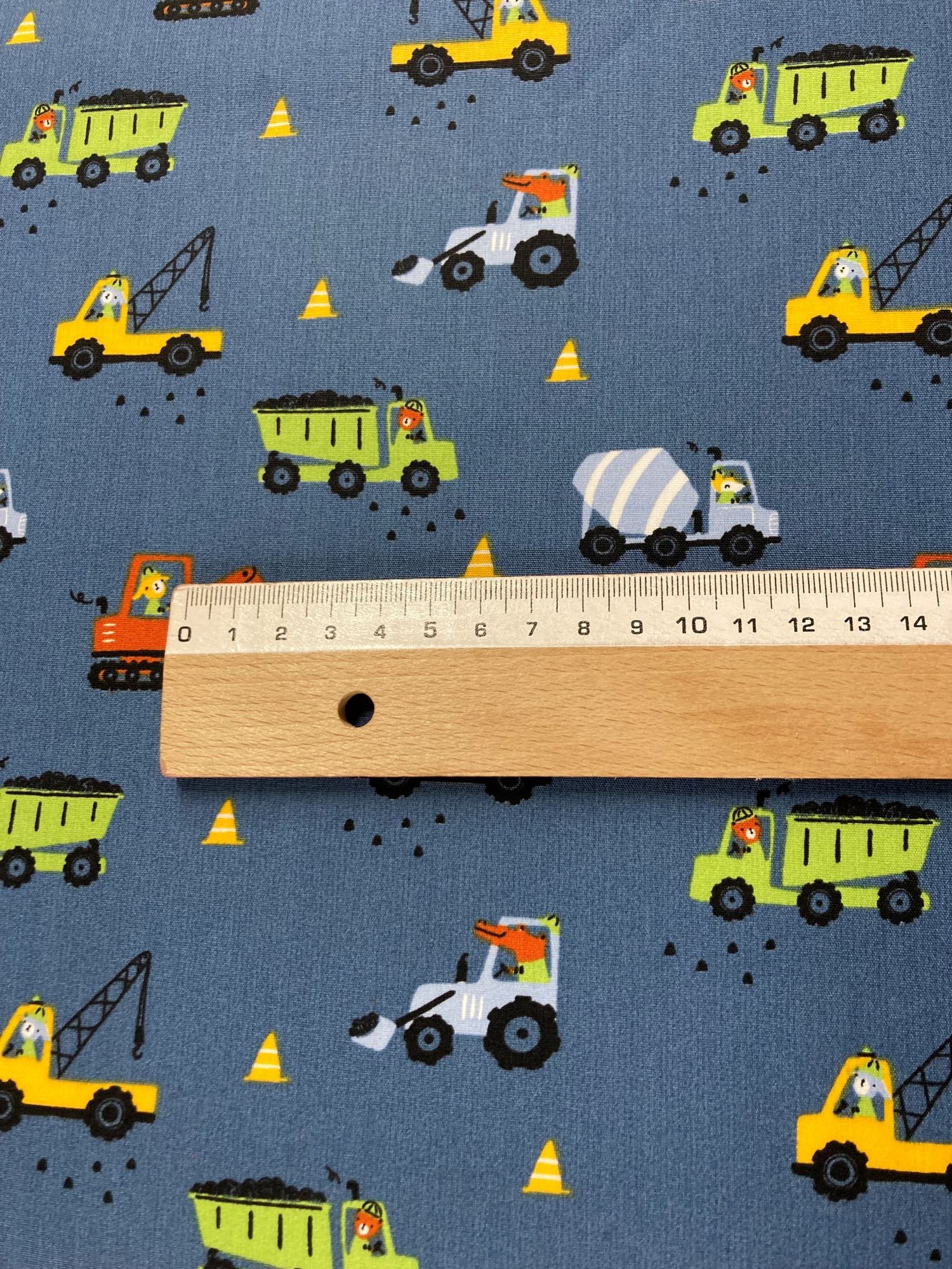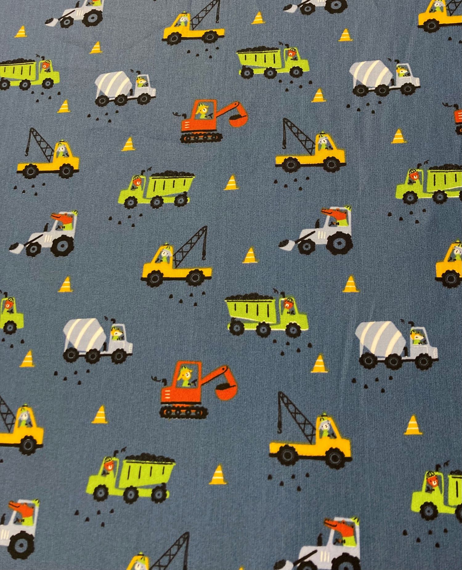 Estampado de grúas, camiones, en tono amarillo, verde, naranja.. en fondo azul.