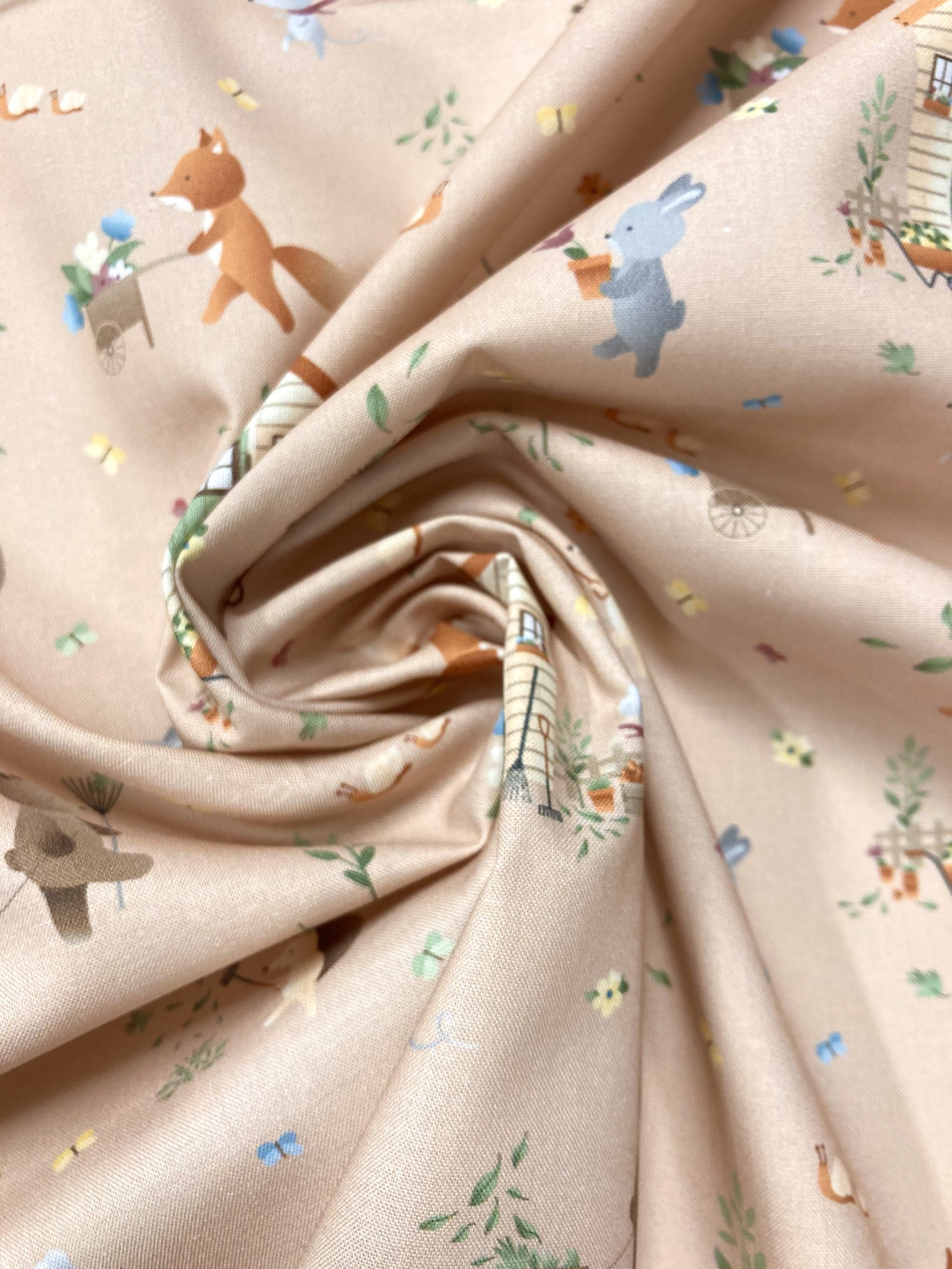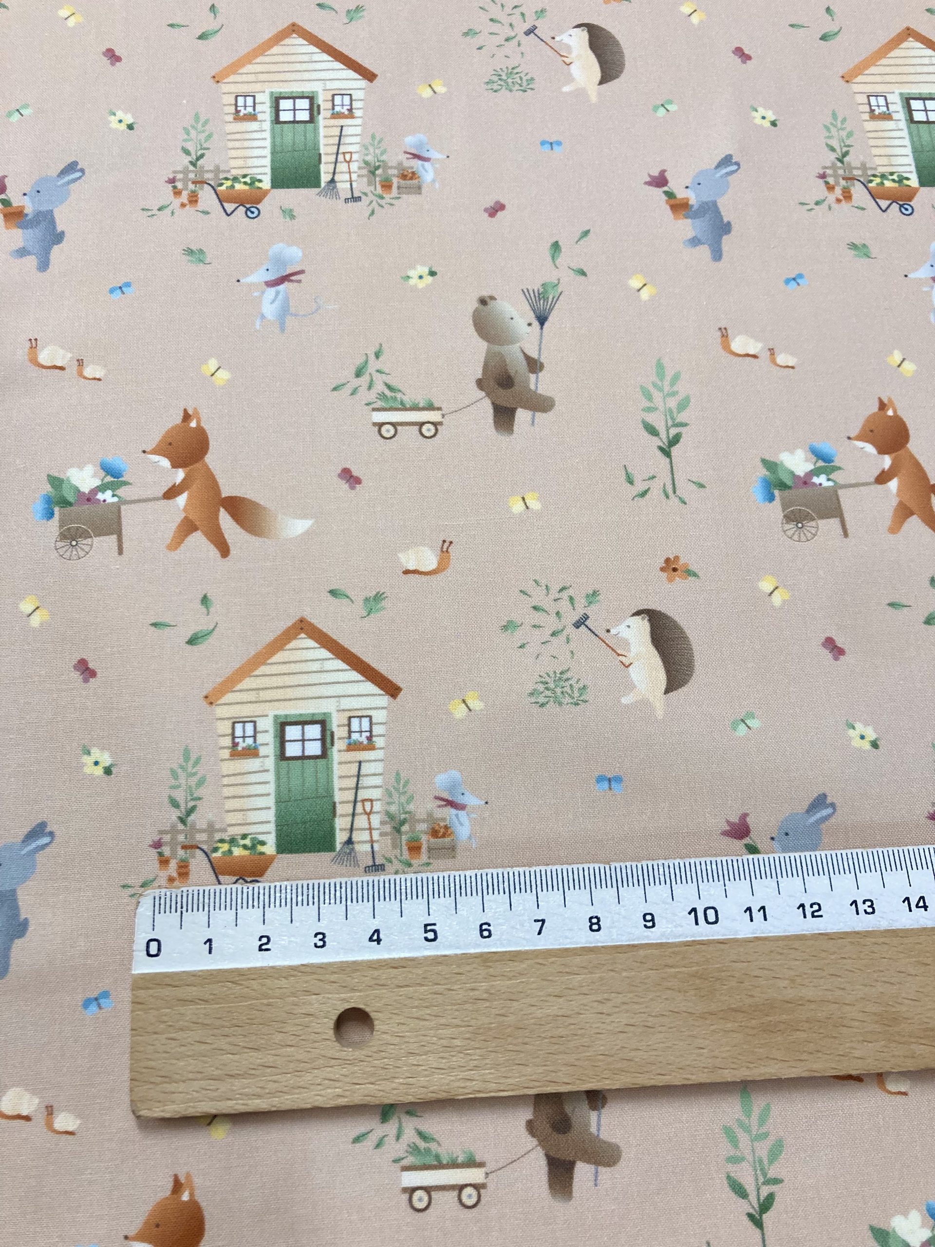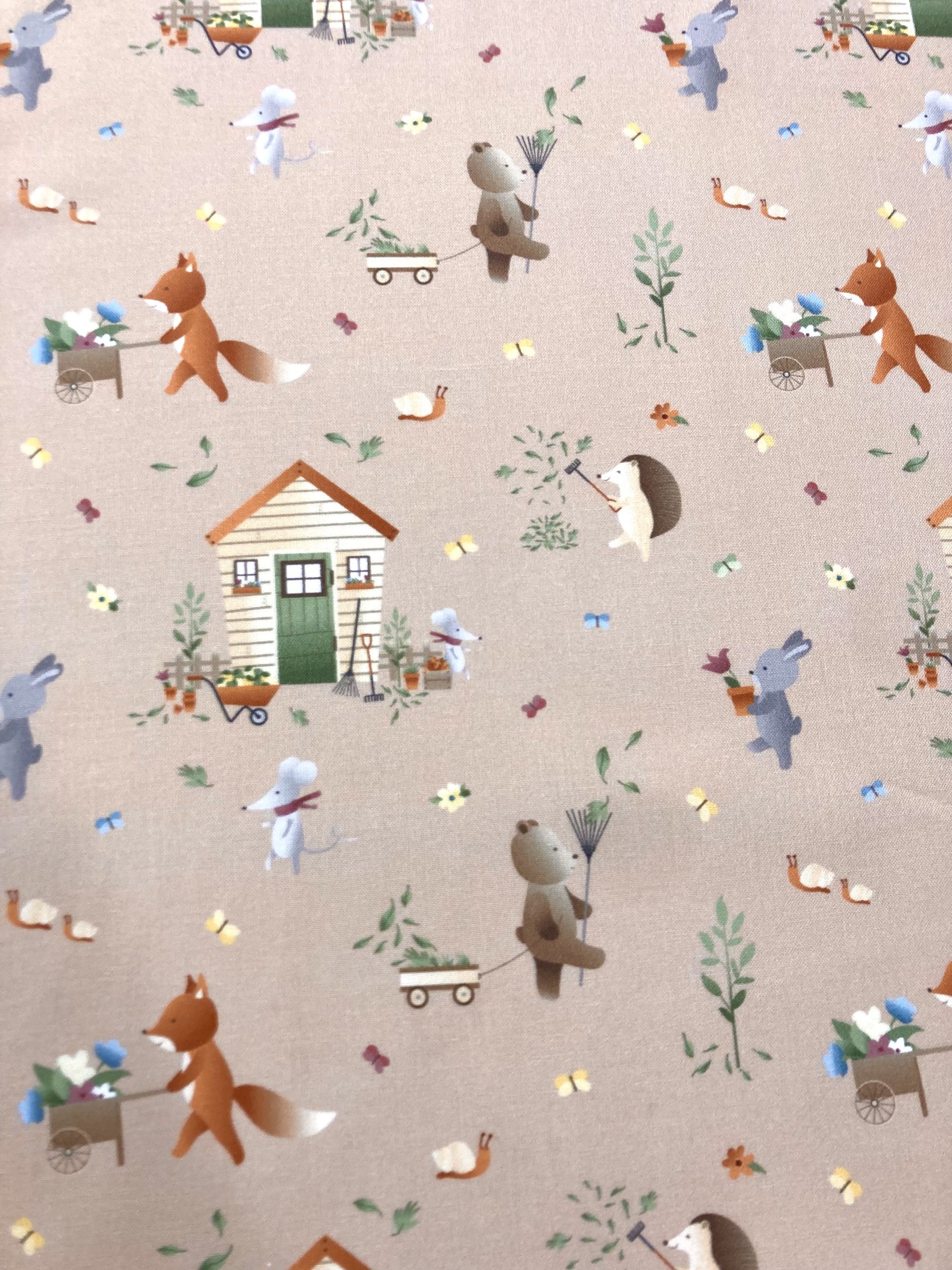 Algodón Ilusión Casas, es un estampado de casas, animalitos y hojas en tonos marrones, gris, amarillo, verde.. sobre fondo maquillaje nude.
