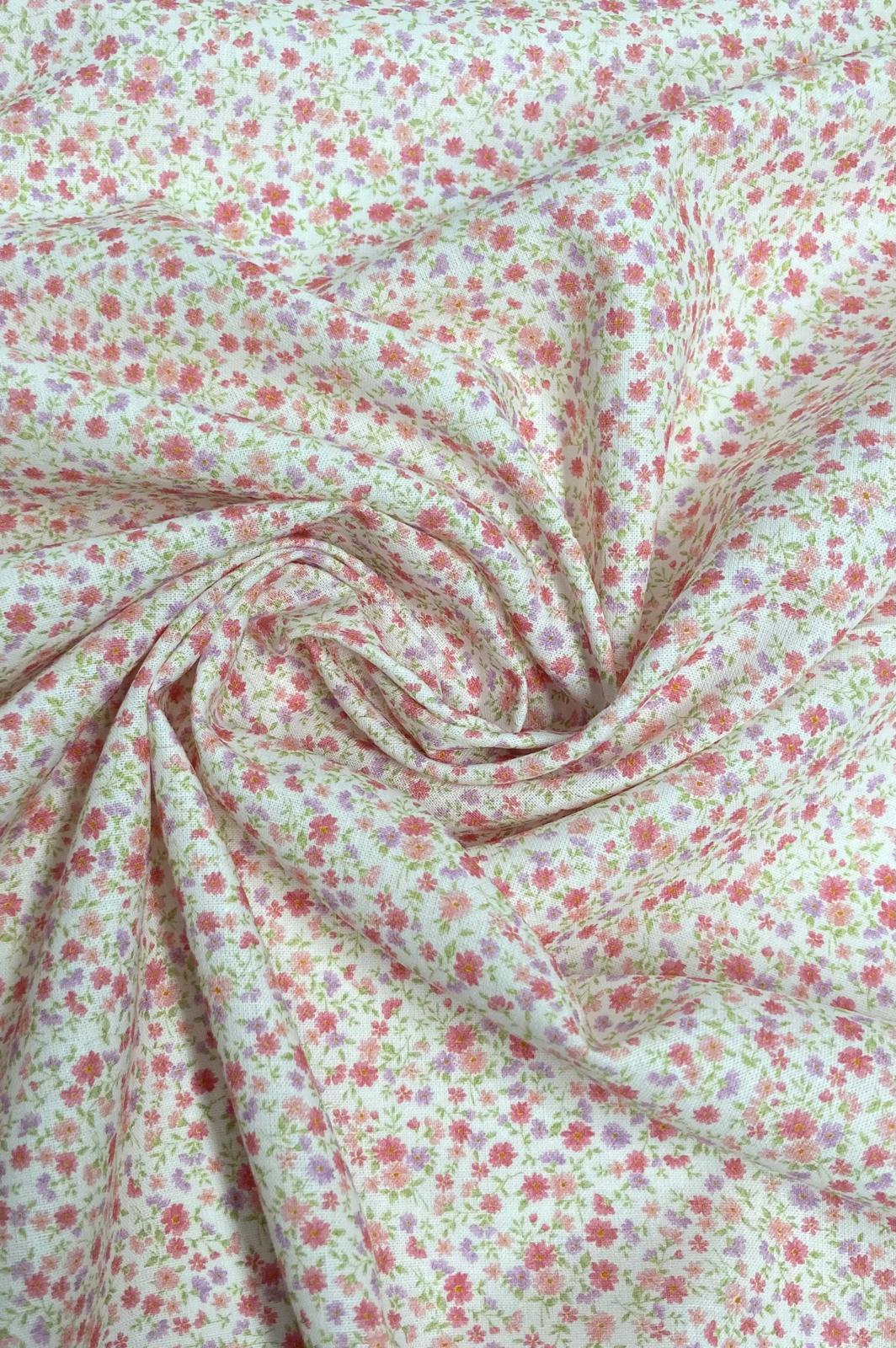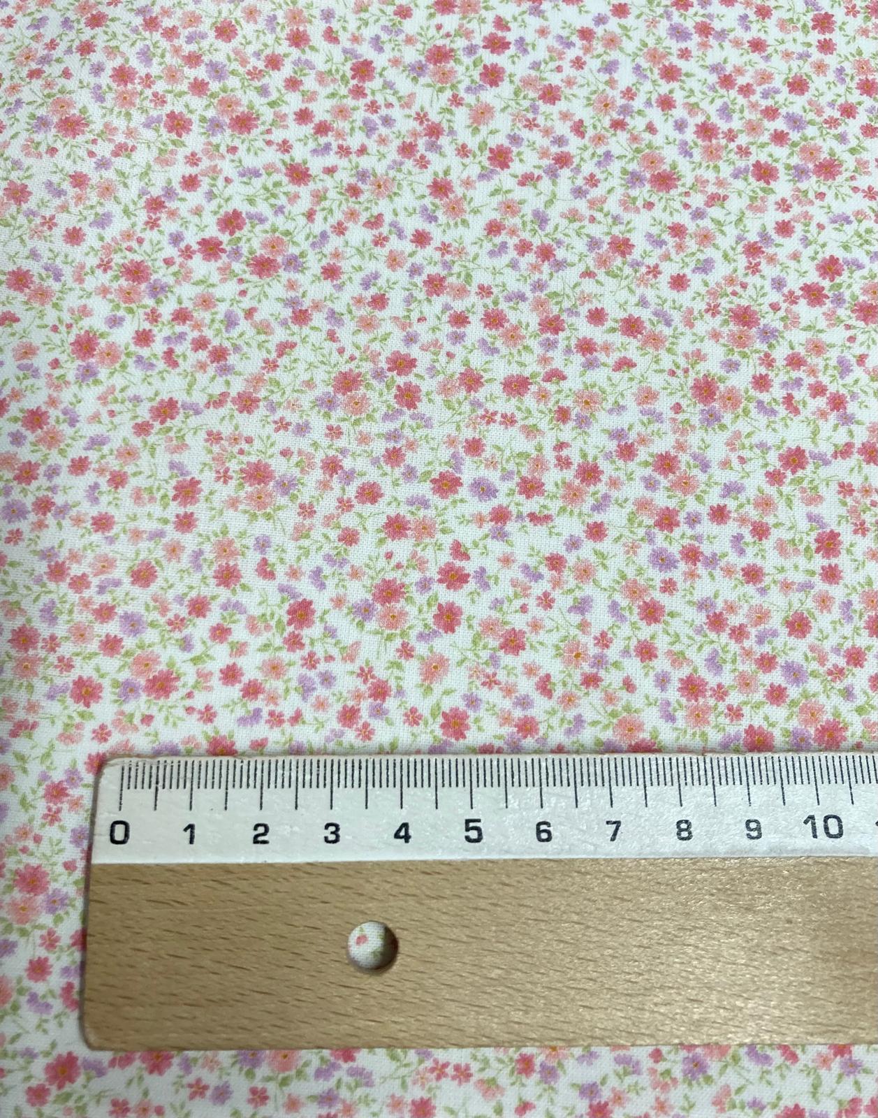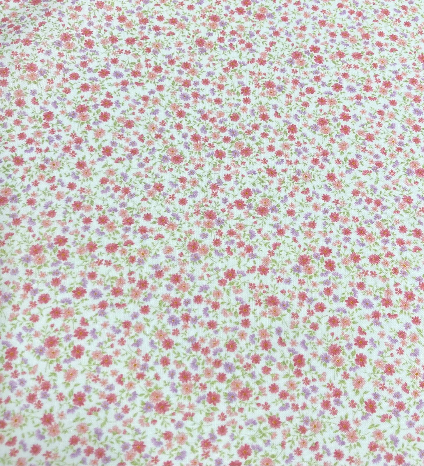 Algodón Limbo Coral, es un estampado de florecitas y hojas en tonos verde pistacho y las florecitas en tono coral, rosita, lila.