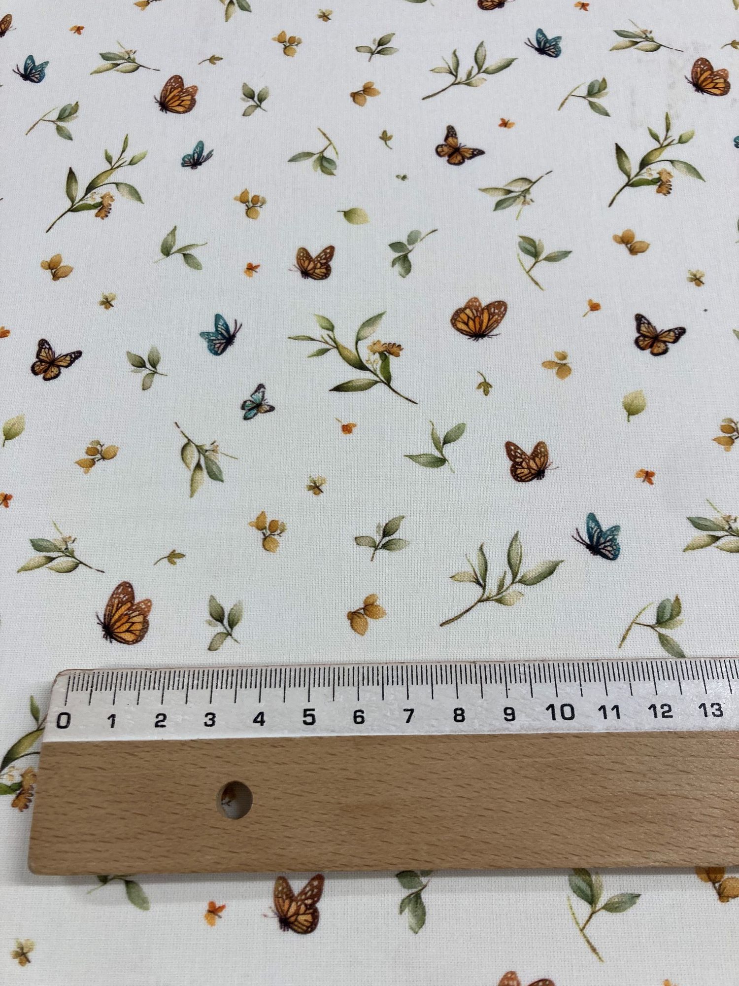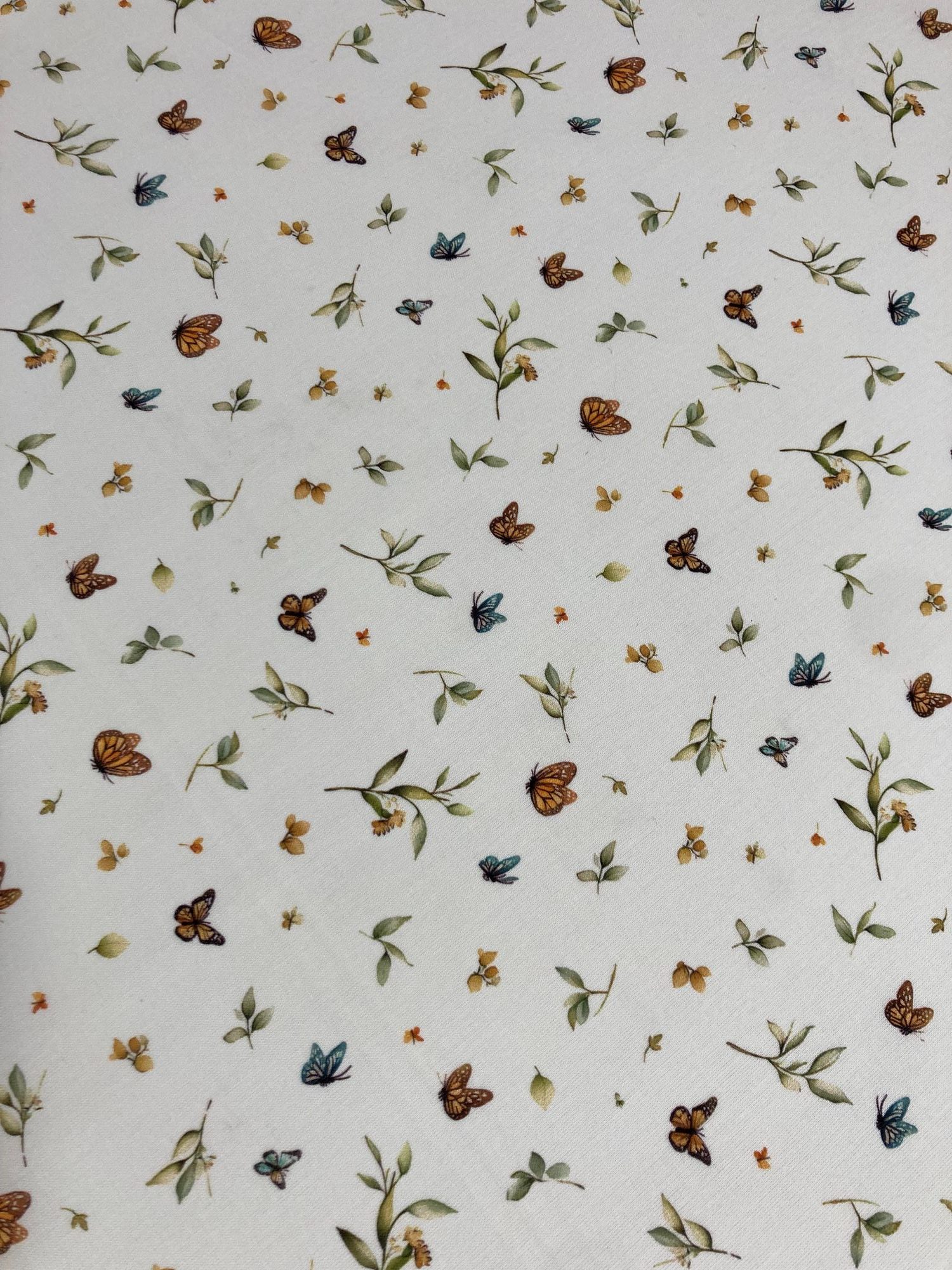 Algodón mariposas , es un estampado de mariposas pequeñitas en varios colores sobre fondo blanco con hojitas verdes.