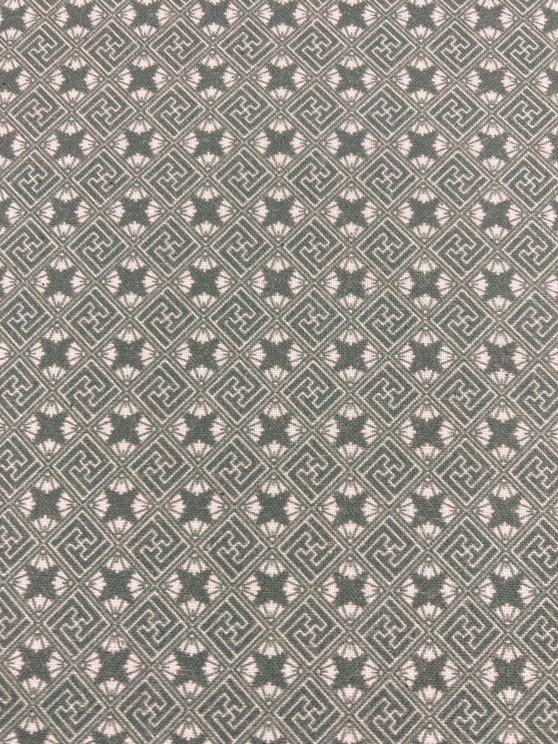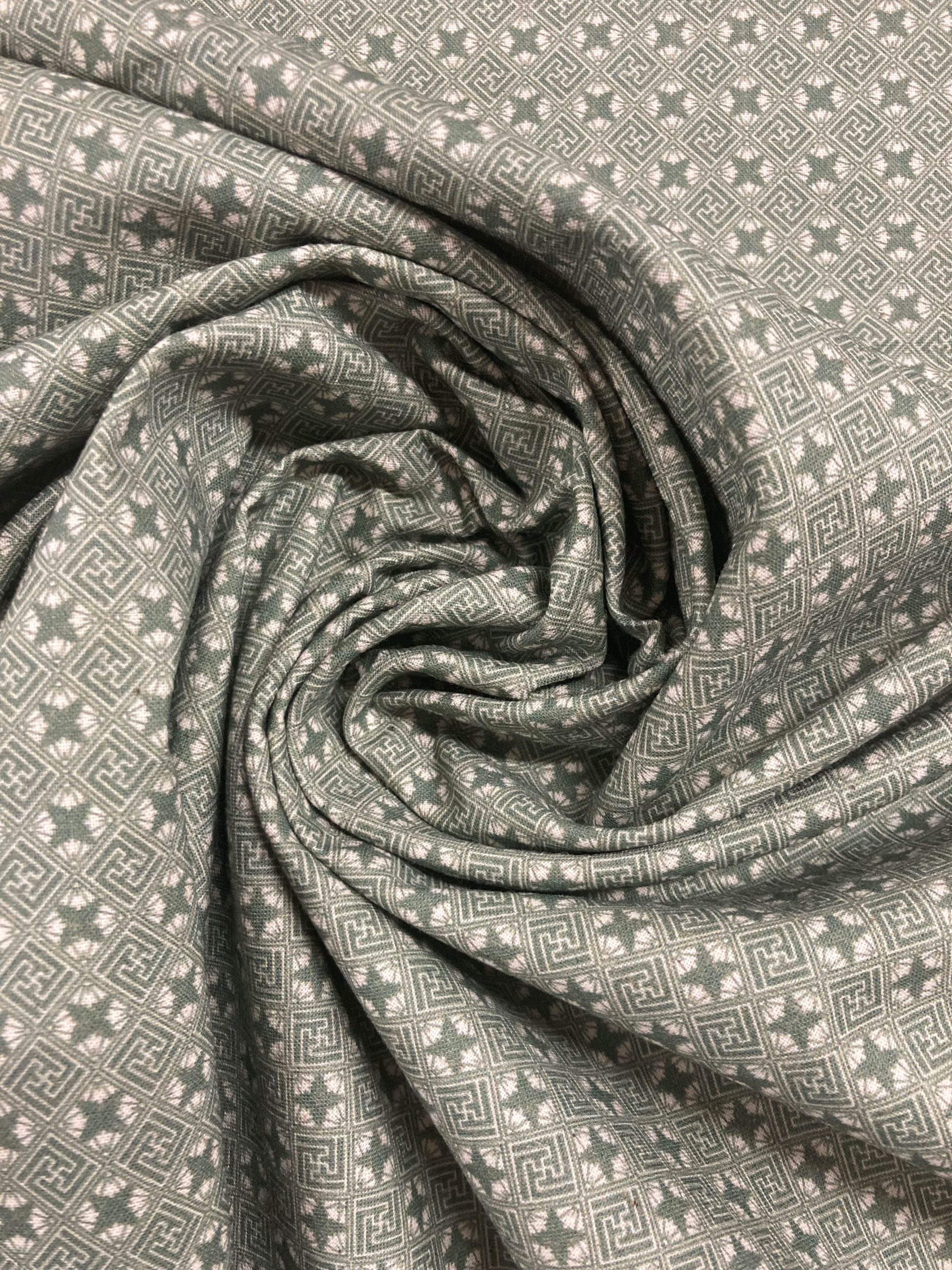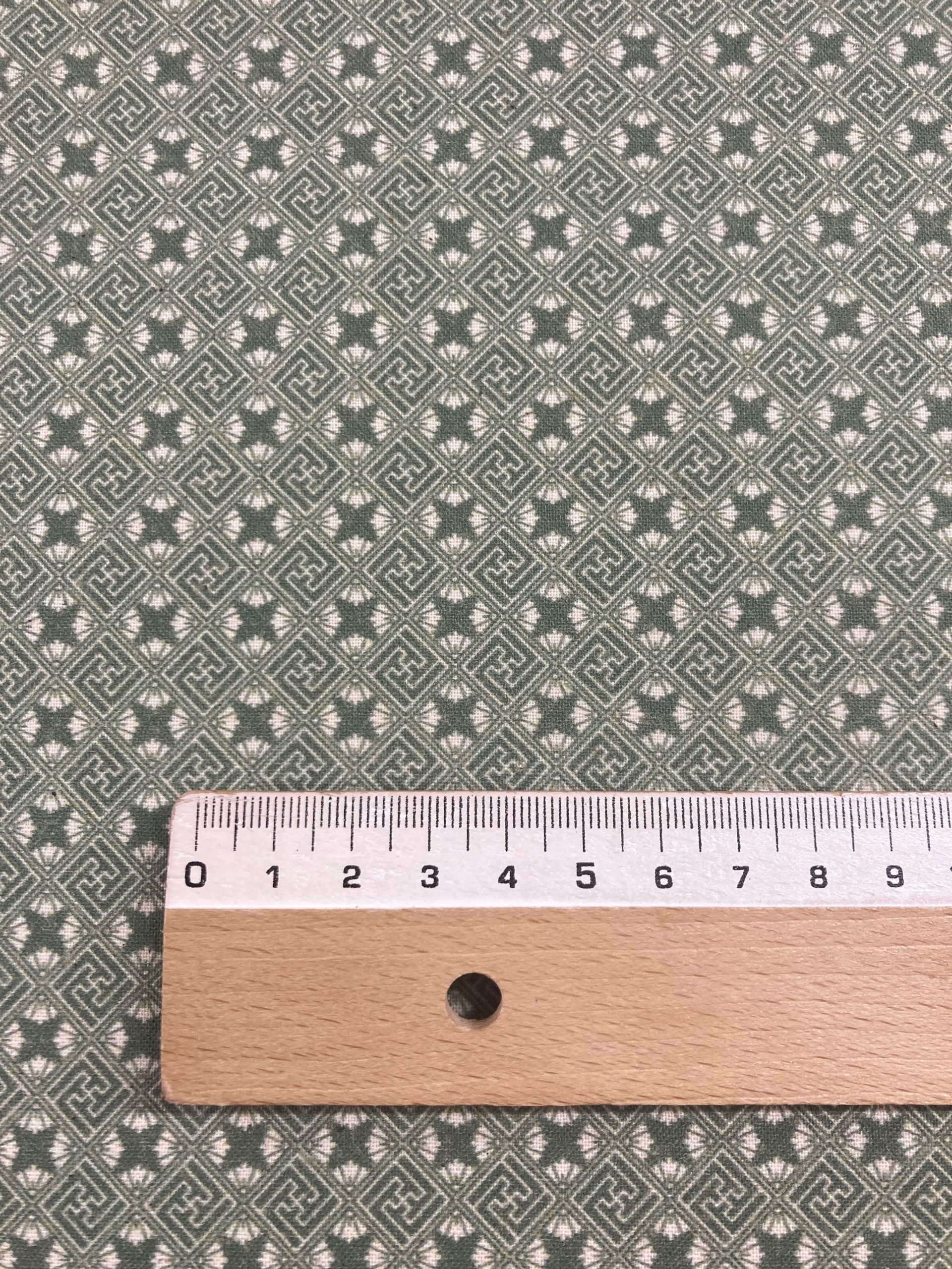 Algodón Mireia geométrico verde es una tela de algodón con fondo en crudo y estampado simulando unas hojitas en verde.