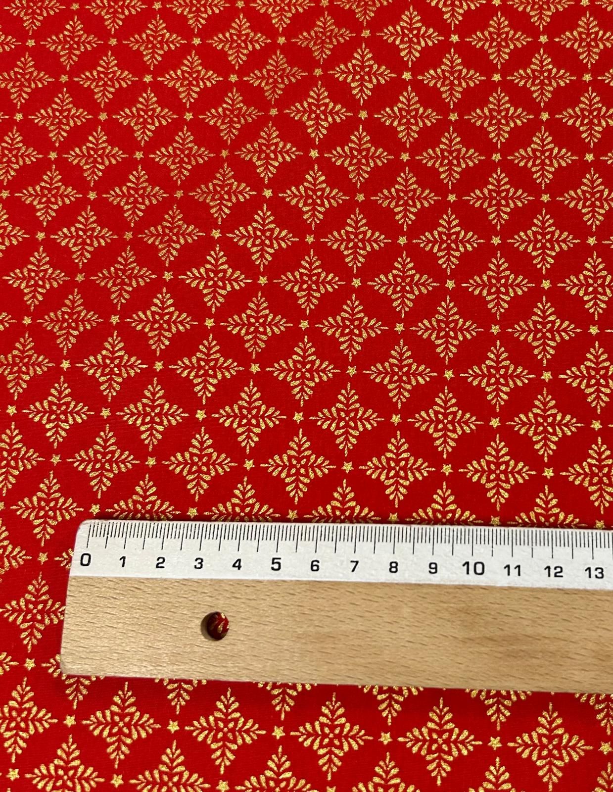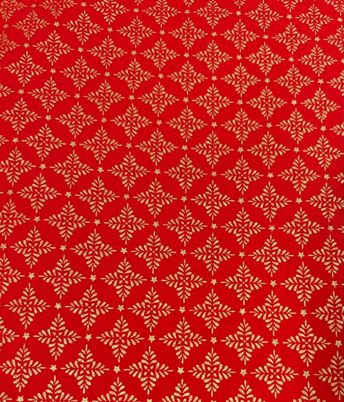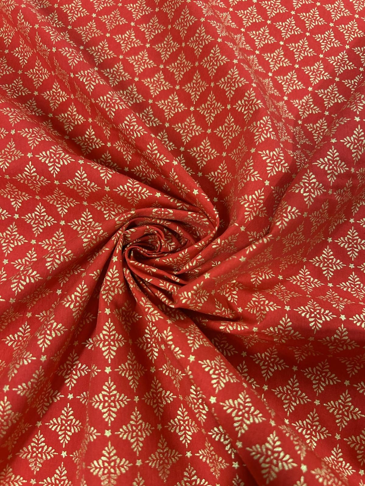 Algodón estampado navideño, hace estrellitas con puntitos en dorado con fondo rojo.