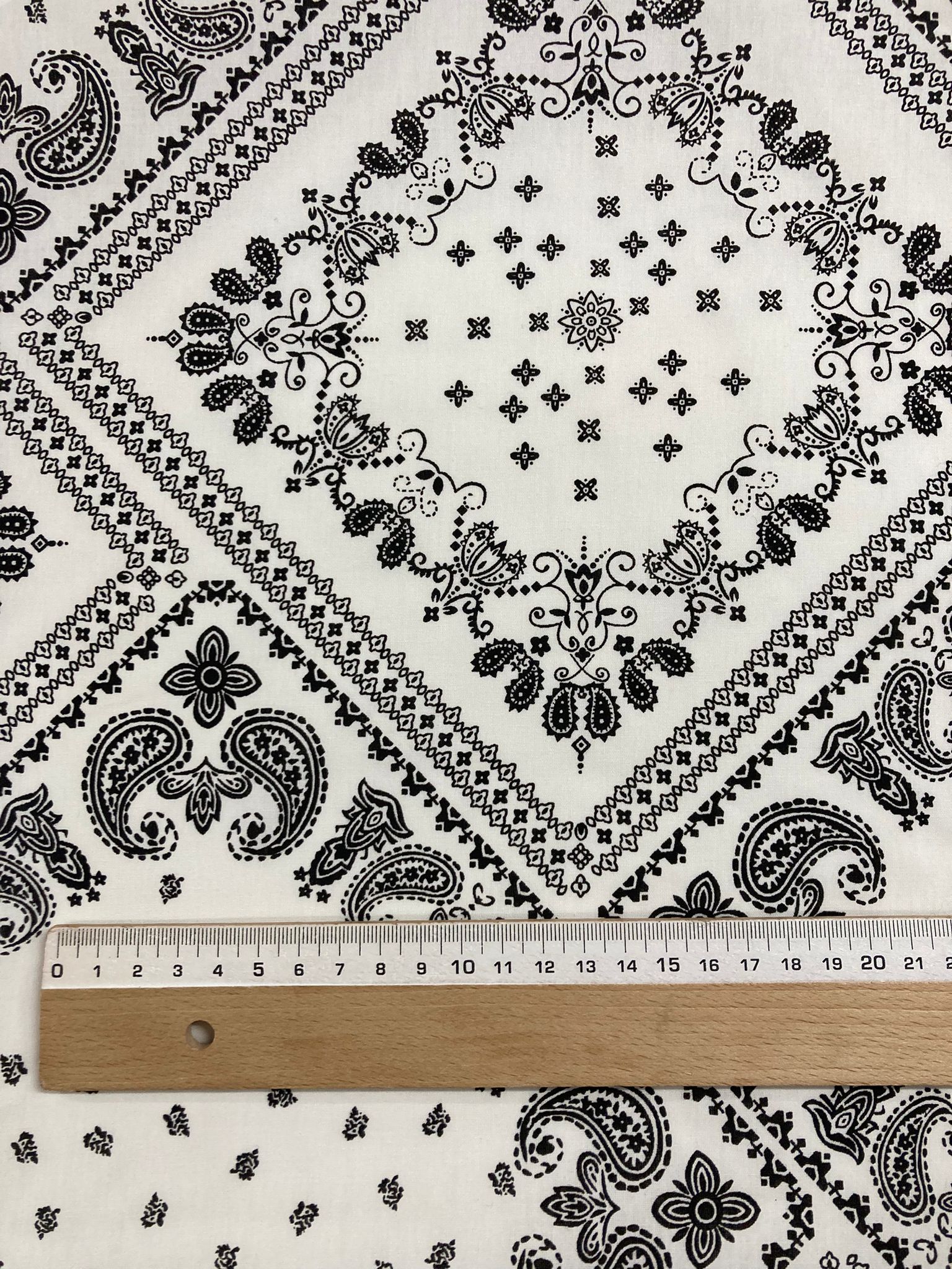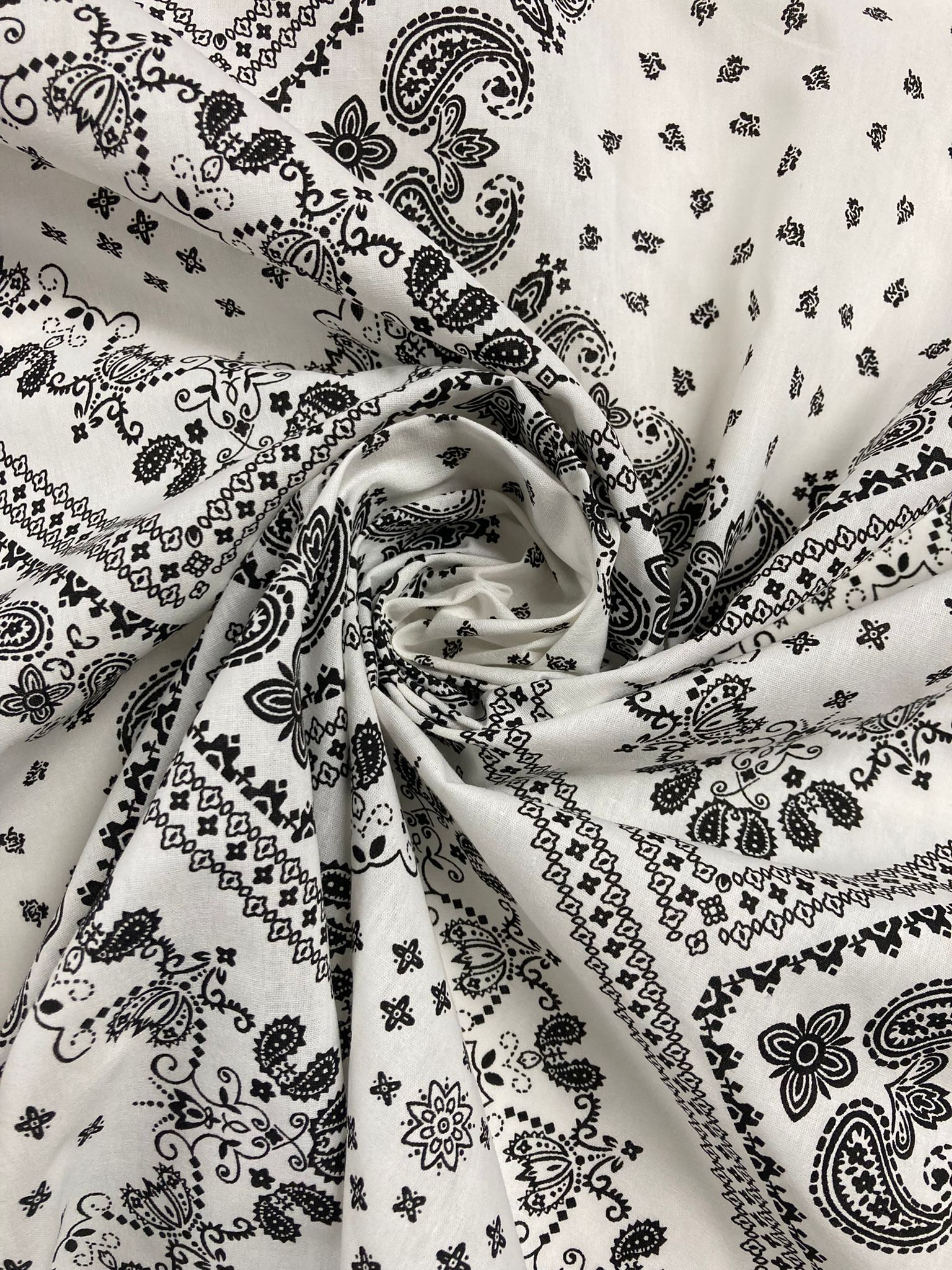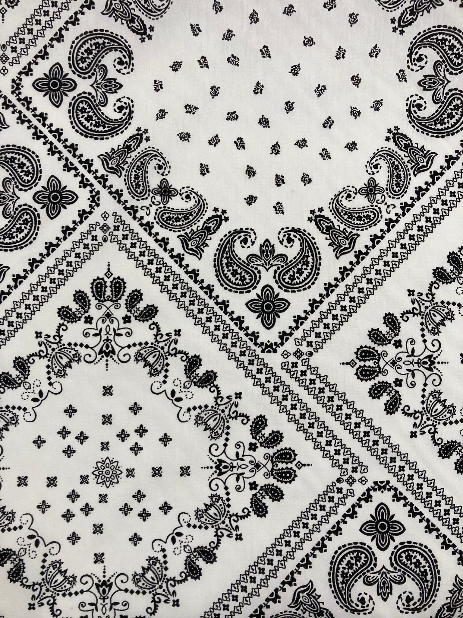 Algodón pañuelo blanco es una tela de algodón con fondo en blanco y estampado típico de pañuelo en color negro.