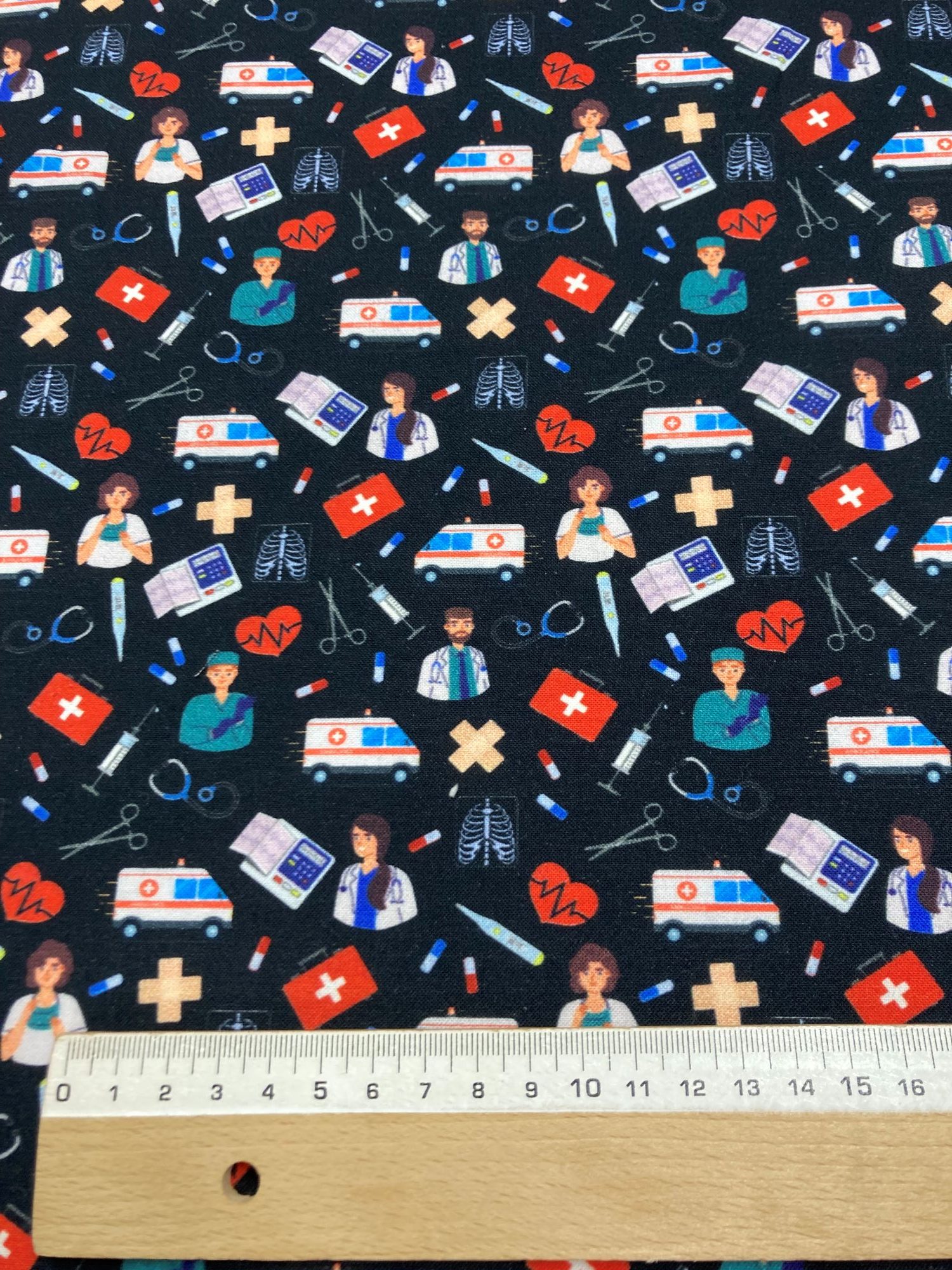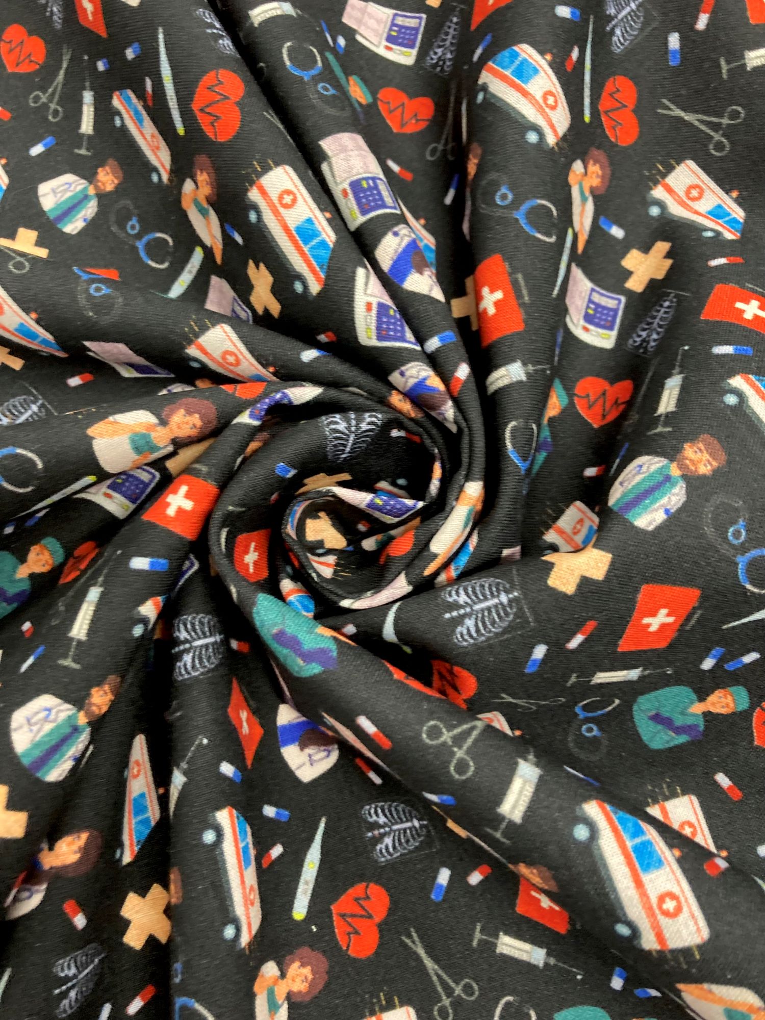 Esta tela de algodón tiene estampado de motivos sanitarios. Es ideal para confeccionar gorros quirúrgicos, salva bolsillos etc…