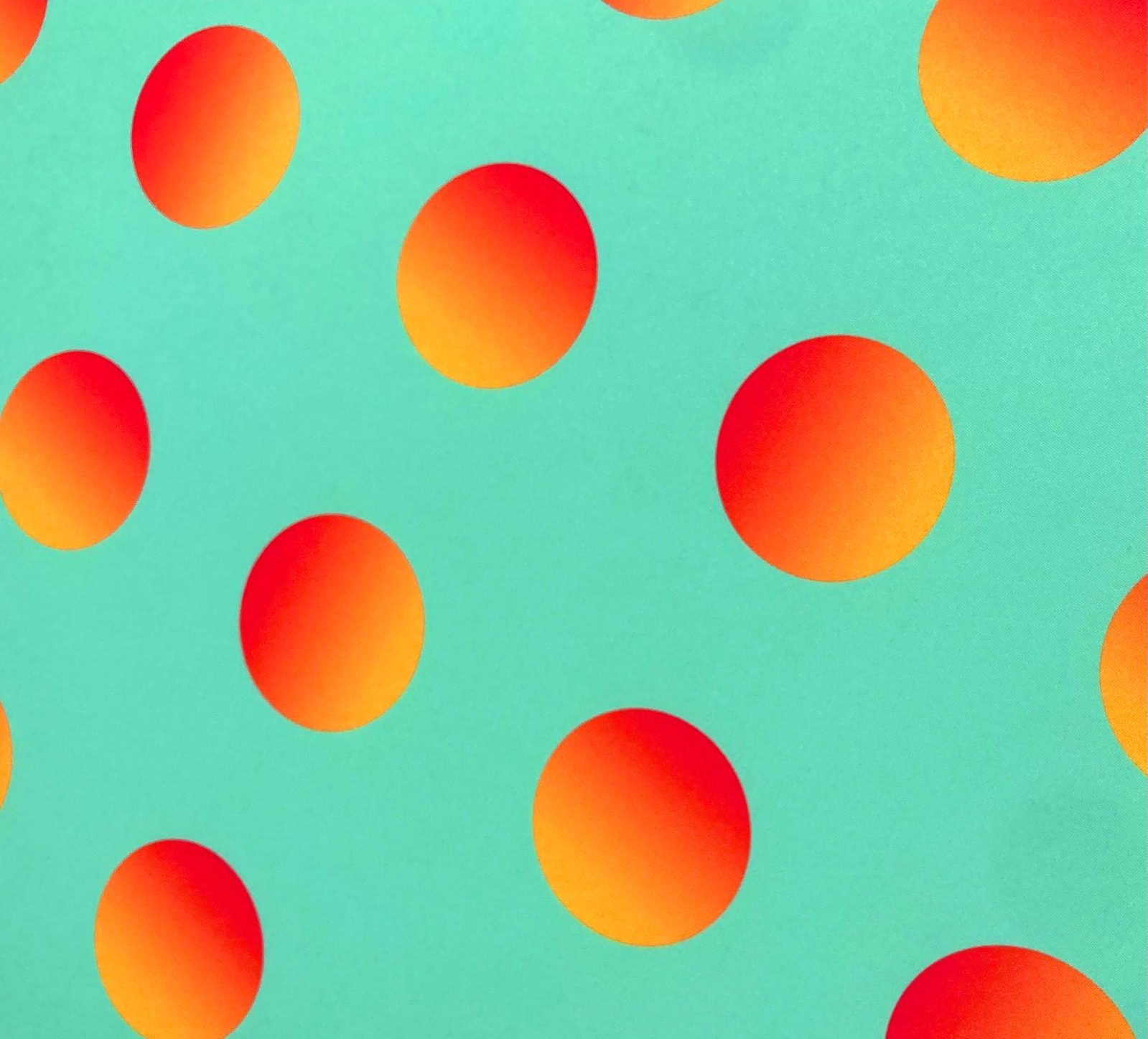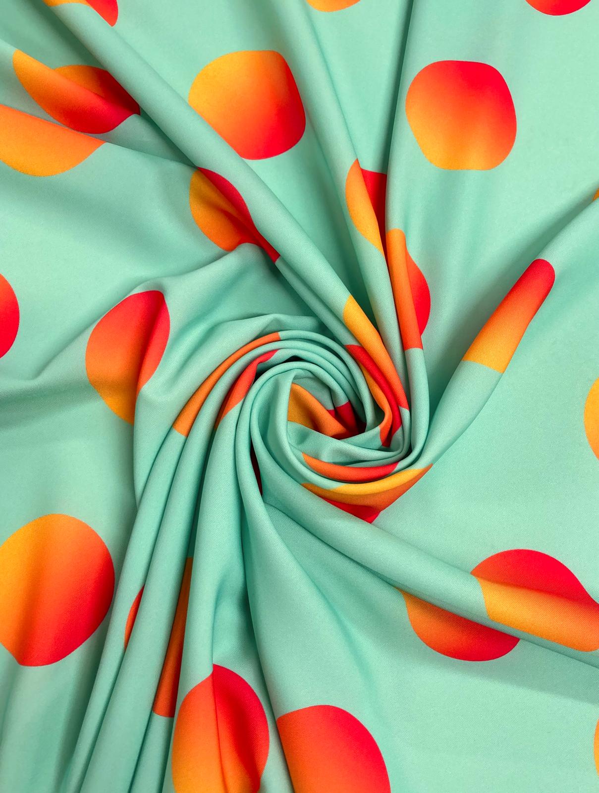 Este bielástico con lunares en tono naranja y amarillo haciendo degradado en fondo verde agua.