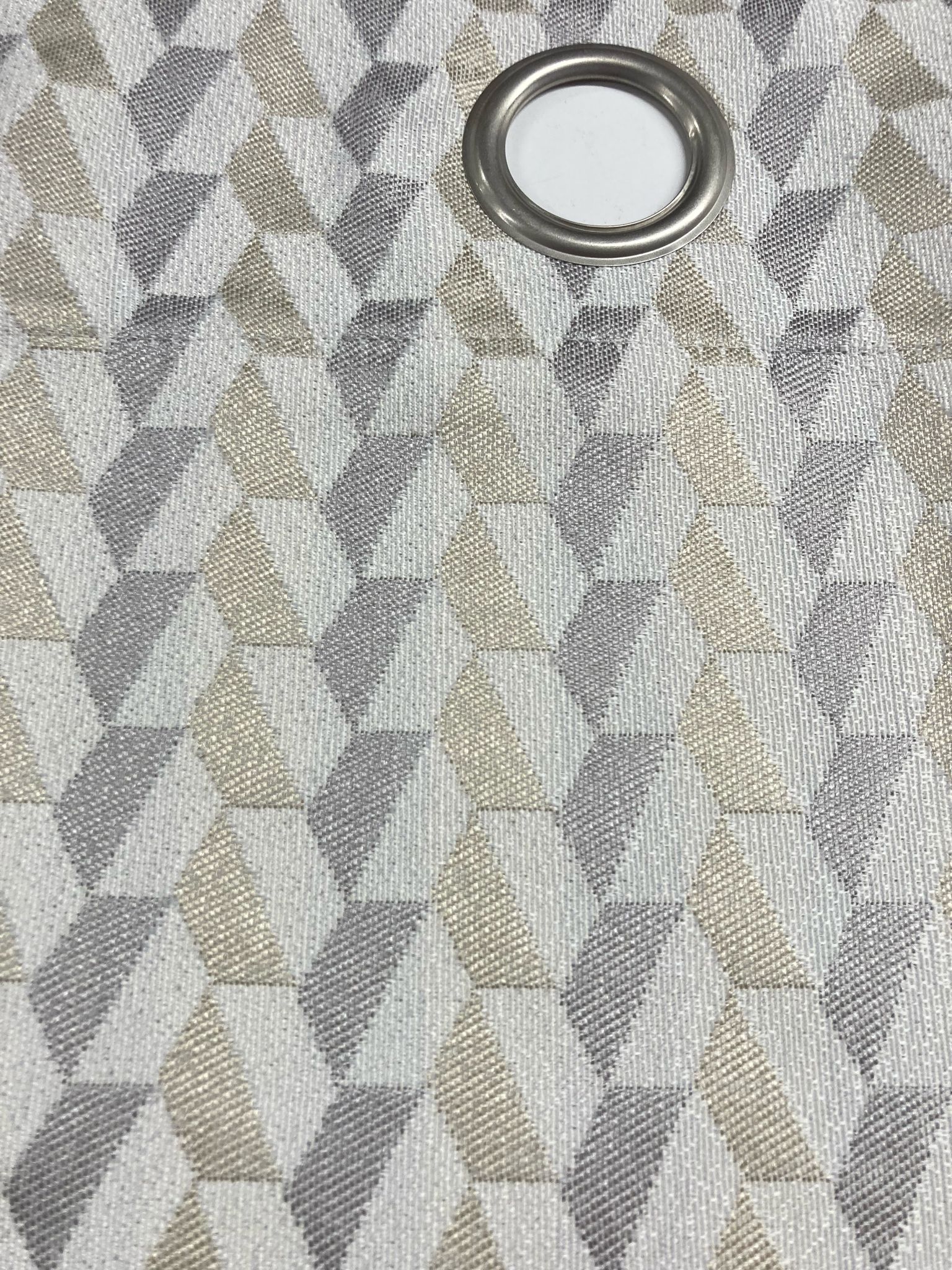 Cortina confeccionada  con estampado geometrico con ollaos de acero inoxidable.
