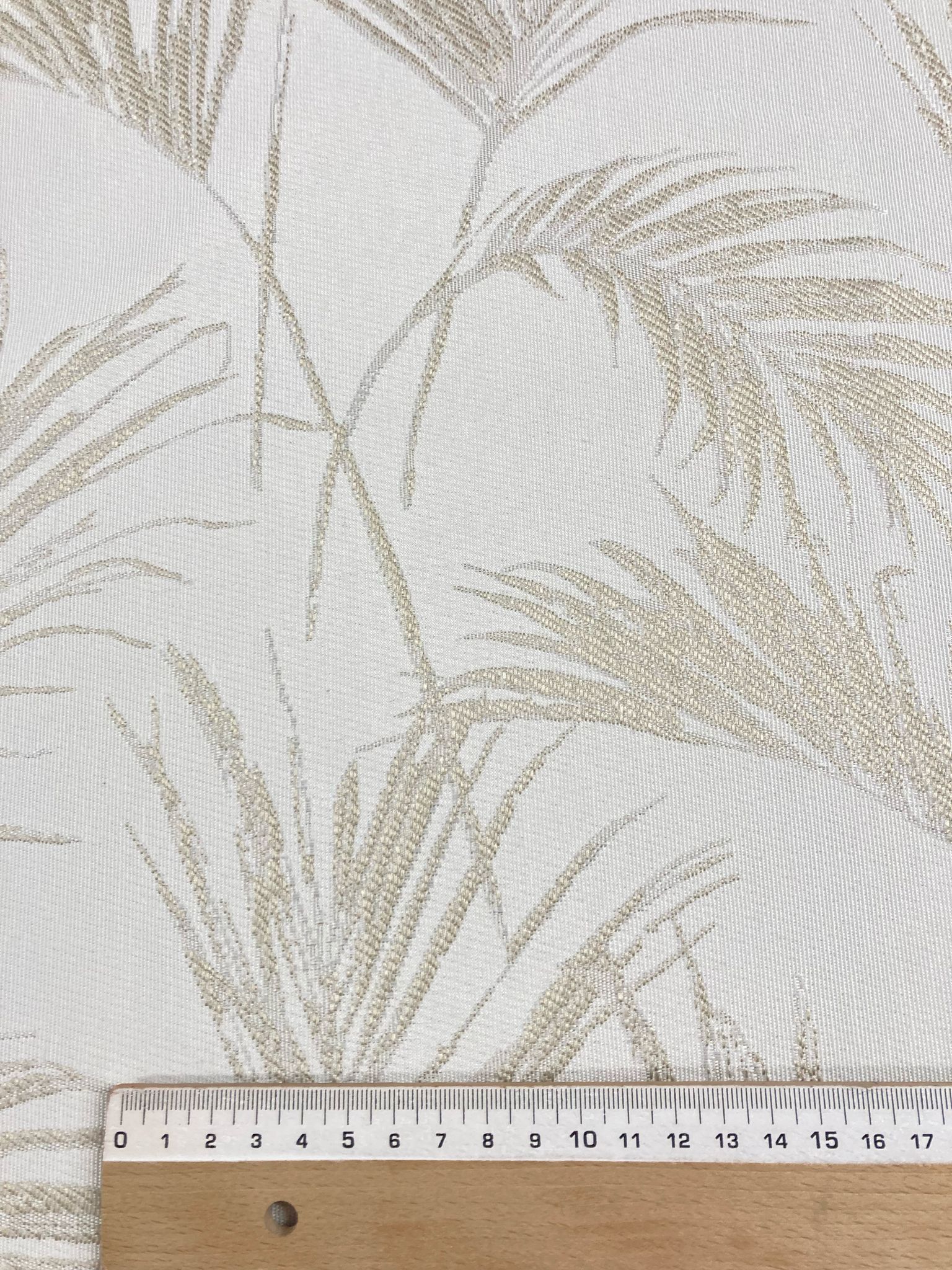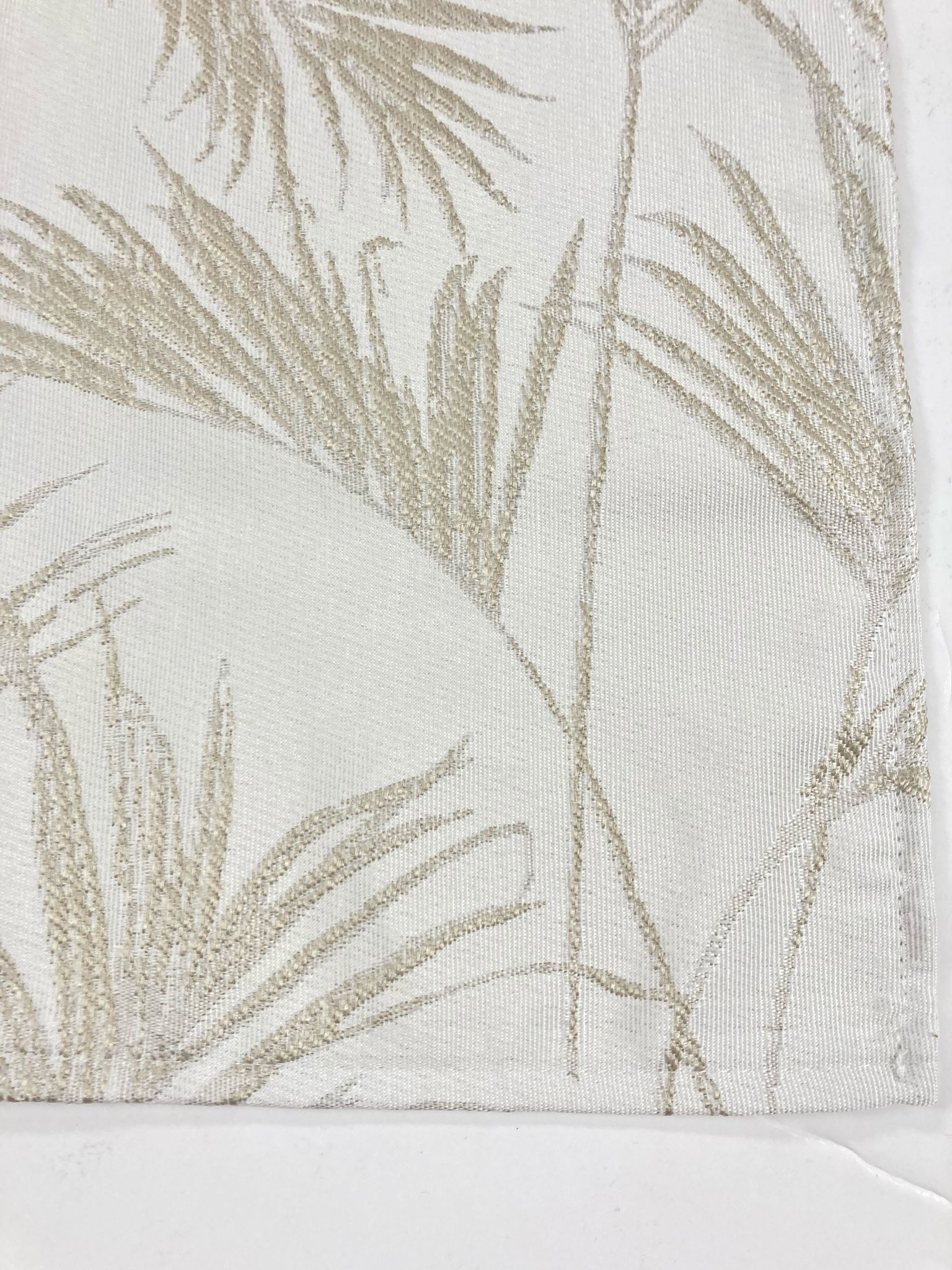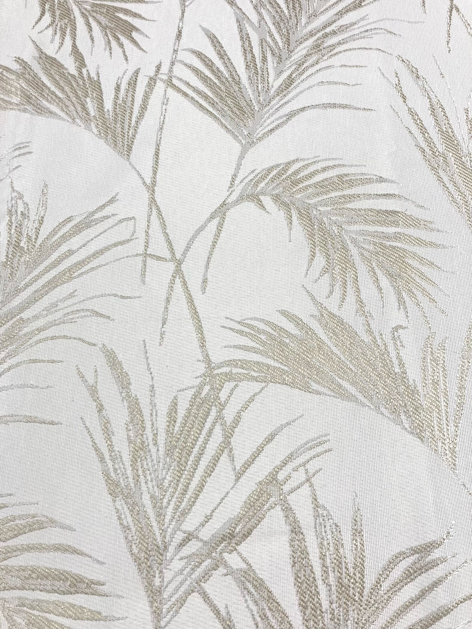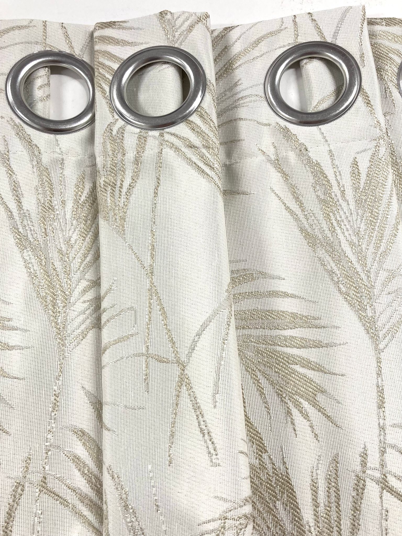 Cortina confeccionada con estampado de hojas tropicales con ollaos de acero inoxidable.
