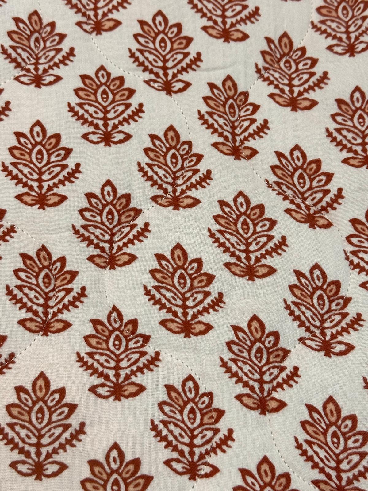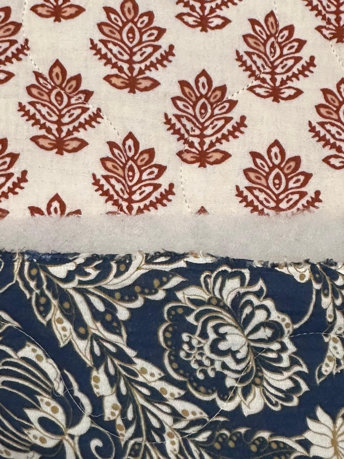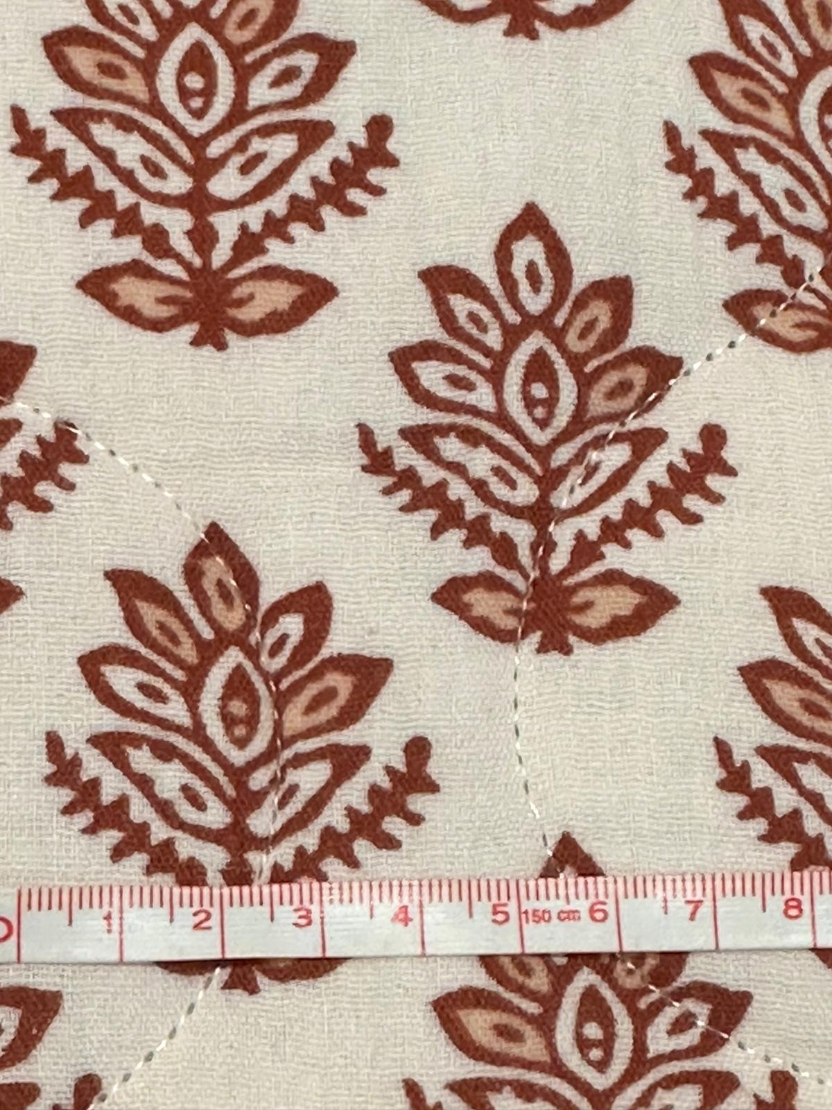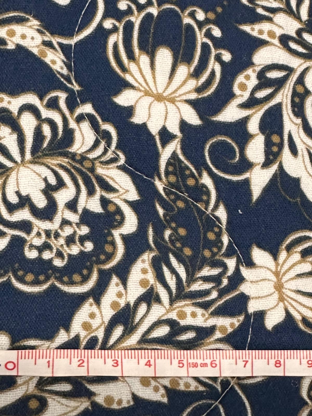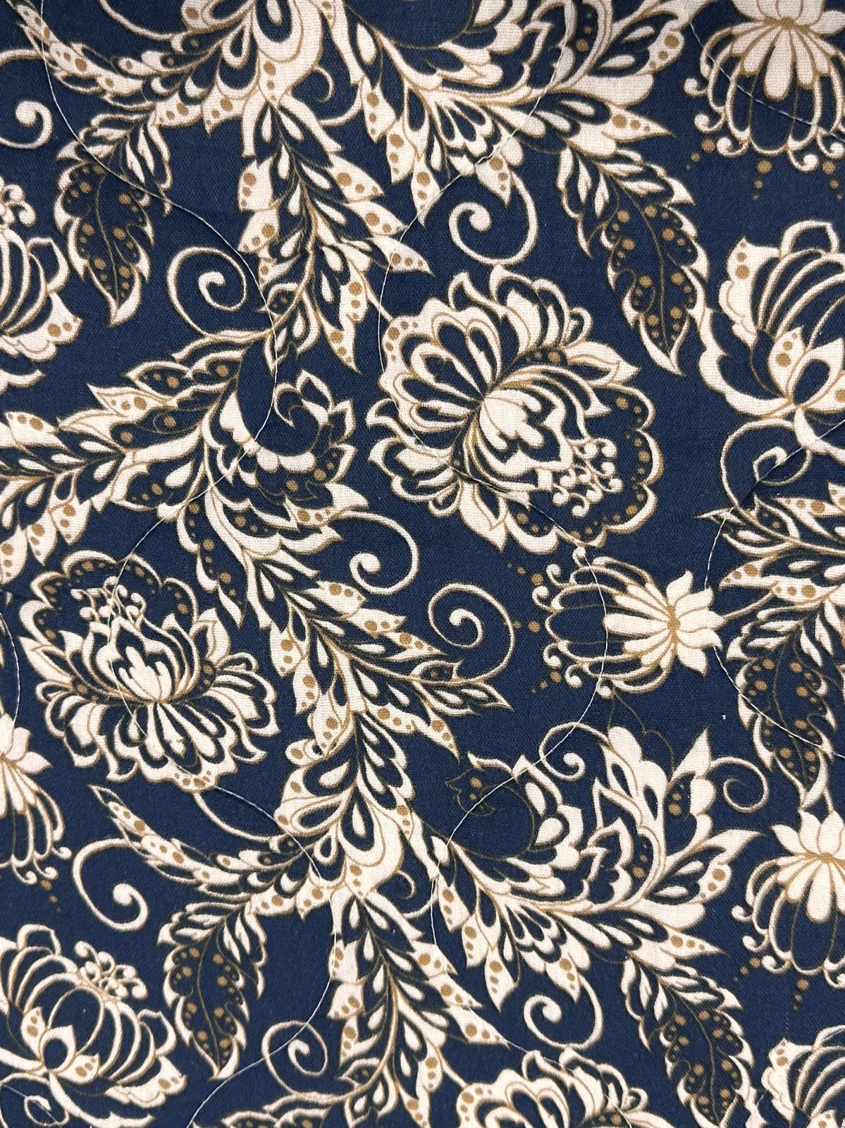 Doble gasa acolchada reversible Regina es una tela acolchada con un estampado reversible. Por un lado fondo crudo y estampado en color caldera y por el otro lado, diferente estampado en fondo azul marino y estampado en camel y blanco roto..
