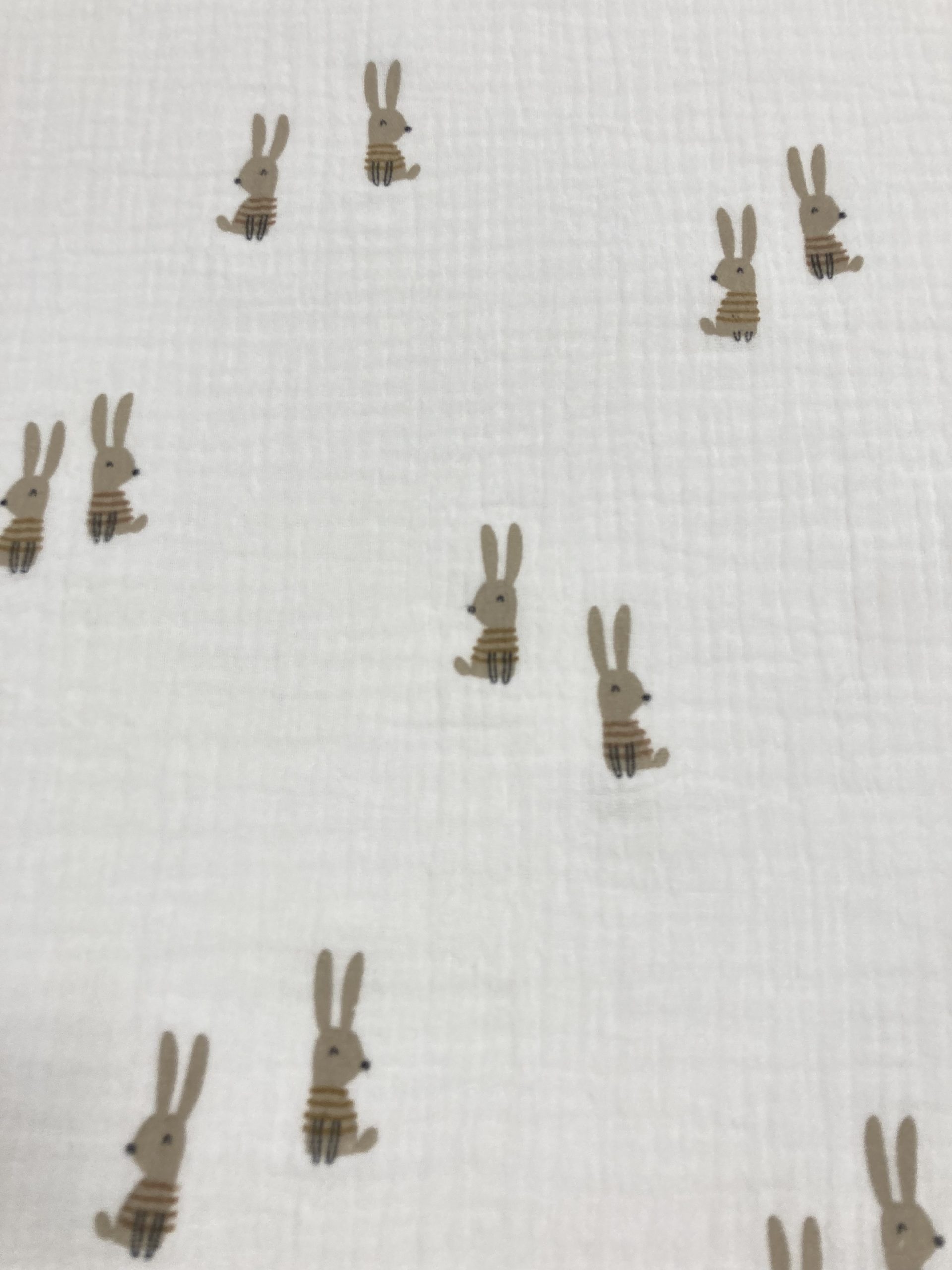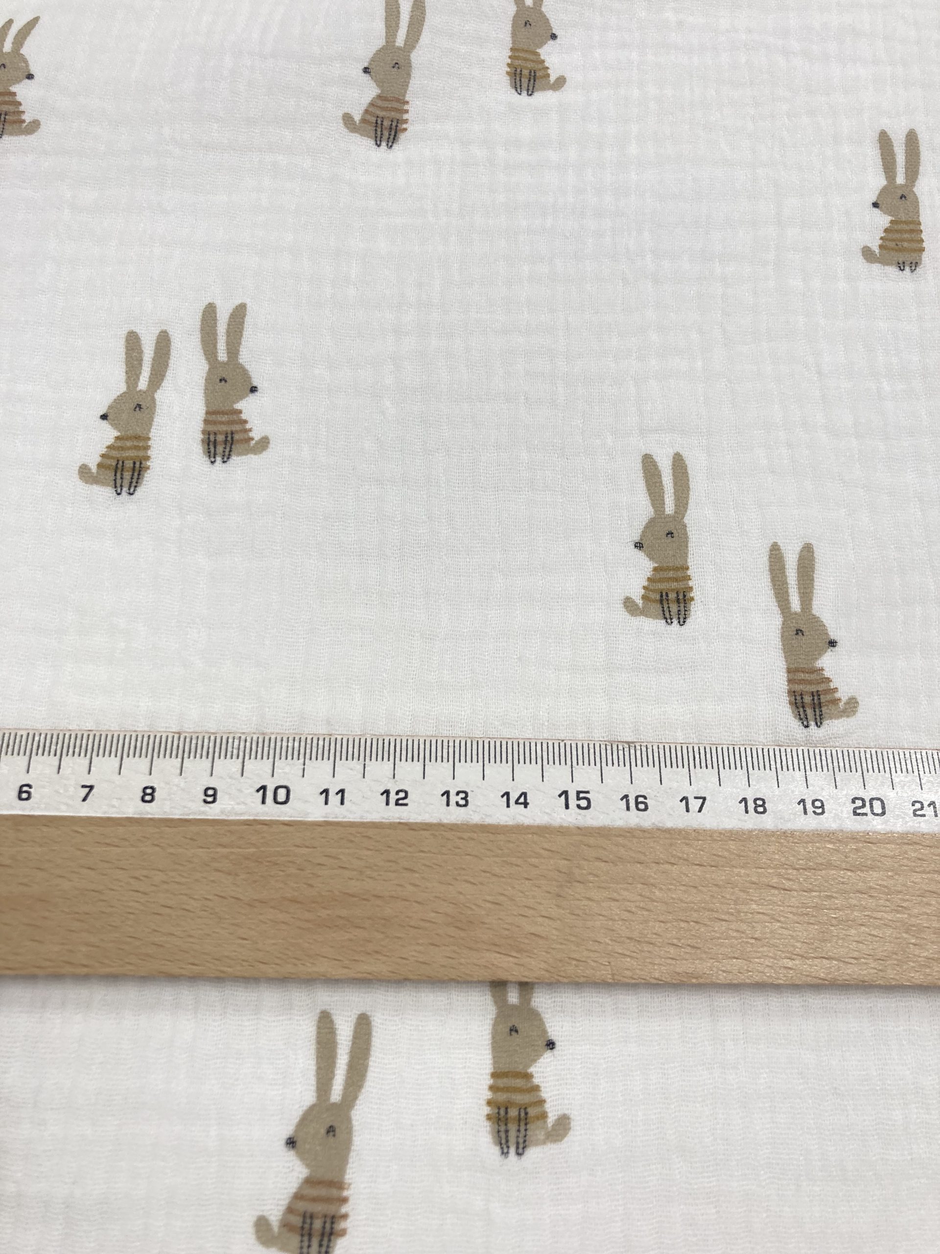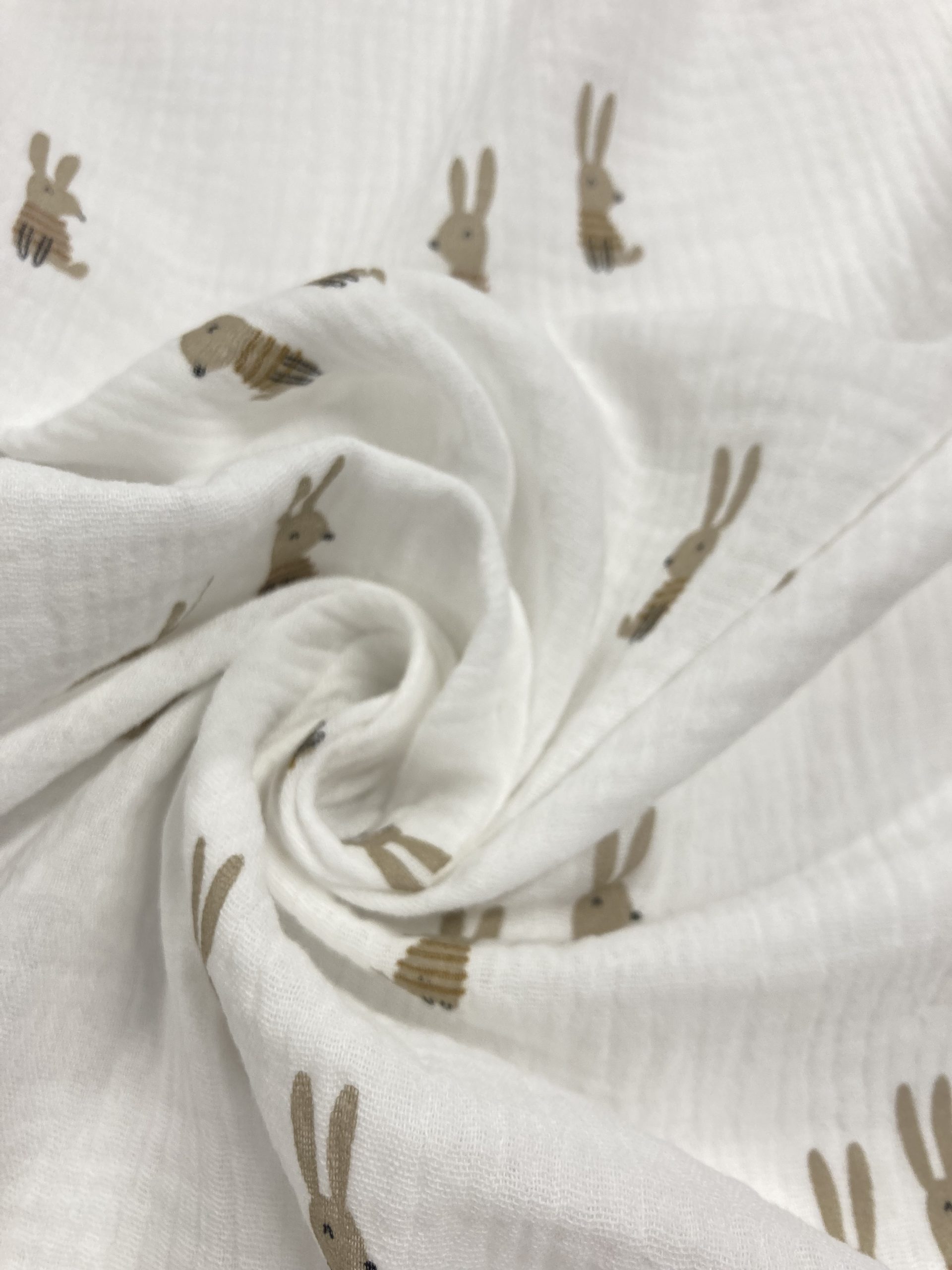Doble gasa duo conejitos es una tela con un estampado de conejitos en tono visón, marrón, camel y fondo blanco.