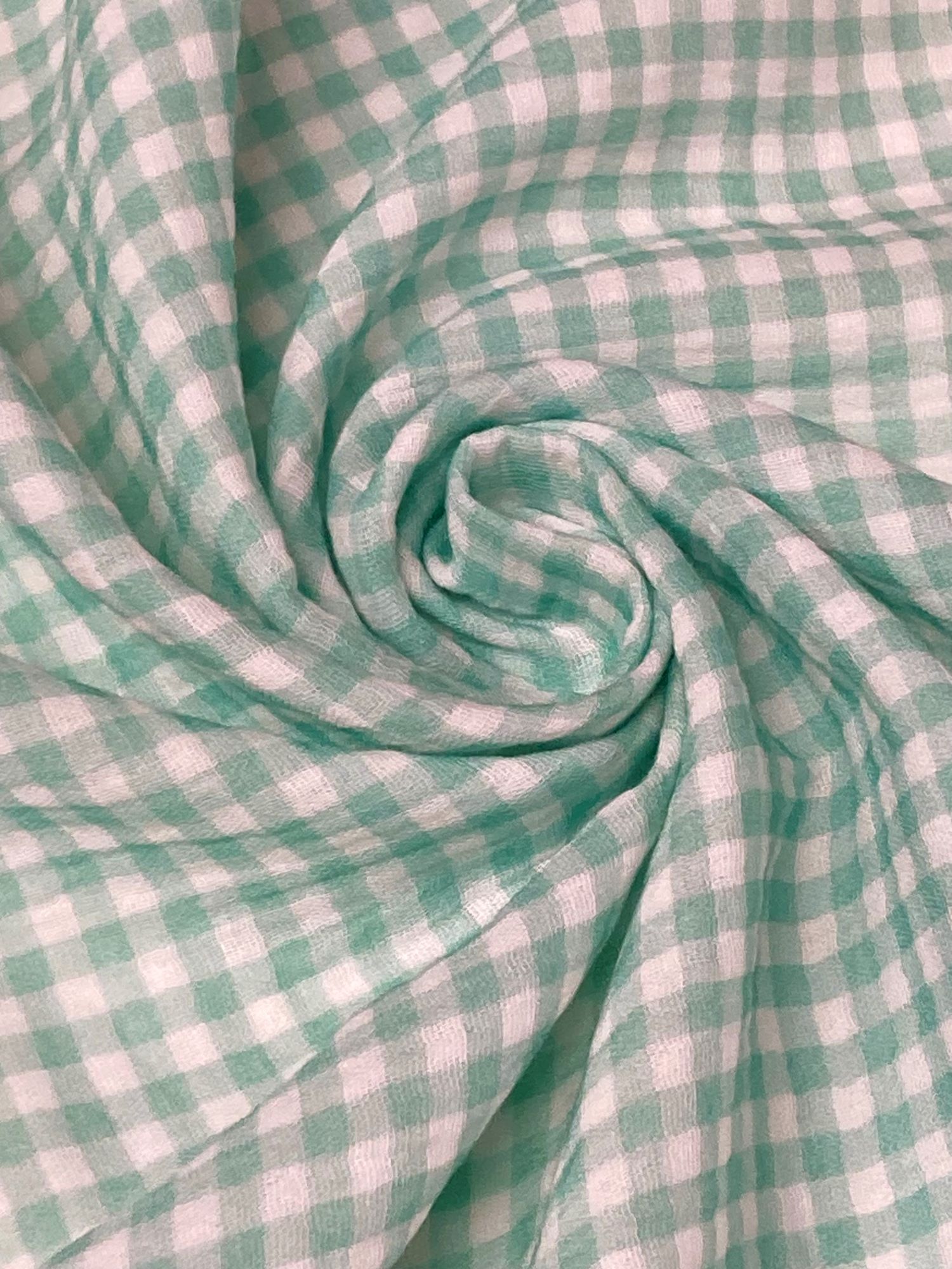 Doble gasa Katy cuadros agua es una tela con un estampado de cuadros de vichy en color verde agua.