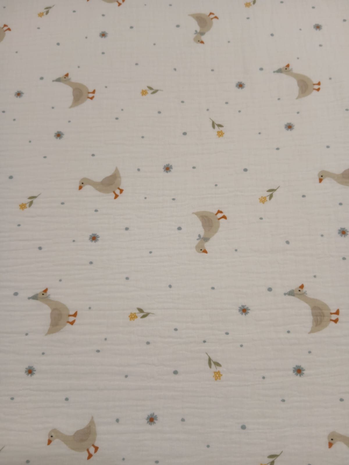 Doble gasa ocas azul es una tela de doble gasa con un estampado de ocas en tonos taupé y hojas azul empolvado sobre fondo blanco roto.
