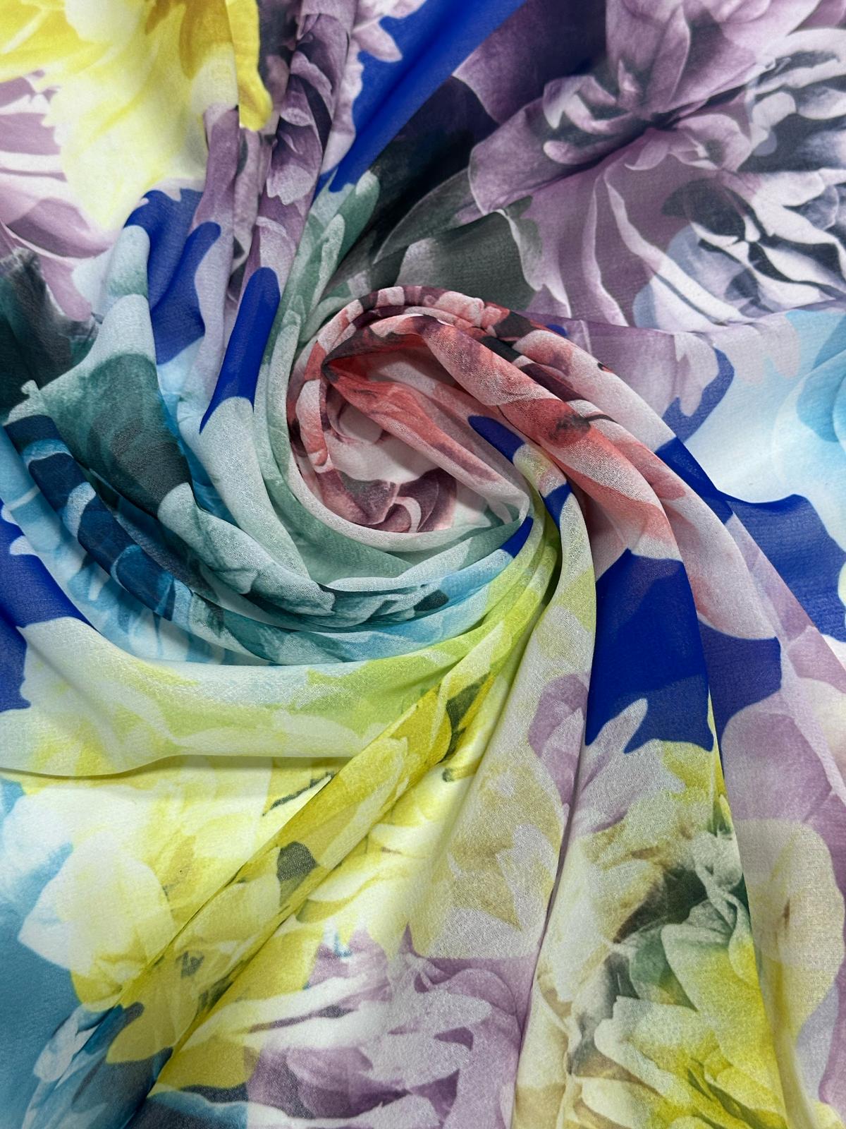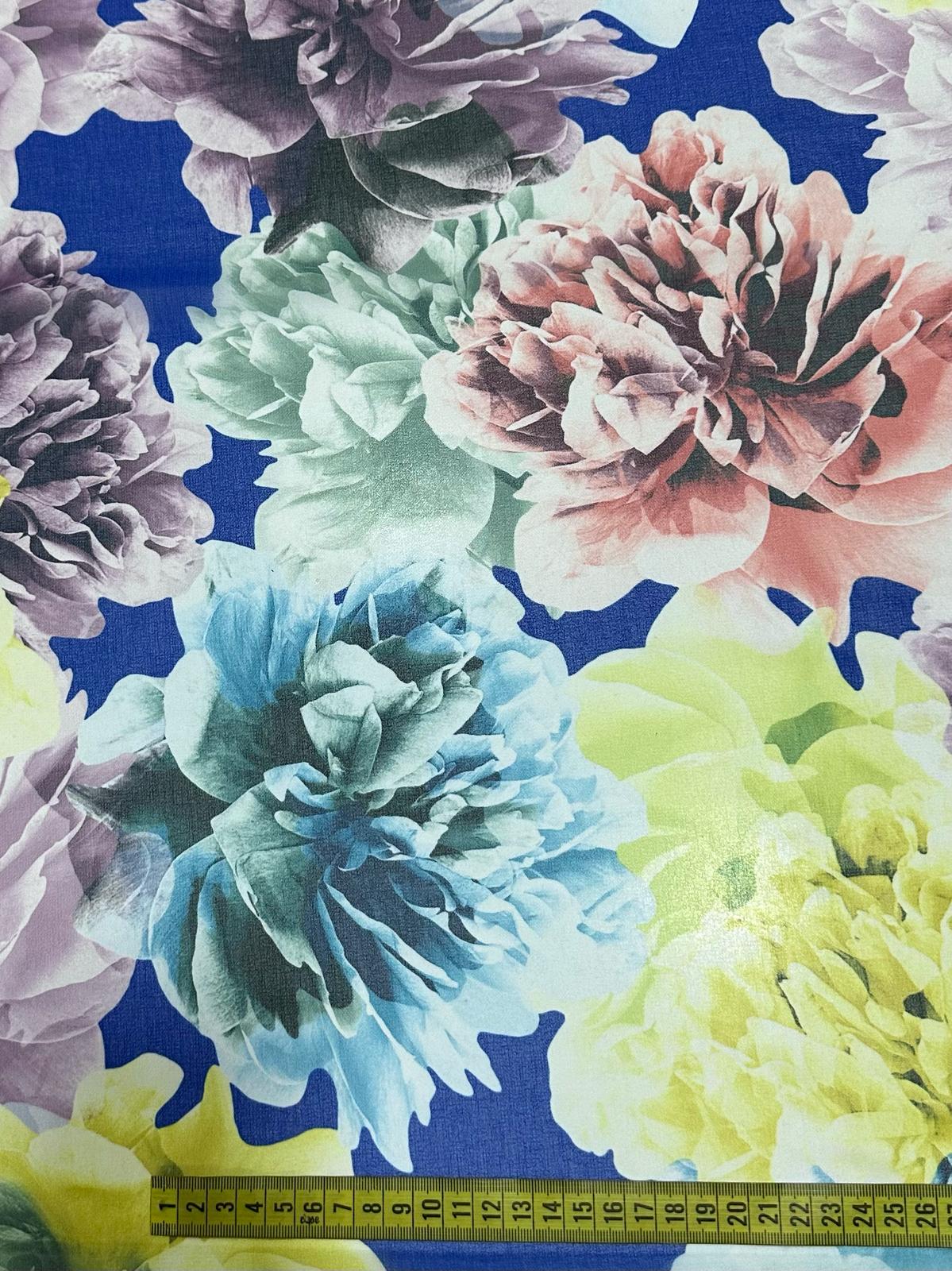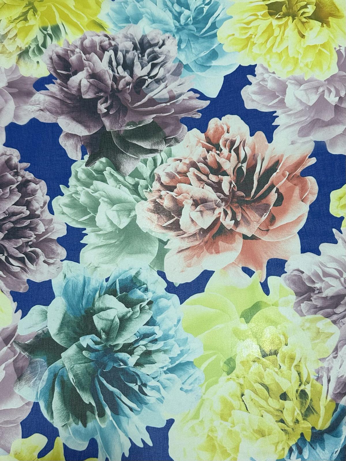 Tela de gasa en color azulón con estampado floral, con mucha caída ideal para vestidos largos, blusas, es bastante transparente