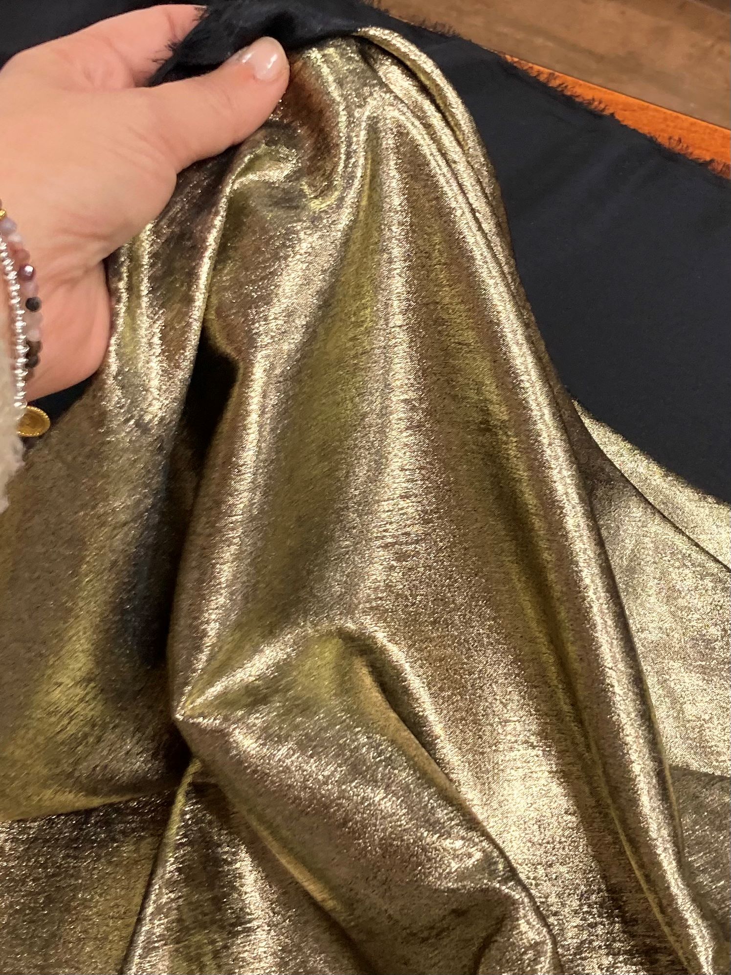 Esta tela de poliester100% con hilo de lurex plateado es ideal para la confección de un sin fin de creaciones como prendas de fiesta o vestir.