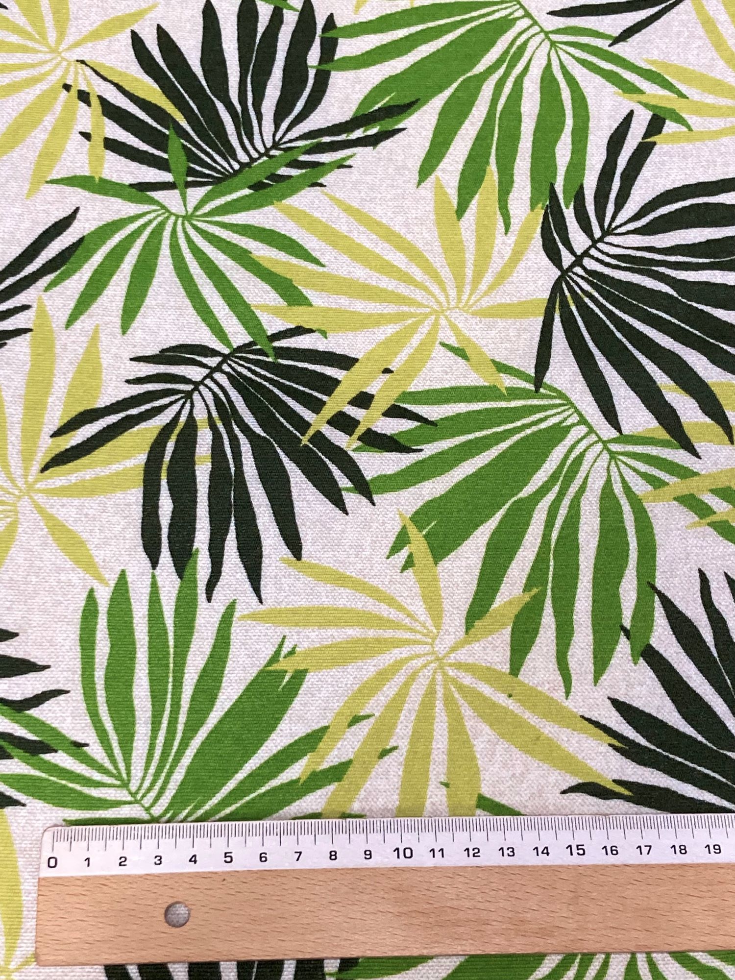 Uso: Loneta estampada con hojas en verde botella, verde croma y verde pistacho sobre fondo jaspeado crudo/lino , ideal para ropa para el hogar, cojines, cortinas, bolsas, etc...