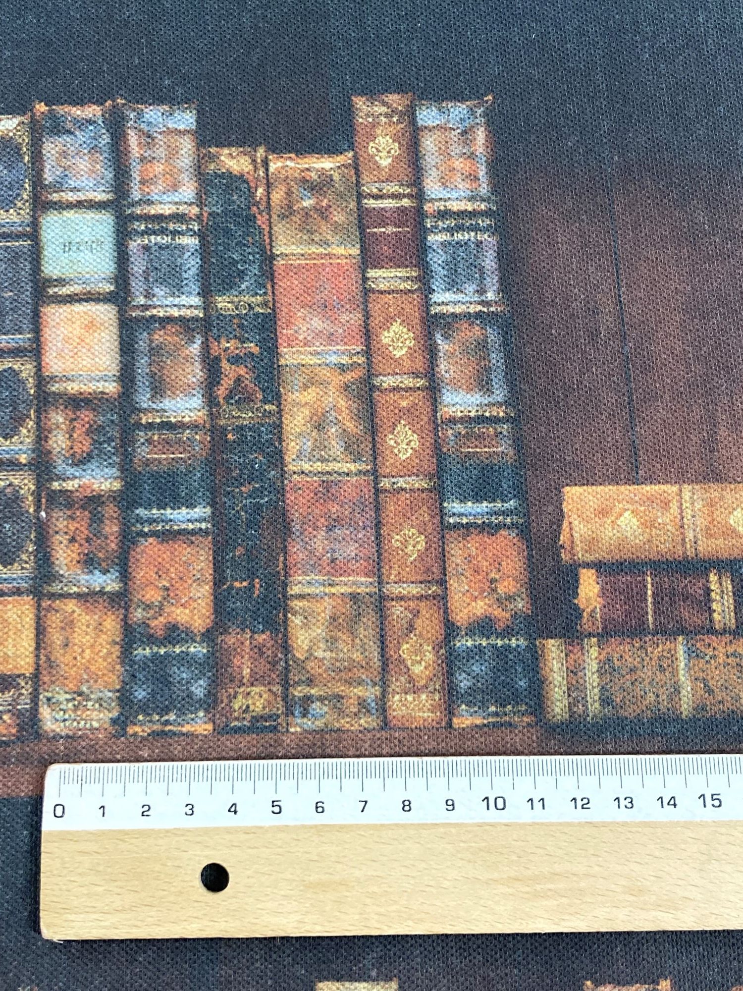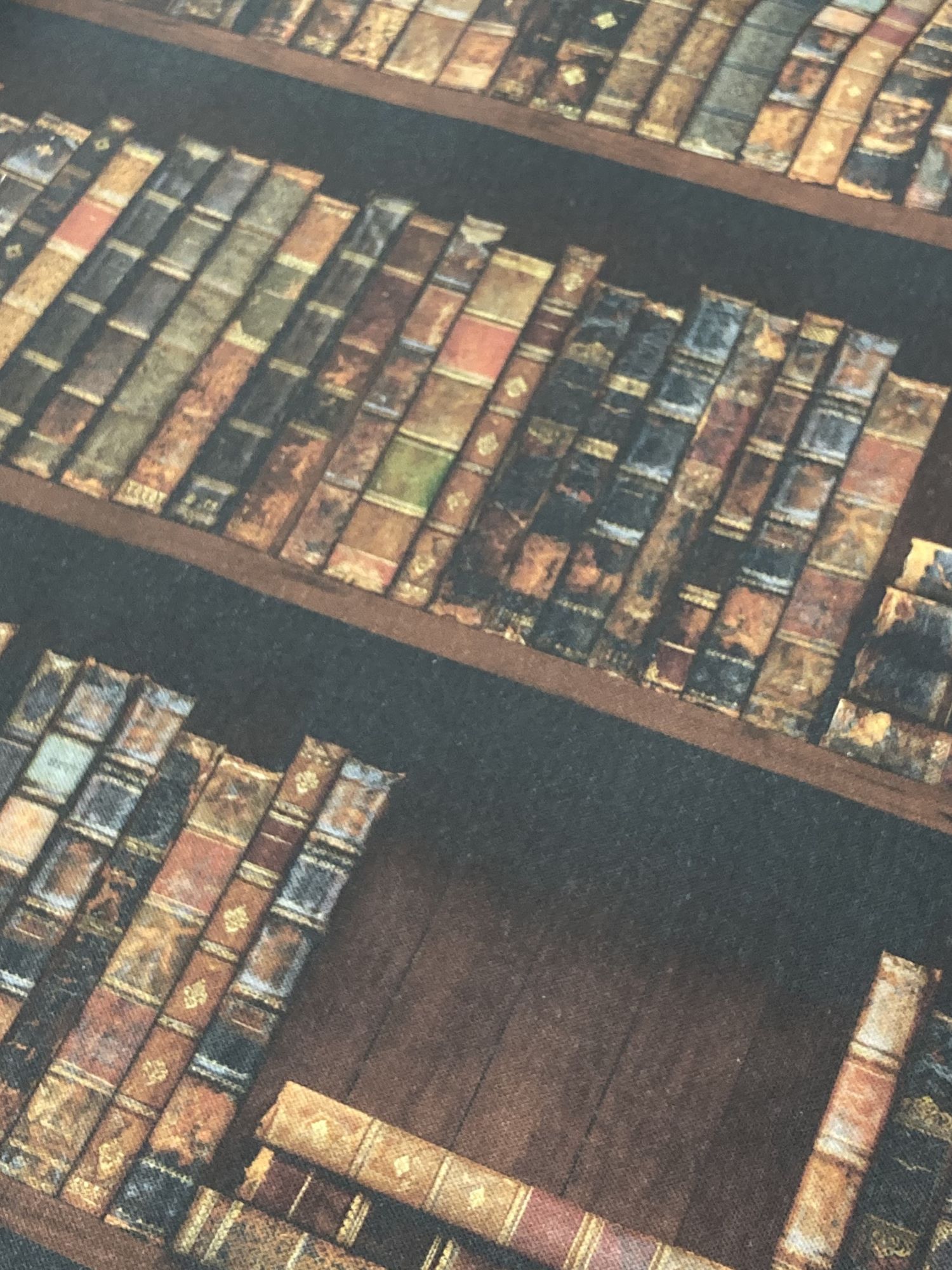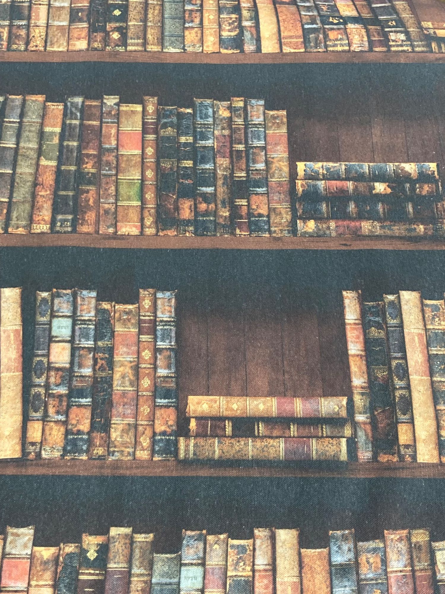 Panamá Bibioteca es una tela estampada con fondo en rombo negro y blanco y hojas verde.