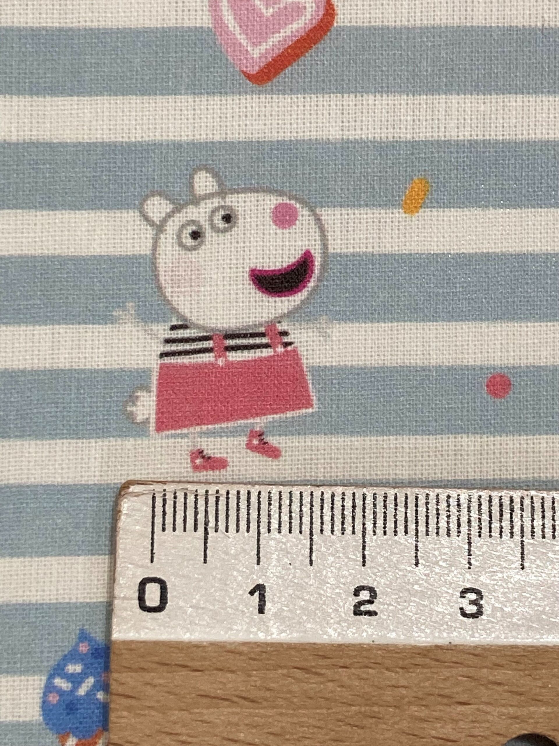 Tela de Peppa pig de algodón con fondo de rayas en blanco y azul celeste.