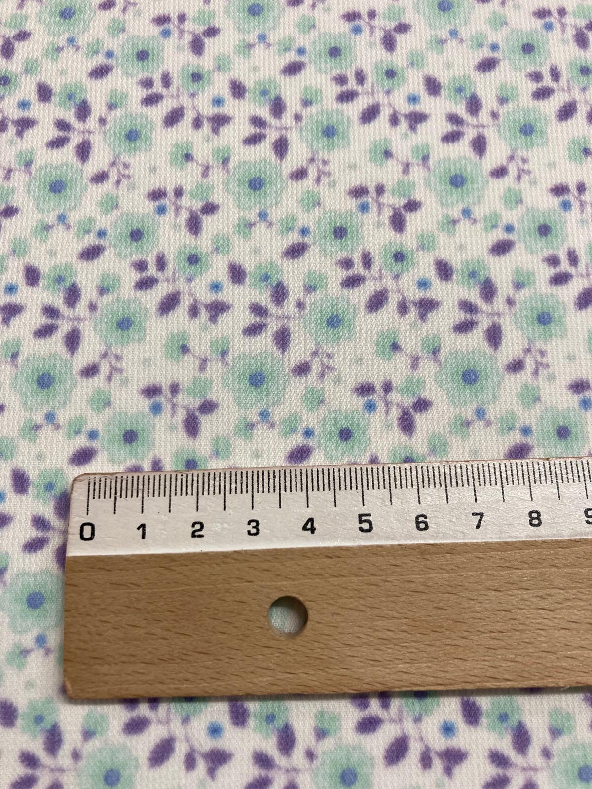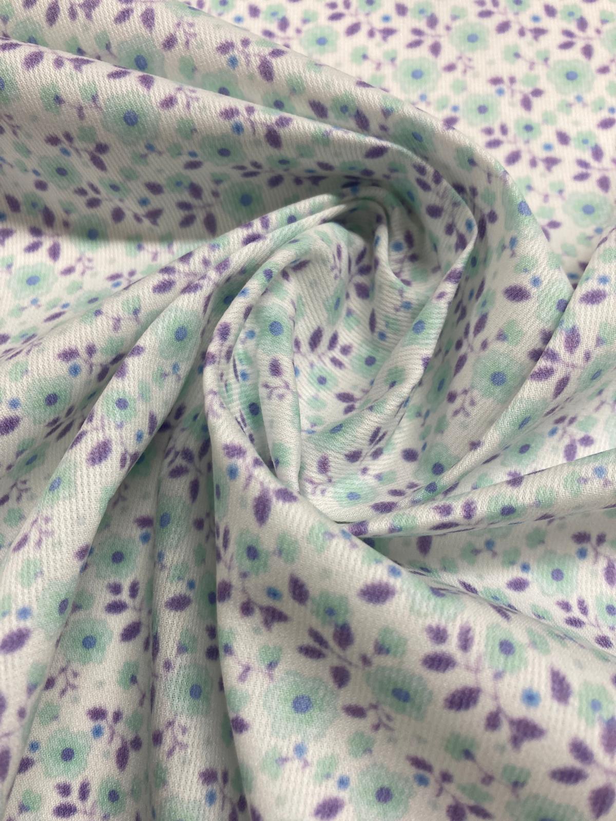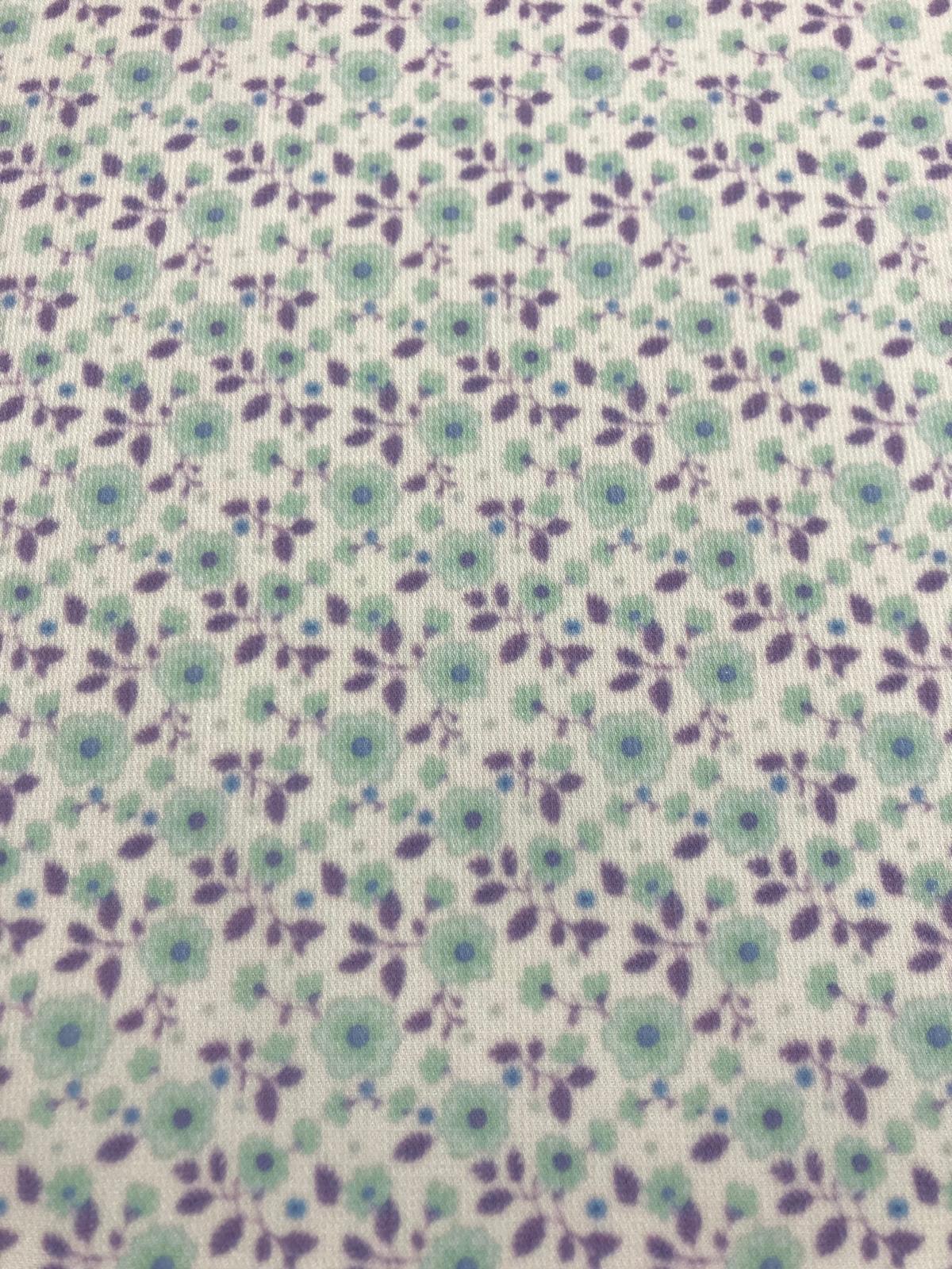 Bonito piqué de canutillo con un estampado de flores verde agua con hojitas lila