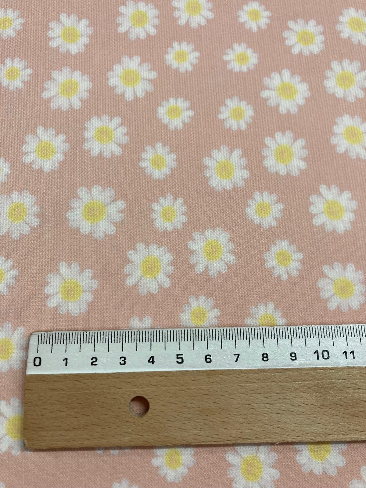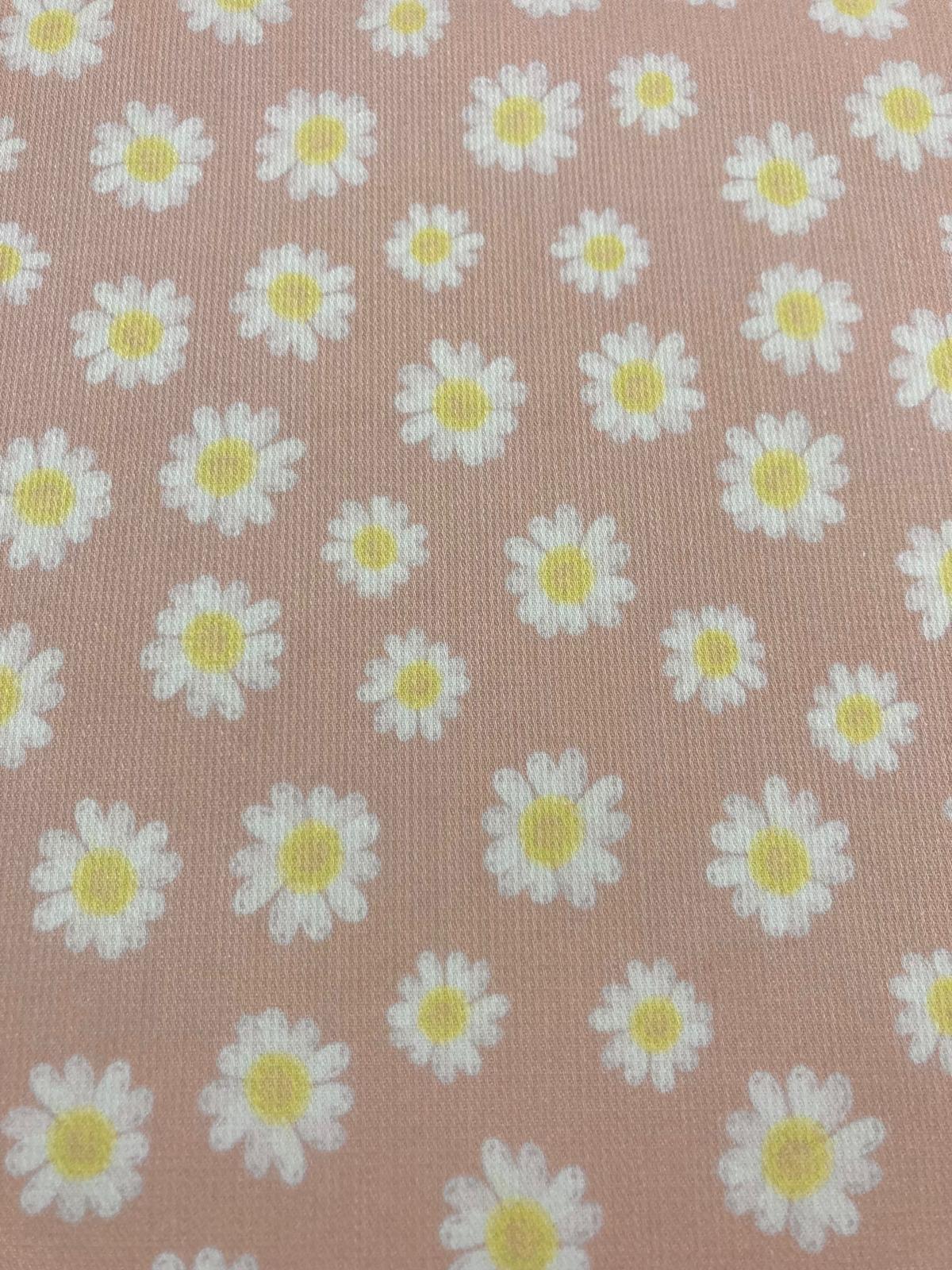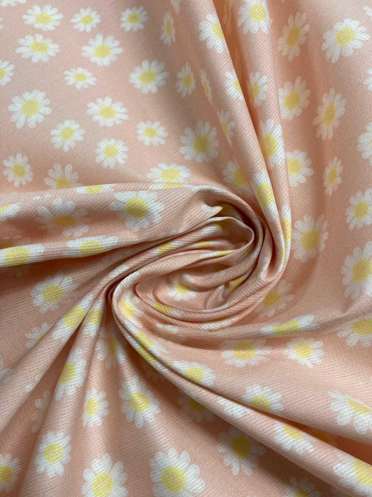 Bonito pique de canutillo con un estampado de lo más simpático de margaritas en tonos blancos y amarillo sobre fondo salmón clarito