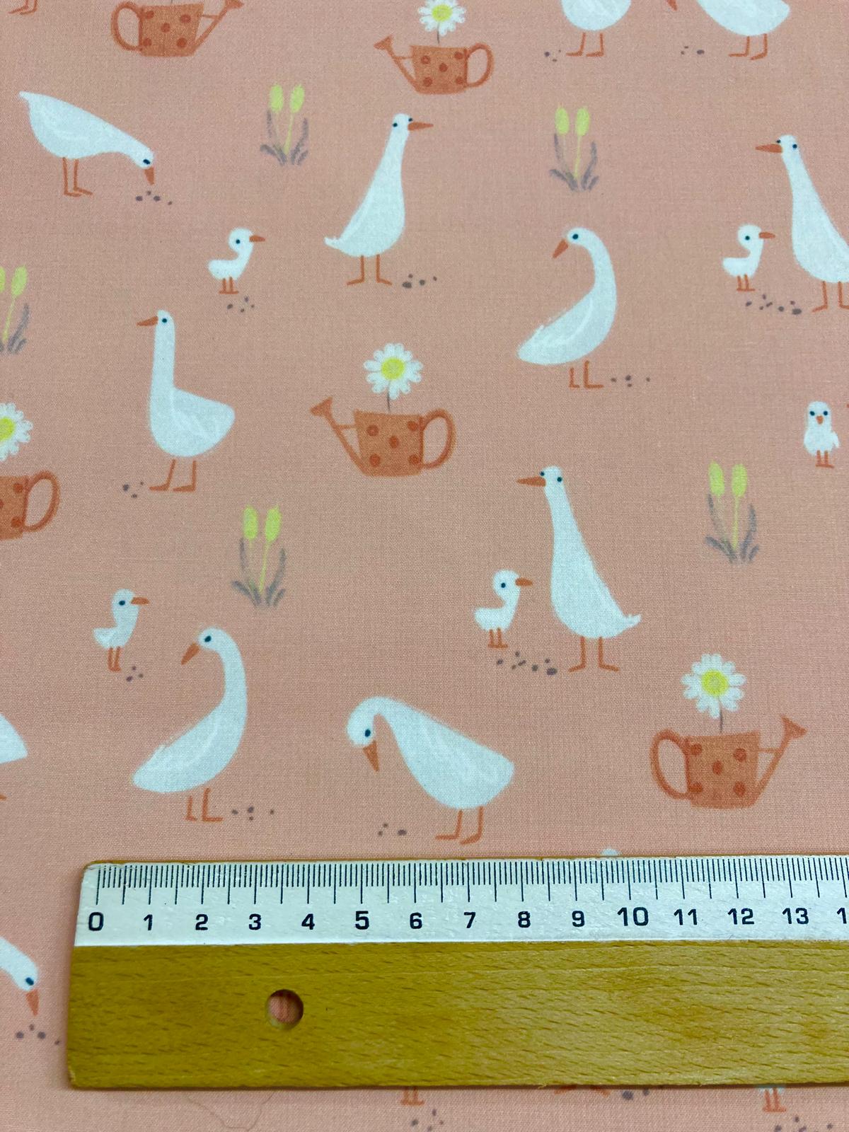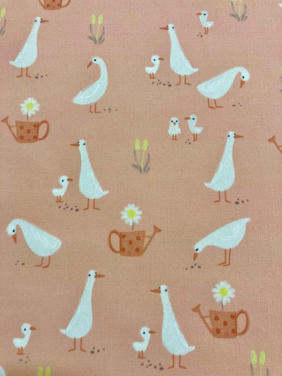 Bonito pique de canutillo con estampado de patitos y flores en tonos blancos, amarillo y naranja sobre fondo salmón clarito