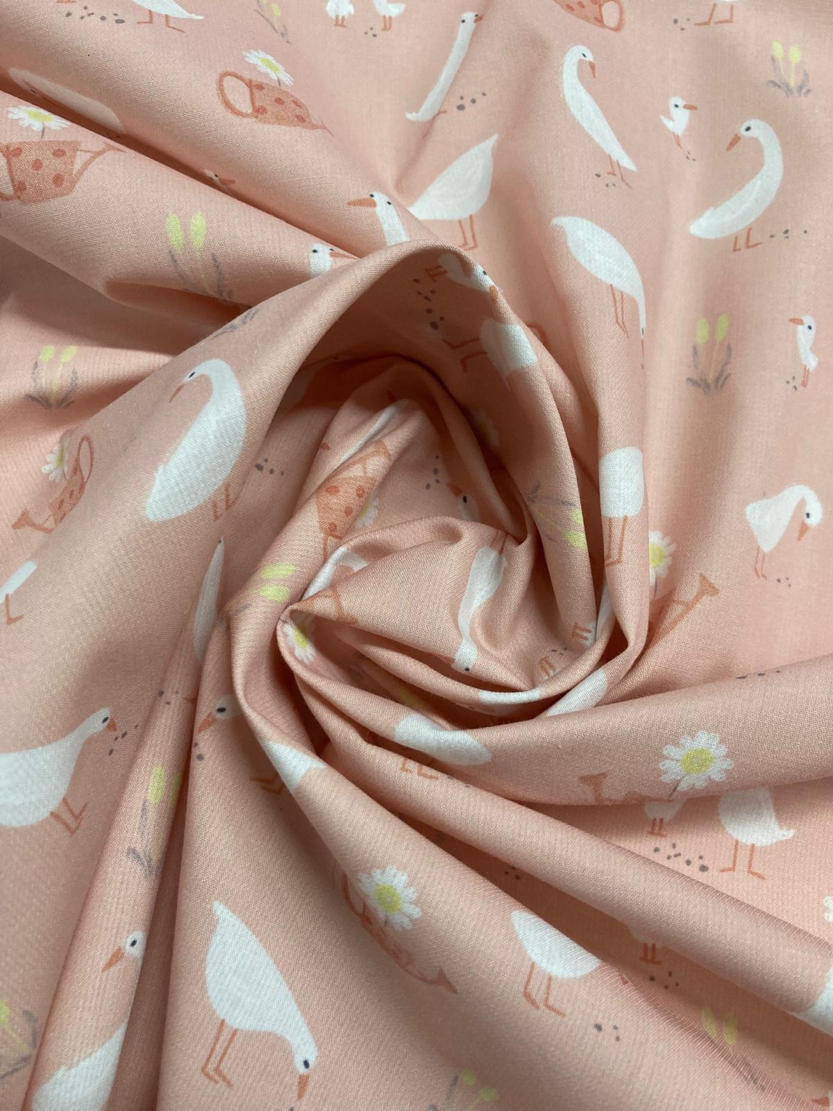 Bonito pique de canutillo con un estampado de lo más simpático de patitos y flores en tonos blancos, amarillo y naranja sobre fondo salmón clarito