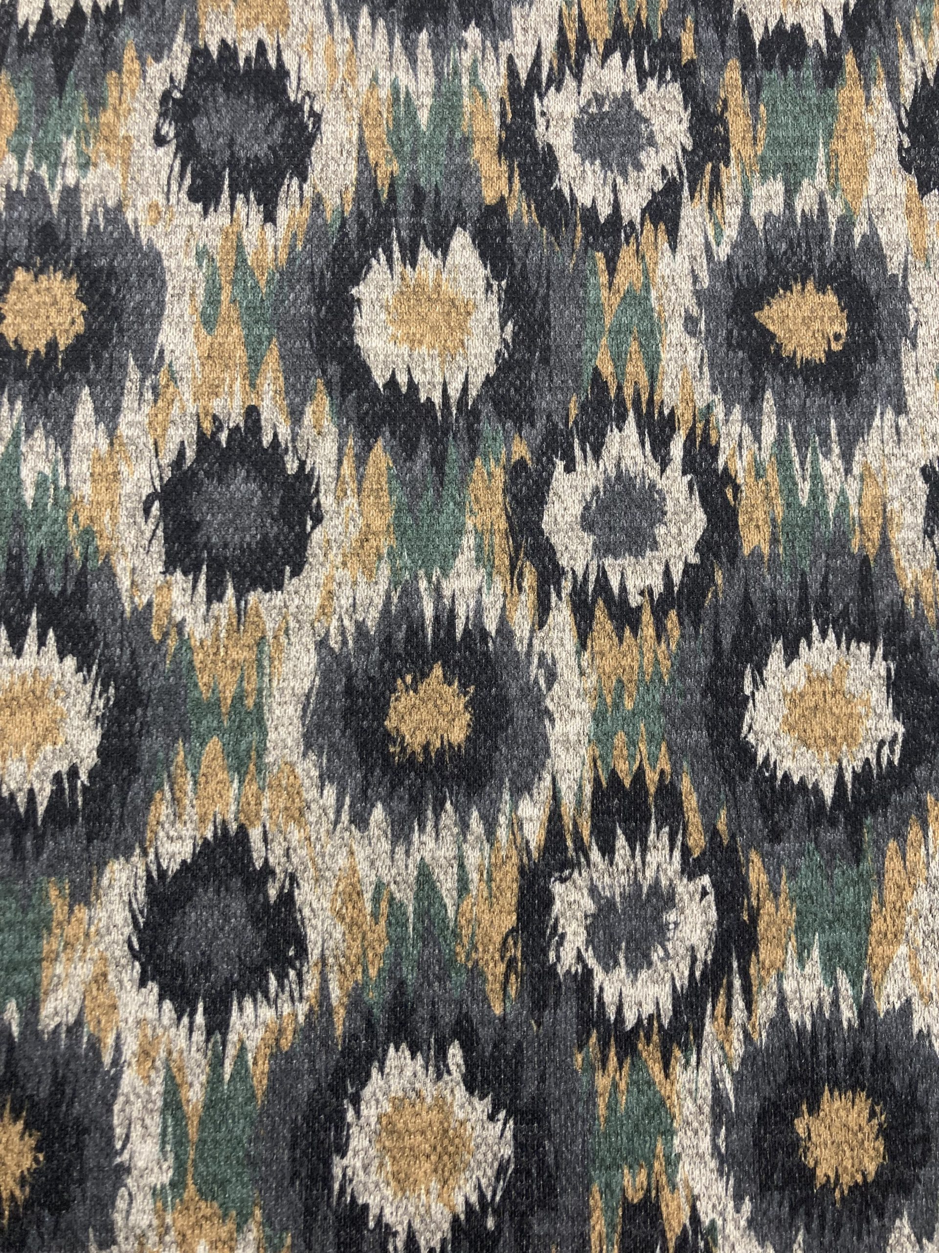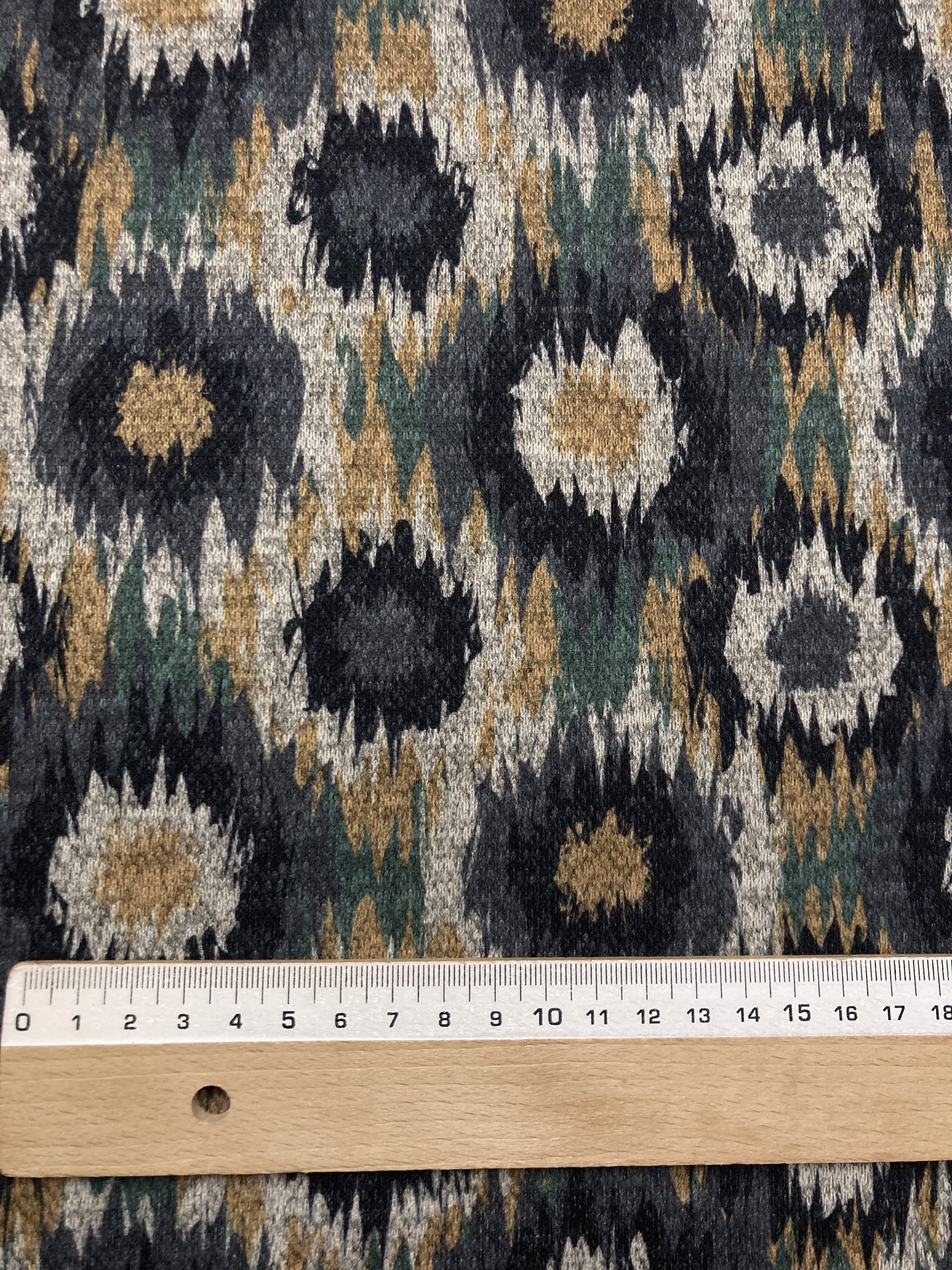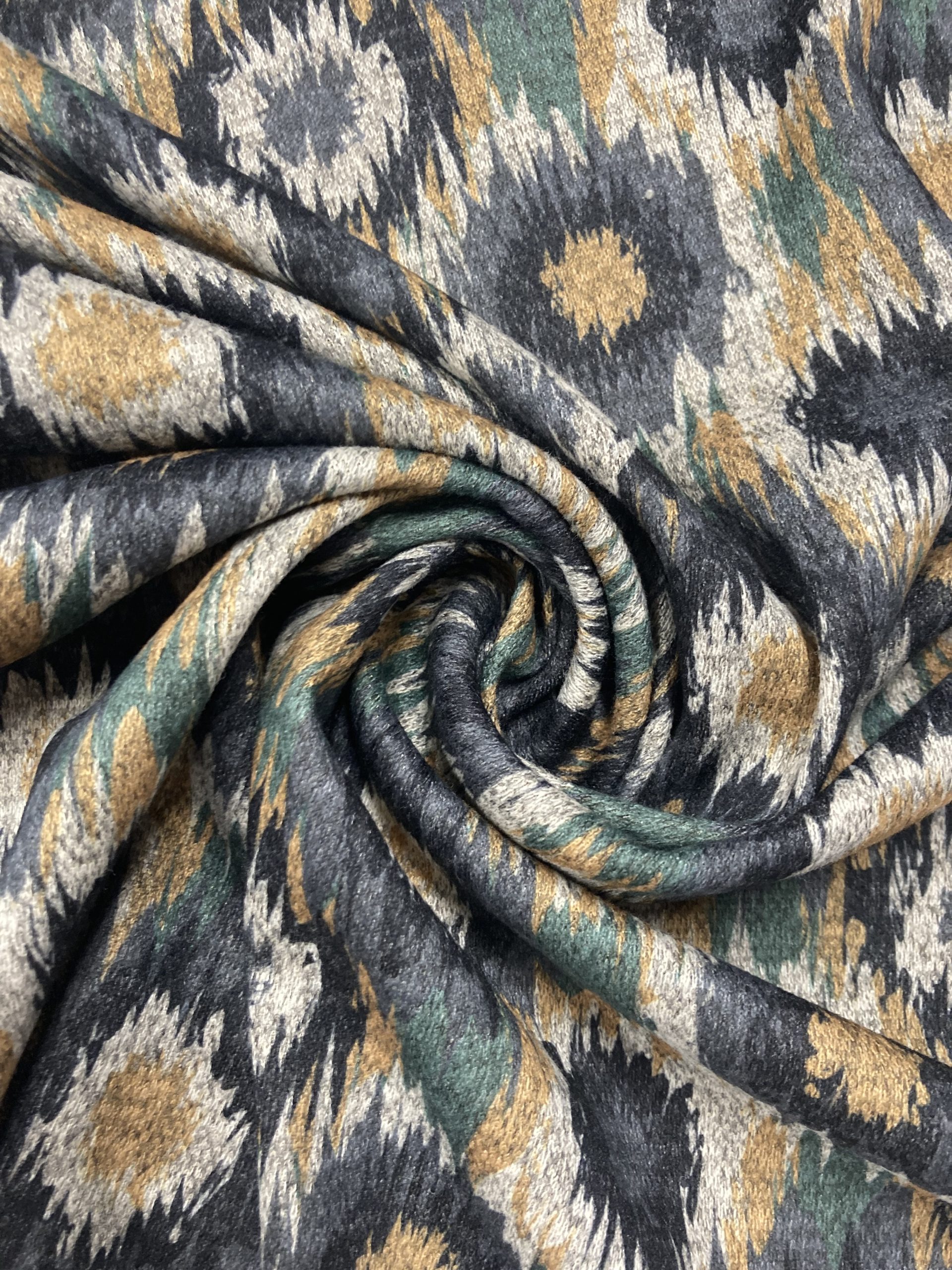 Punto estampado en tonos grises, azules, verde y mostaza Tejido con muy suave, con caída y de textura muy suave y agradable al tacto. Tela ideal para la confección de ropa