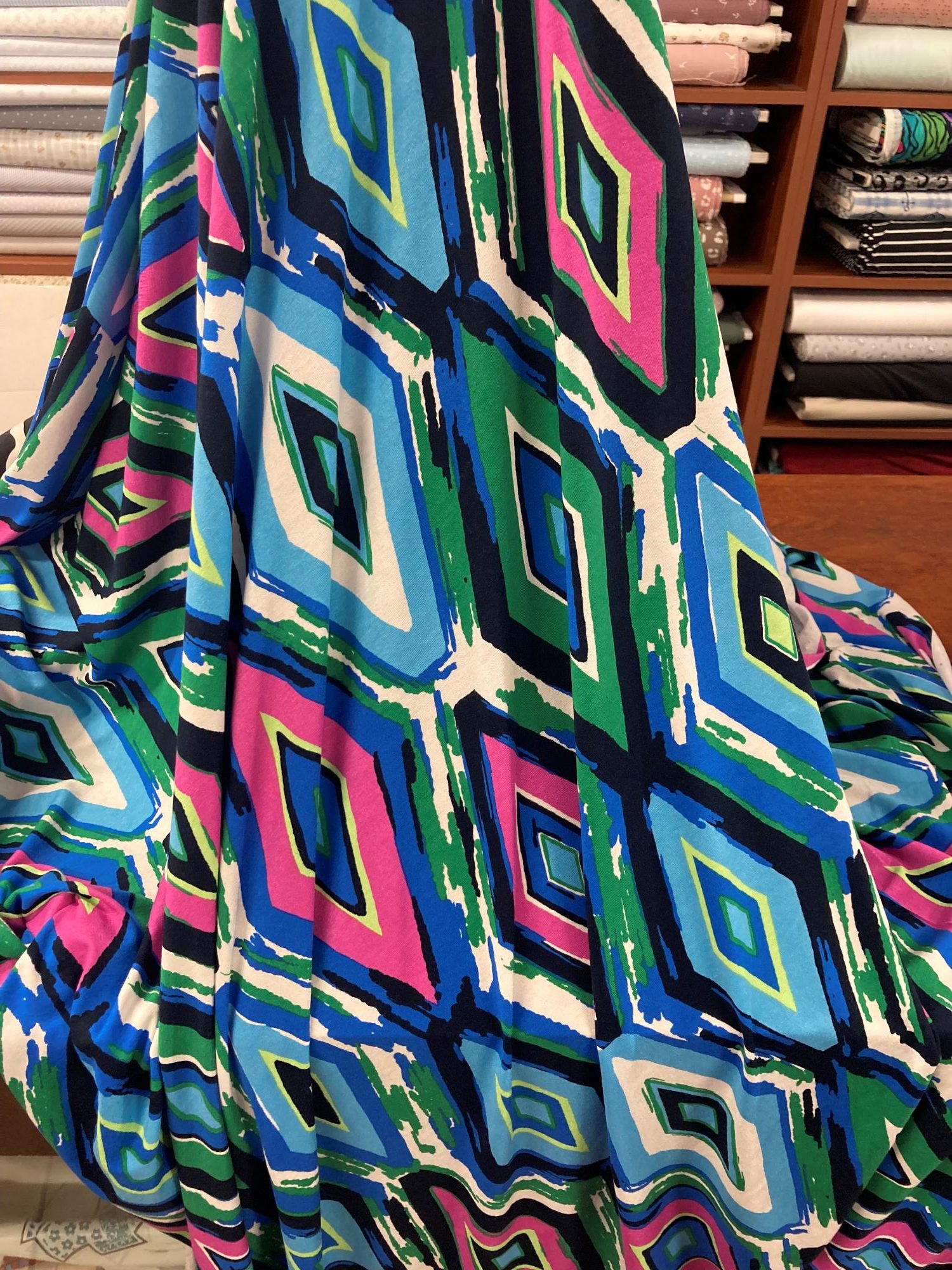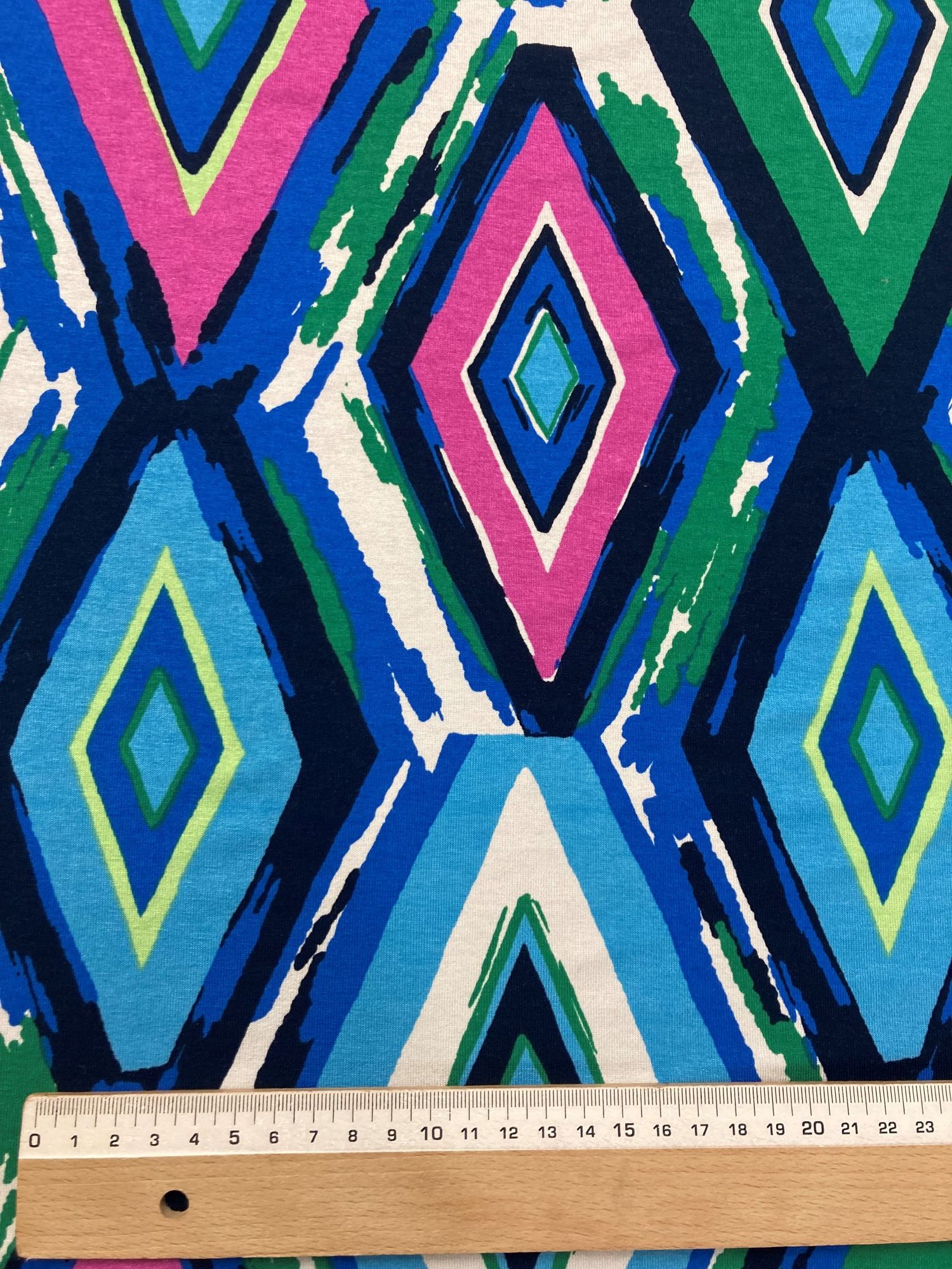 El estampado son rombos en tonos azulón, celeste, fucsia, amarillo, verde...