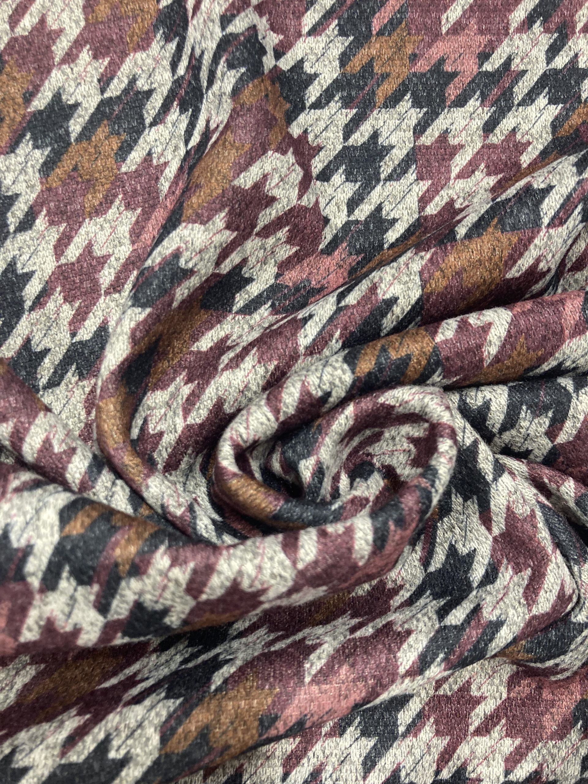 Punto estampado en tonos grises, azules, verde y mostaza Tejido con muy suave, con caída y de textura muy suave y agradable al tacto. Tela ideal para la confección de ropa