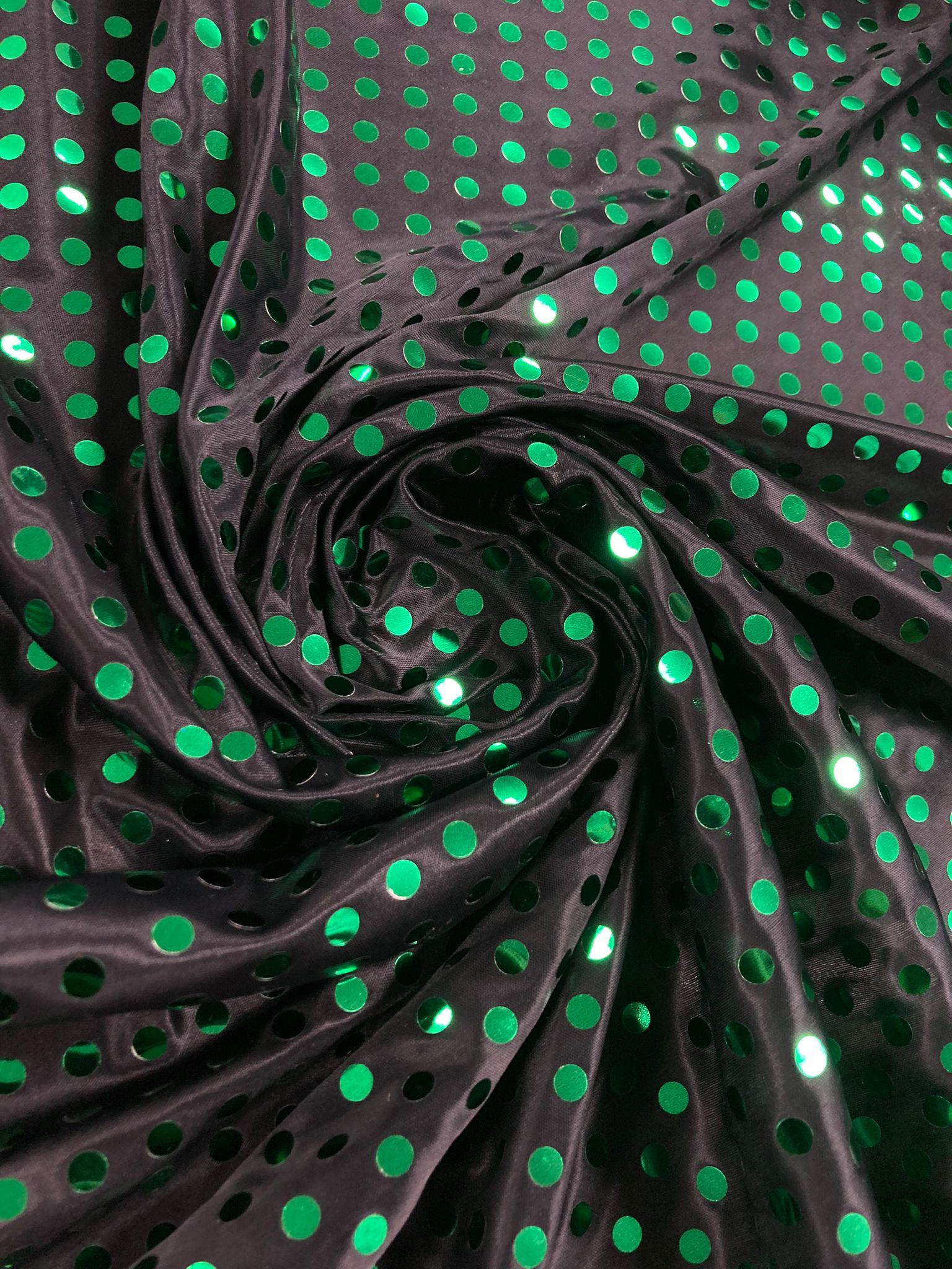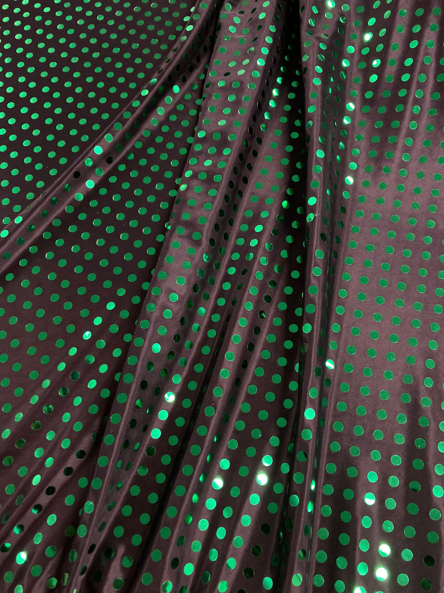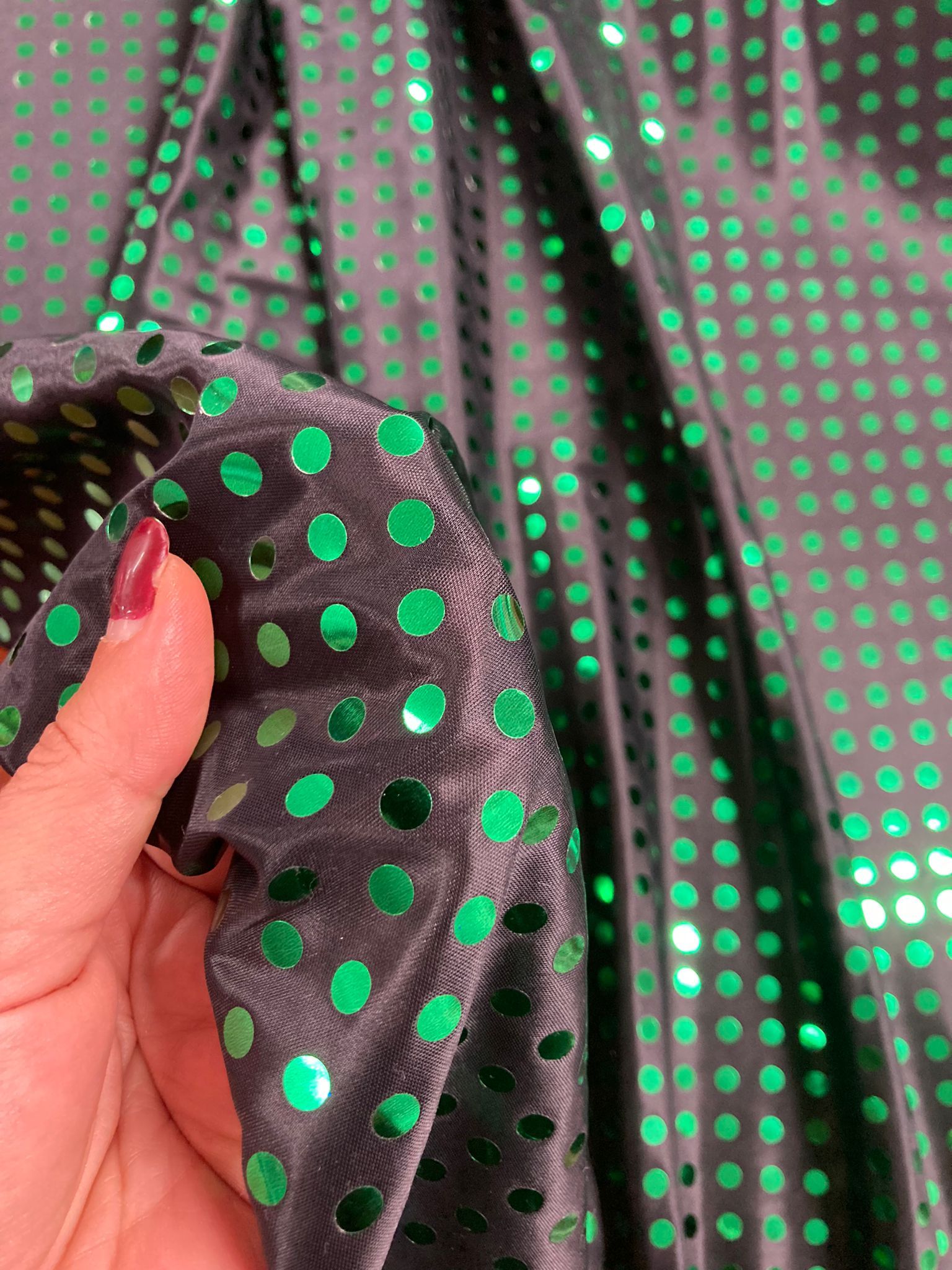 - Tela de punto negro con falsa lentejuela en coor verde. La lentejuela no va cosida, va adherida al tejido.
