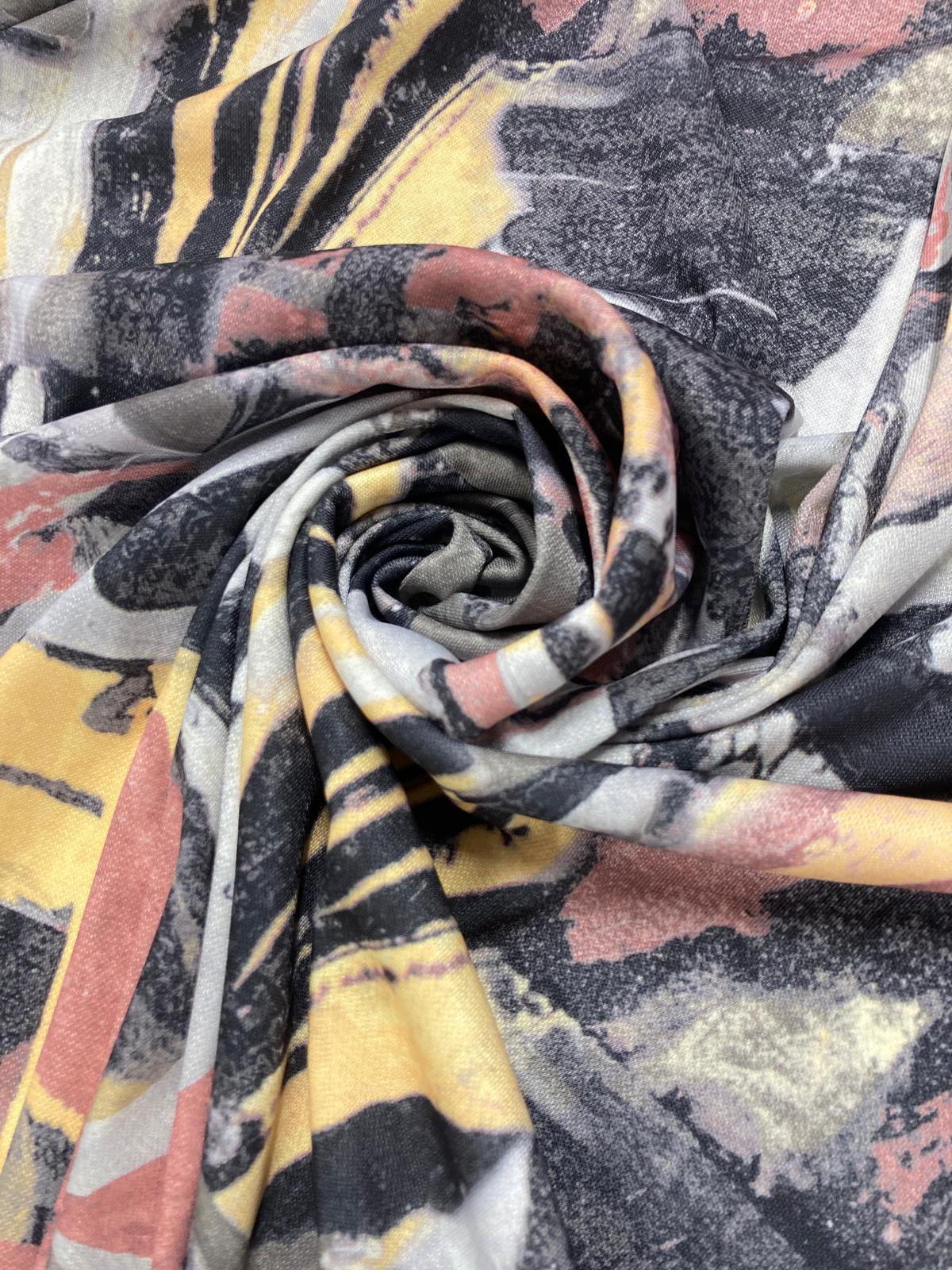 Descripción: esta tela, que casi en su totalidad es de poliéster, es un tejido muy elástico, que no se deforma con su uso y resiste perfectamente al uso y los lavados. Se trata de una tela con mucha caída.