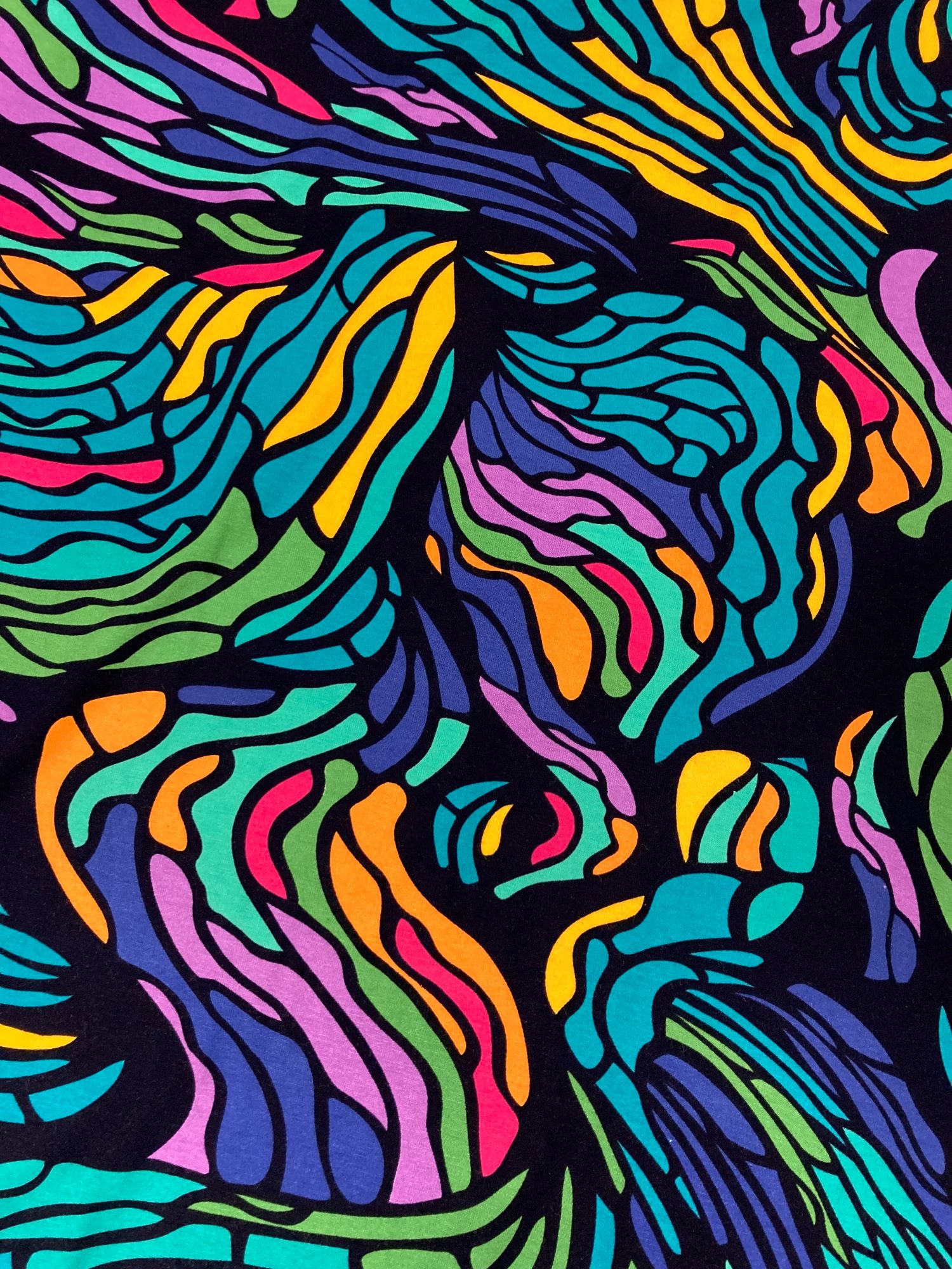 Tela de punto con mucha caída y peso con estampado de colores en tono amarillo, turquesa, fucsia, verde…
