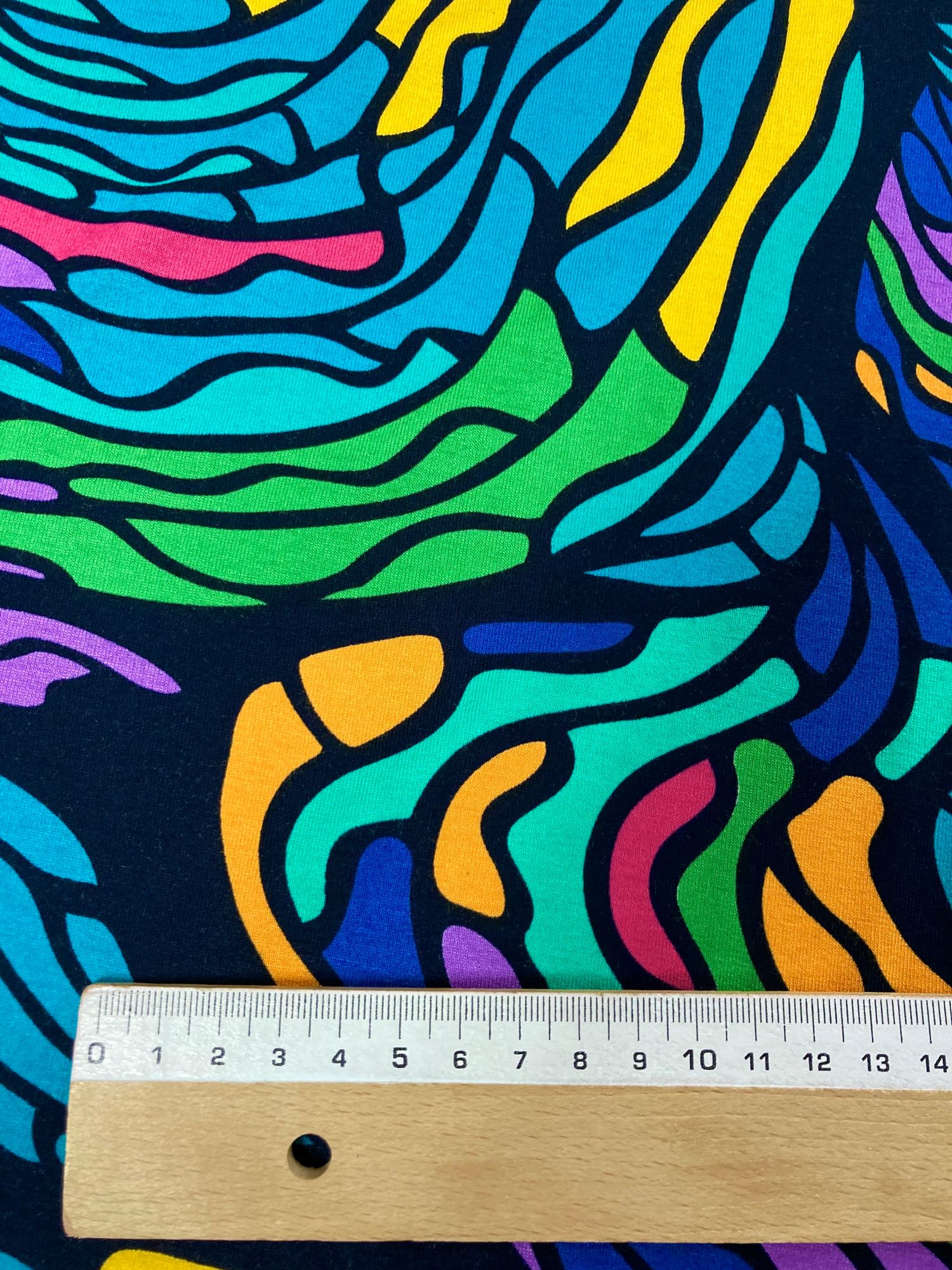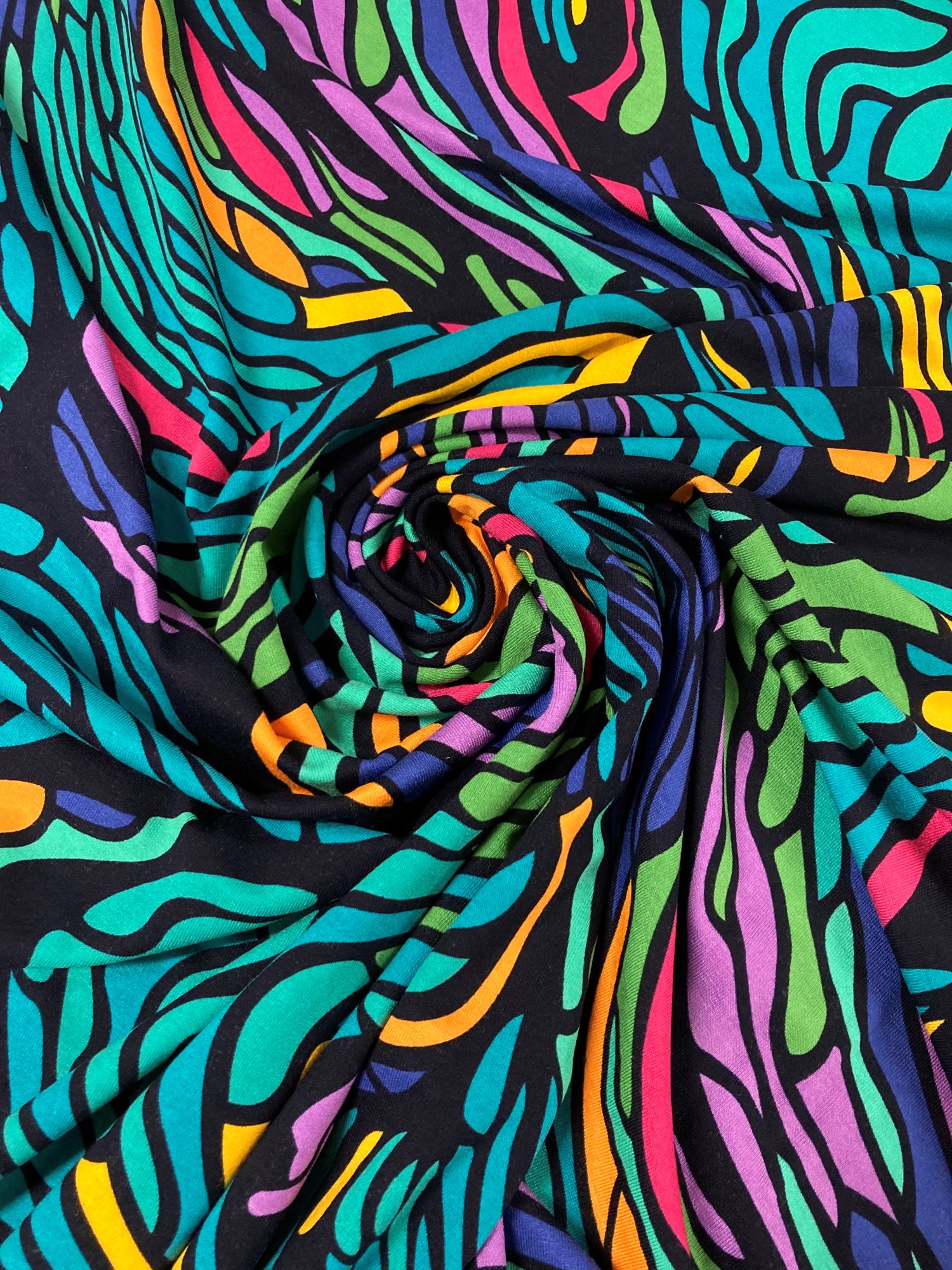 Tela de punto con mucha caída y peso con estampado de colores en tono amarillo, turquesa, fucsia, verde...
