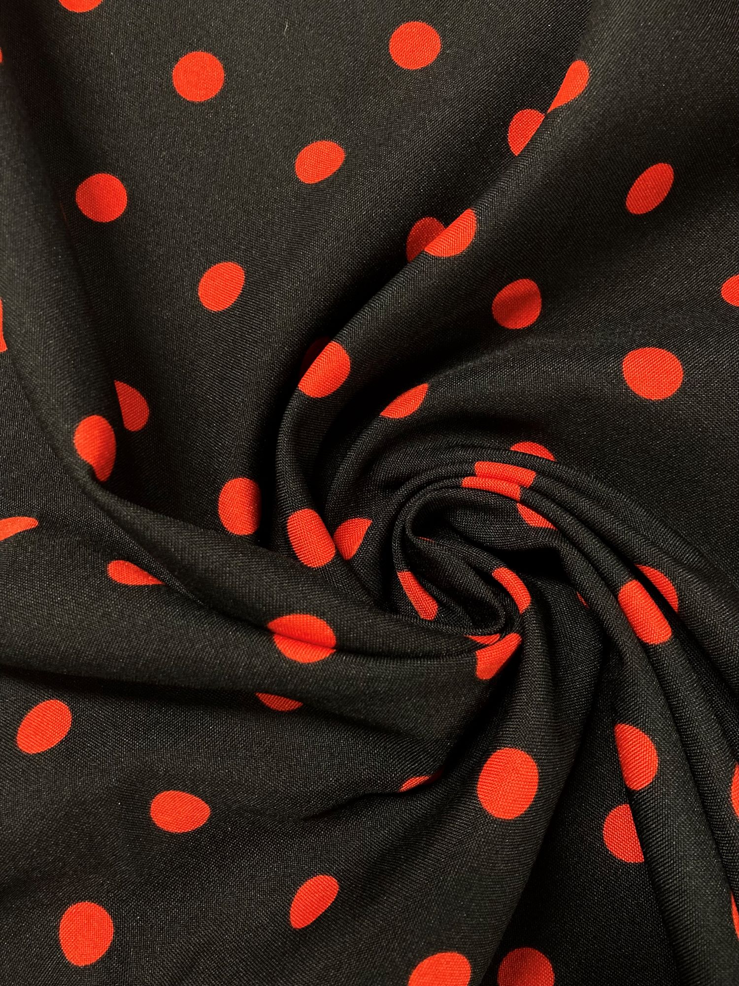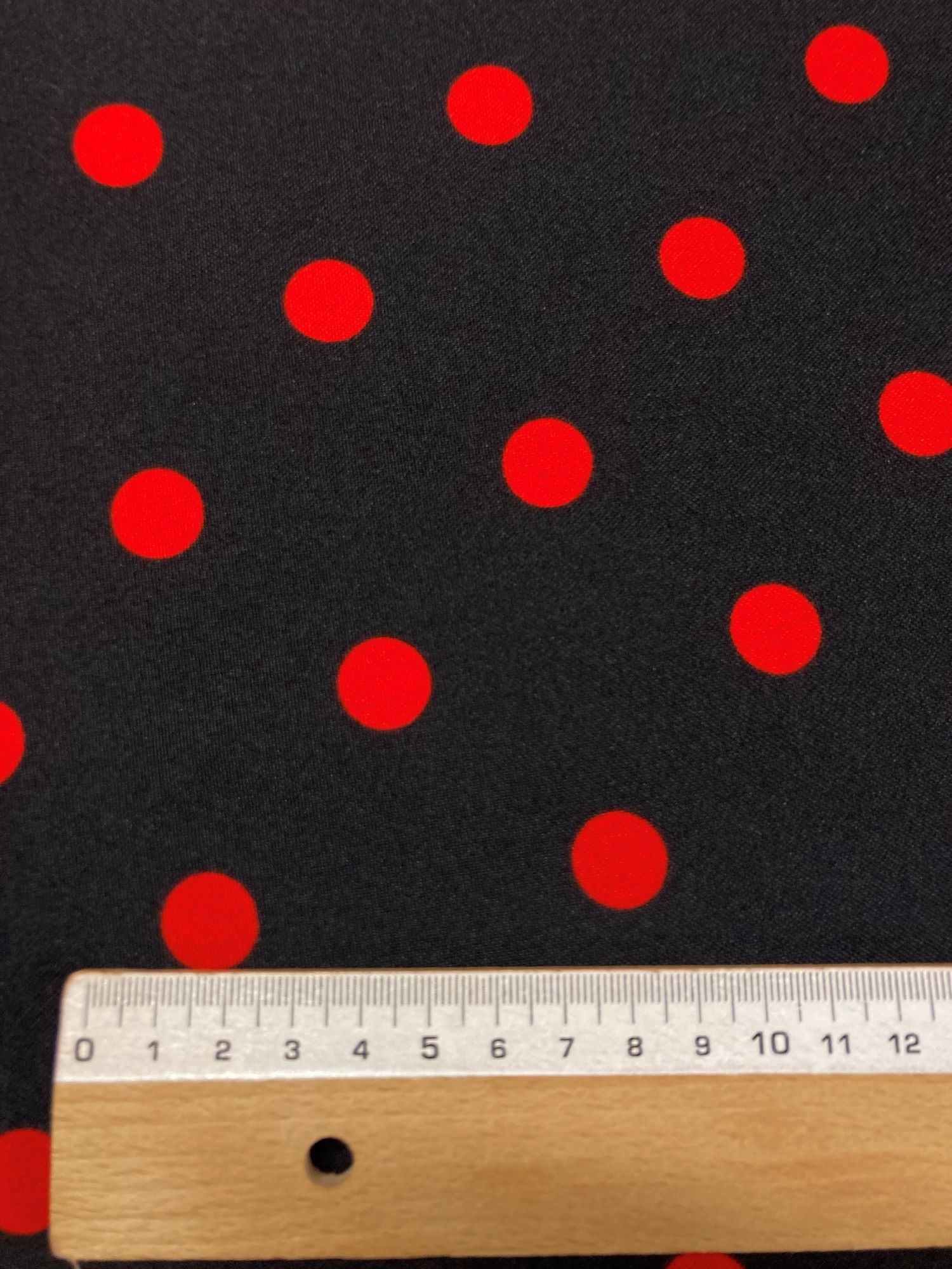 En este caso se trata de un strech negro con lunares rojos de 14 mm de diámetro.