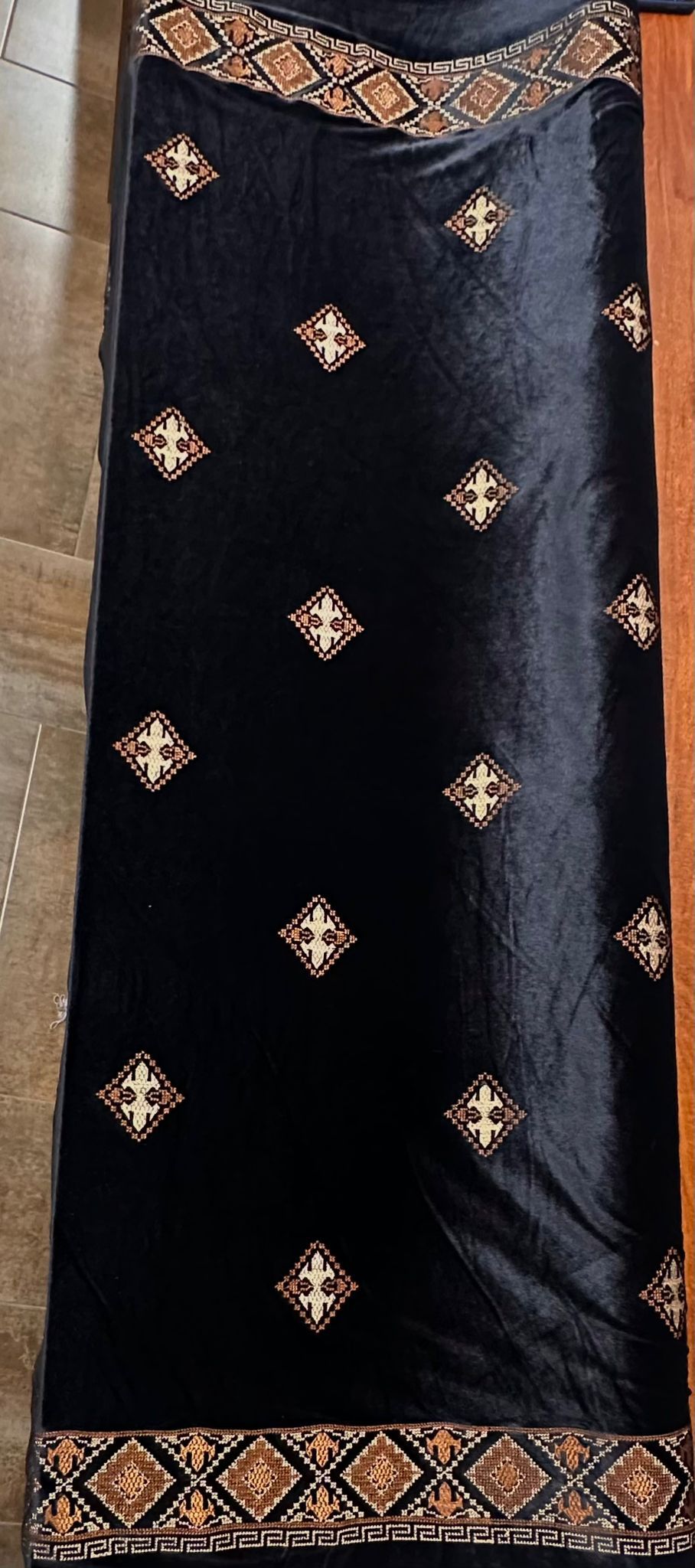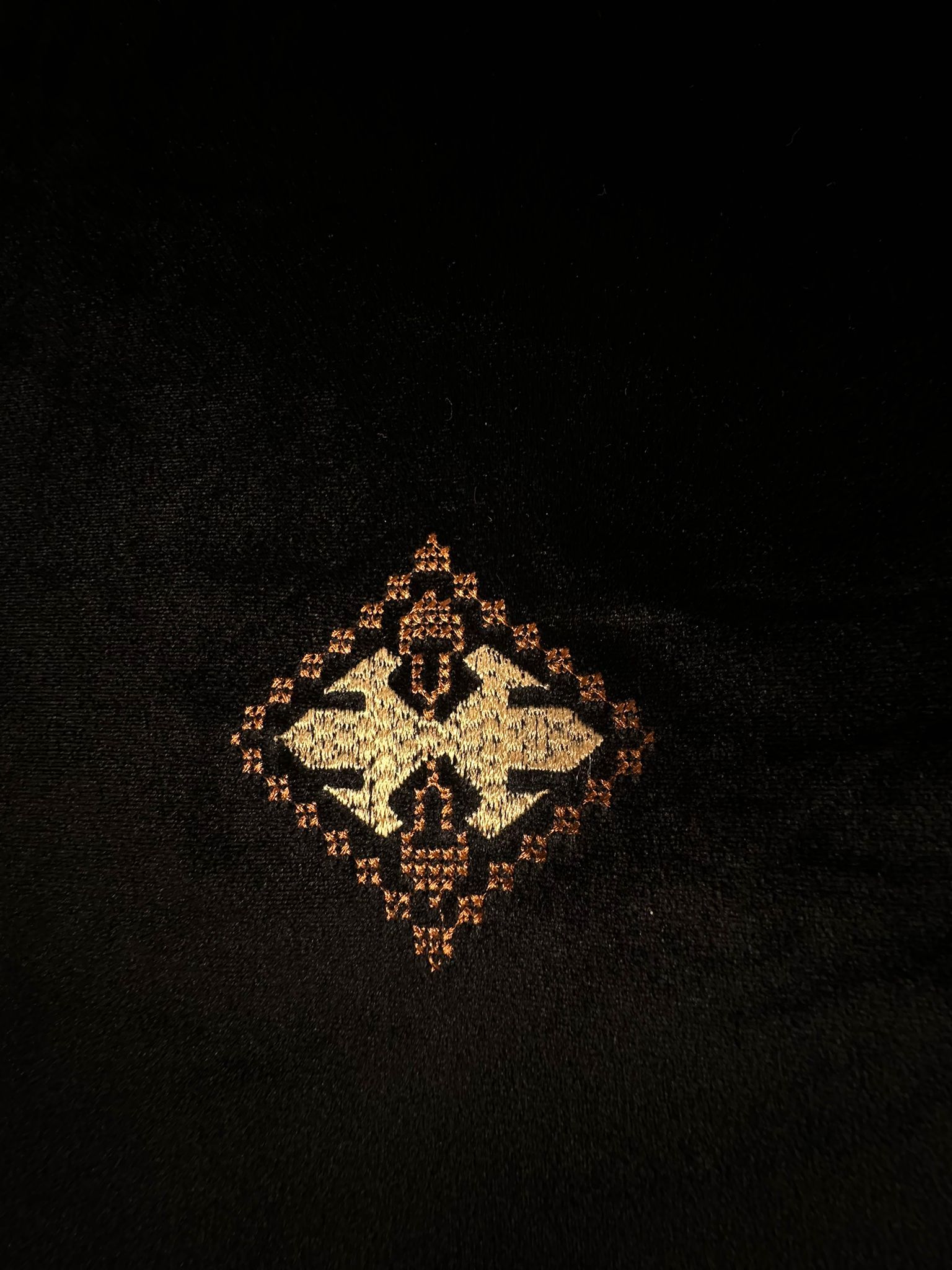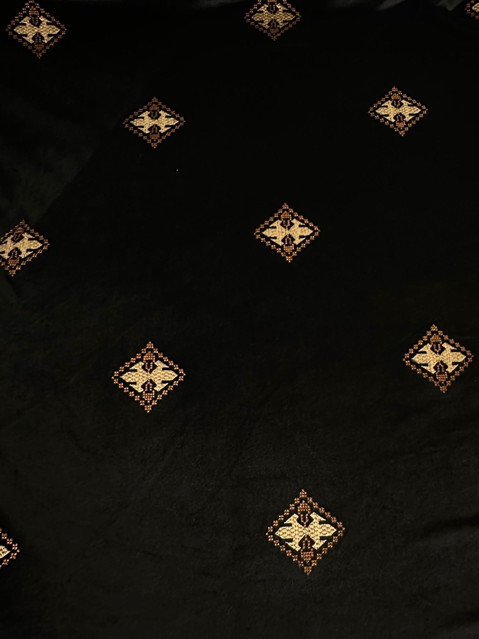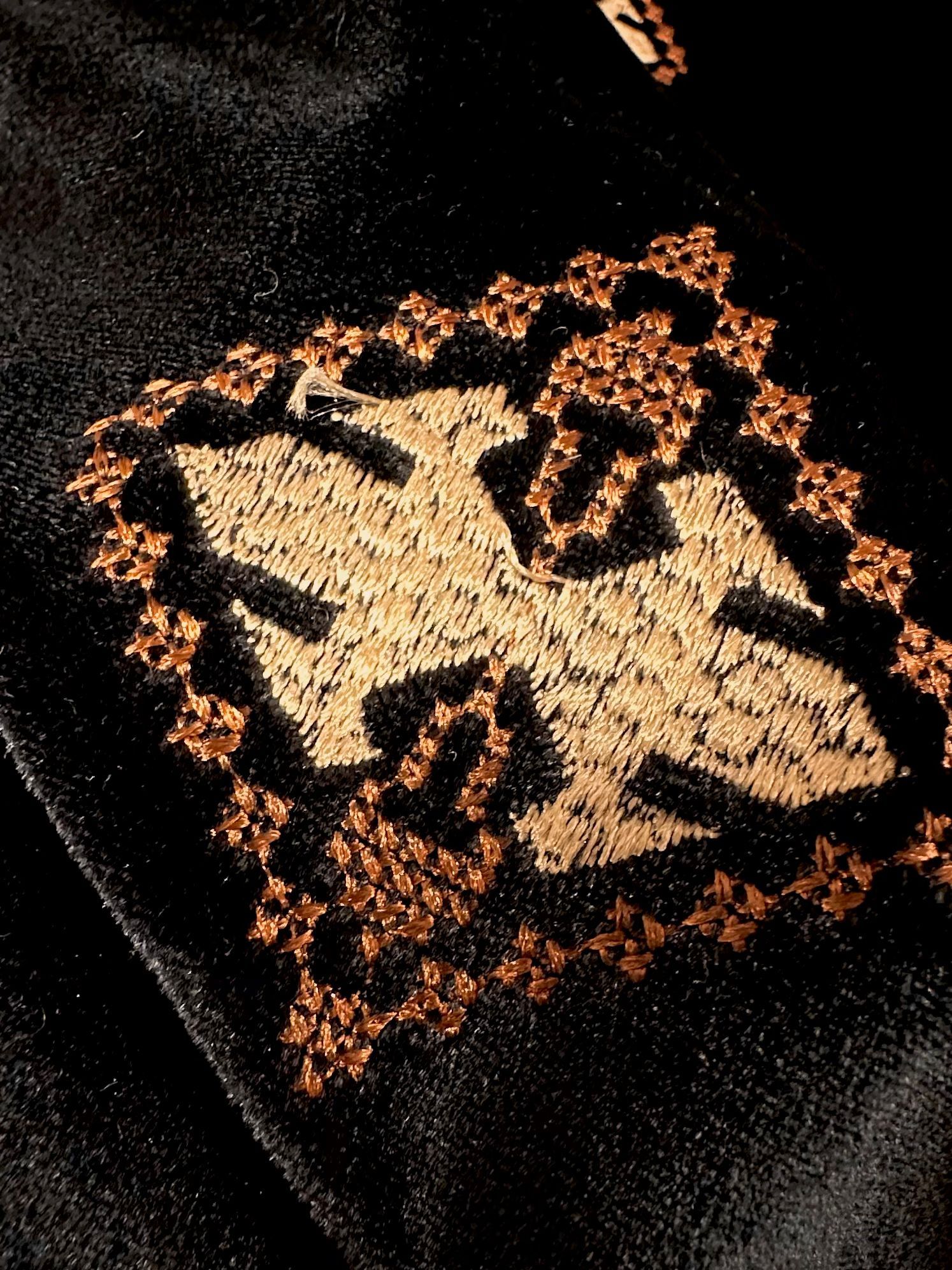 Terciopelo negro con un poco de brillo con bordado en marrón y beig que es más bien dorado claro.